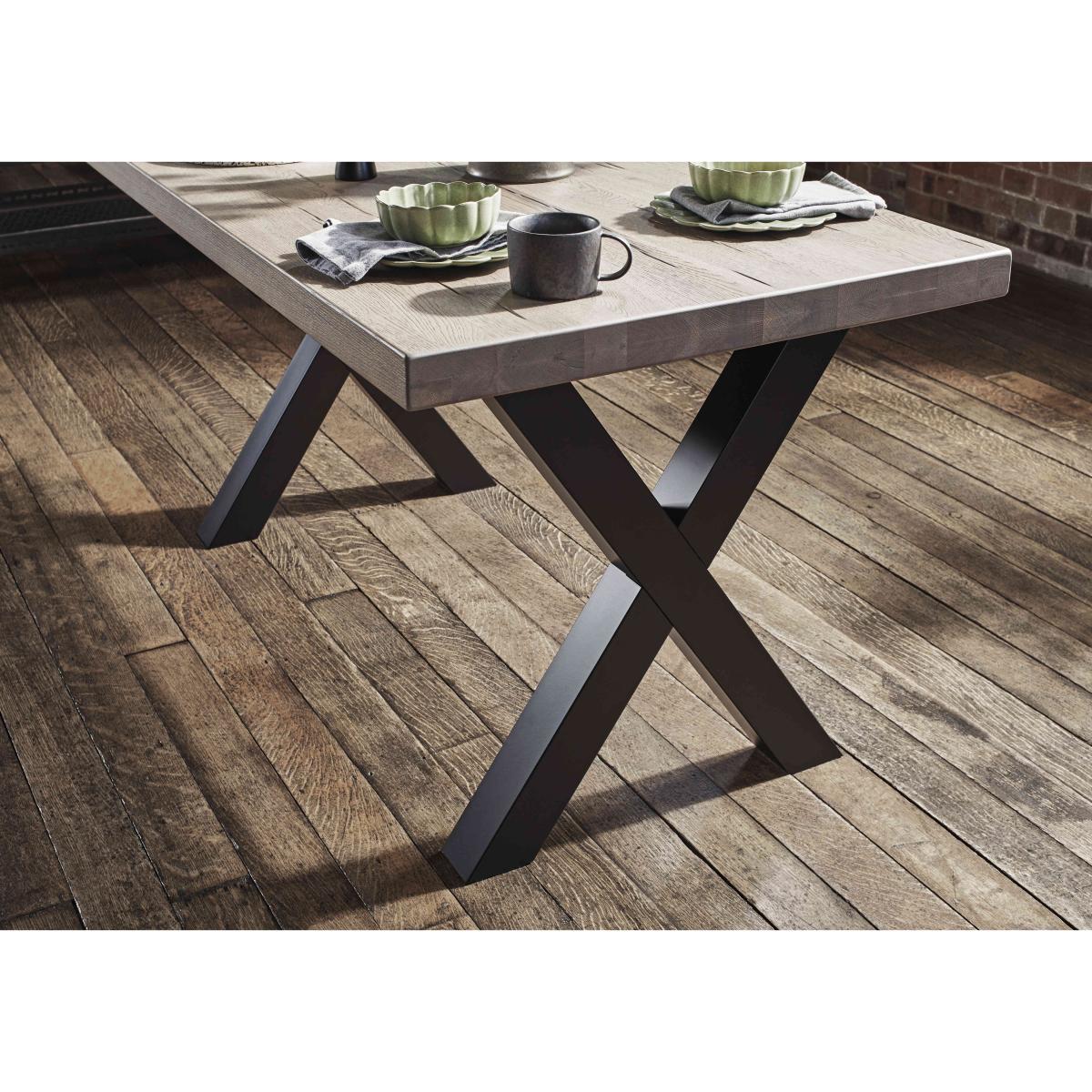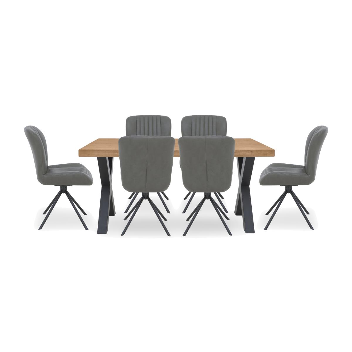 Bring handcrafted industrial style to a smaller dining space with this Bodahl dining set. The solid oak dining table seats eight – and can be extended – and comes with six swivel dining chairs in grey. Why you'll love it Perfect size, perfect style – this industrial dining set is designed for compact spaces. Handcrafted dining table has a solid oak top in a choice of colours and finishes. A protective matt lacquer makes this an enduring piece. Black metal X-shaped legs. This dining set comes with 6 luxuriously cushioned dining chairs. Soft faux leather upholstery in grey. Chairs have swivel bases and black metal legs. The dining table is extendable – extra leaves are available separately. Only at Furniture Village. This dining set is part of the Bodahl Compact Terra collection. What you need to know Dining chairs have metal frames and foam cushioning. Dining table is made of solid oak and metal. 160 x 90 cm dining table seats 6 to 8. Table edge depth is 6 cm. Table can accommodate 2 extension leaves (not included) to seat 4 more people. Oak top may display knots, saw marks and variations in tone and texture. Metal legs are finished by hand and may show marks. Use a clean, damp cloth to clean the oak top.