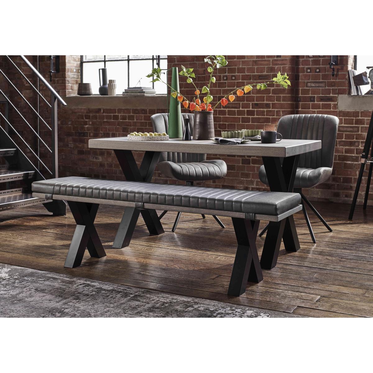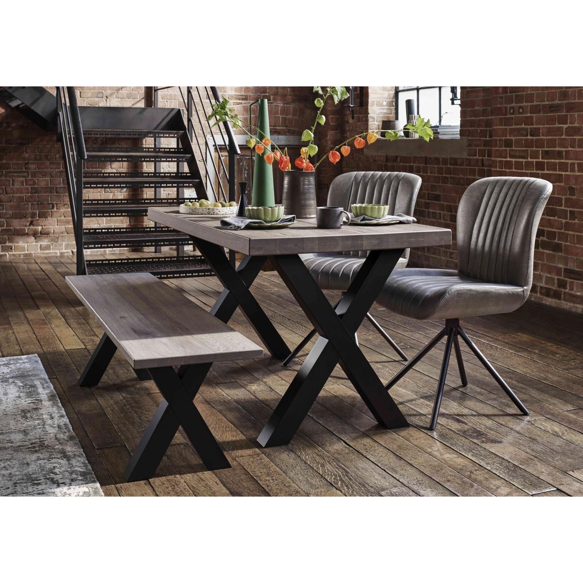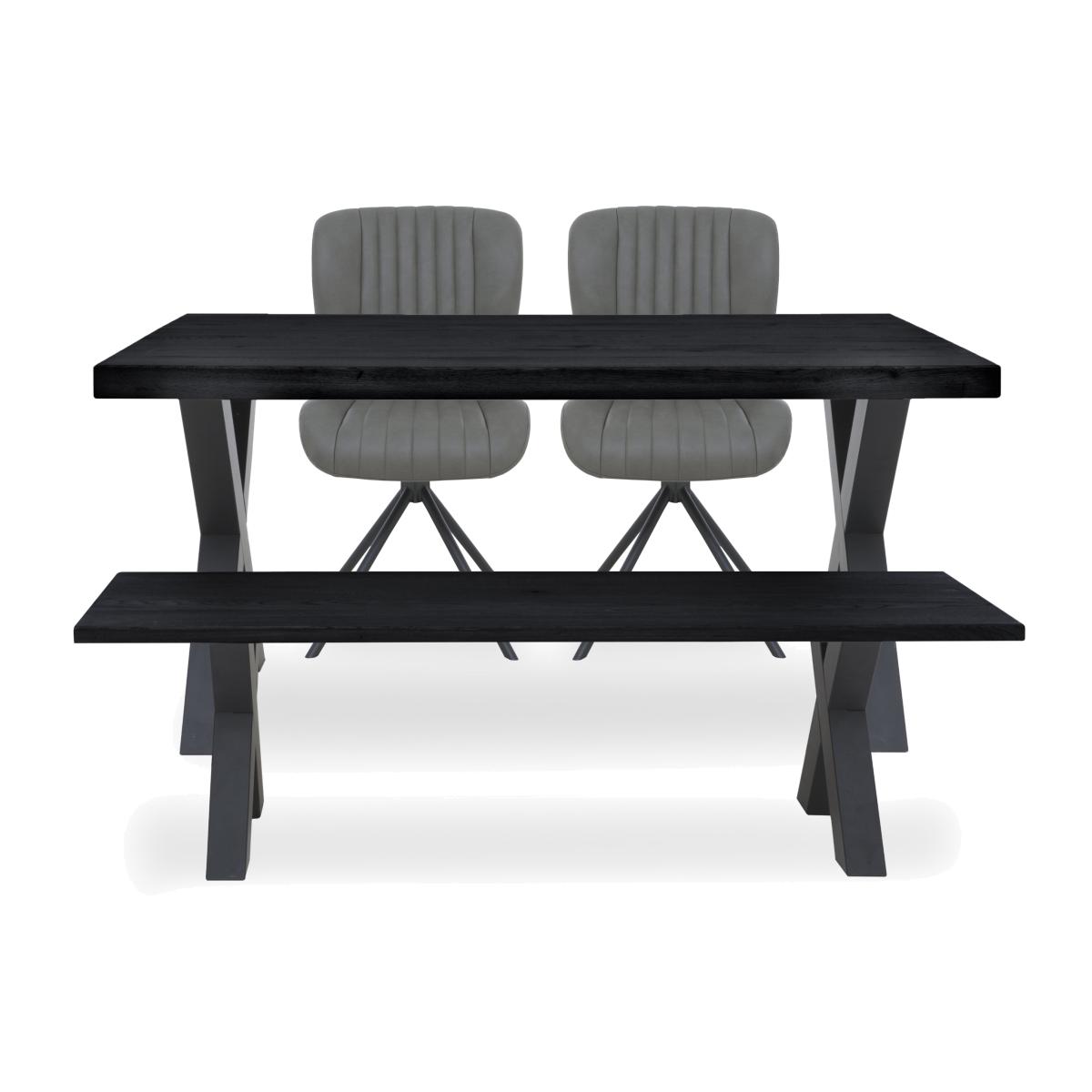 Enjoy on-trend and versatile dining style with this compact Bodahl dining set which includes a beautiful solid oak and metal dining table, dining bench and two swivel dining chairs in grey. Why you'll love it Perfect size, perfect style – this industrial dining set is designed for compact spaces. Handcrafted dining table has a solid oak top in a choice of colours and finishes. A protective matt lacquer makes this an enduring piece. Black metal X-shaped legs. This dining set comes with versatile seating – a bench and 2 dining chairs. Luxuriously cushioned dining chairs have soft faux leather upholstery in grey. Swivel bases and black metal legs. The dining table is extendable – extra leaves are available separately. Only at Furniture Village. This dining set is part of the Bodahl Compact Terra collection. What you need to know Dining chairs have metal frames and foam cushioning. Dining table and bench are made of solid oak and metal. 160 cm dining bench seats 3 adults. 160 x 90 cm dining table seats 6 to 8. Table edge depth is 6 cm. Table can accommodate 2 extension leaves (not included) to seat 4 more people. Oak top may display knots, saw marks and variations in tone and texture. Metal legs are finished by hand and may show marks. Use a clean, damp cloth to clean the oak top.