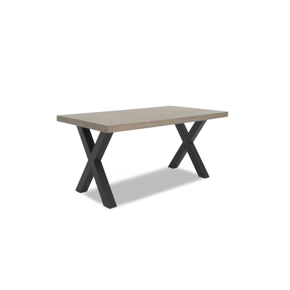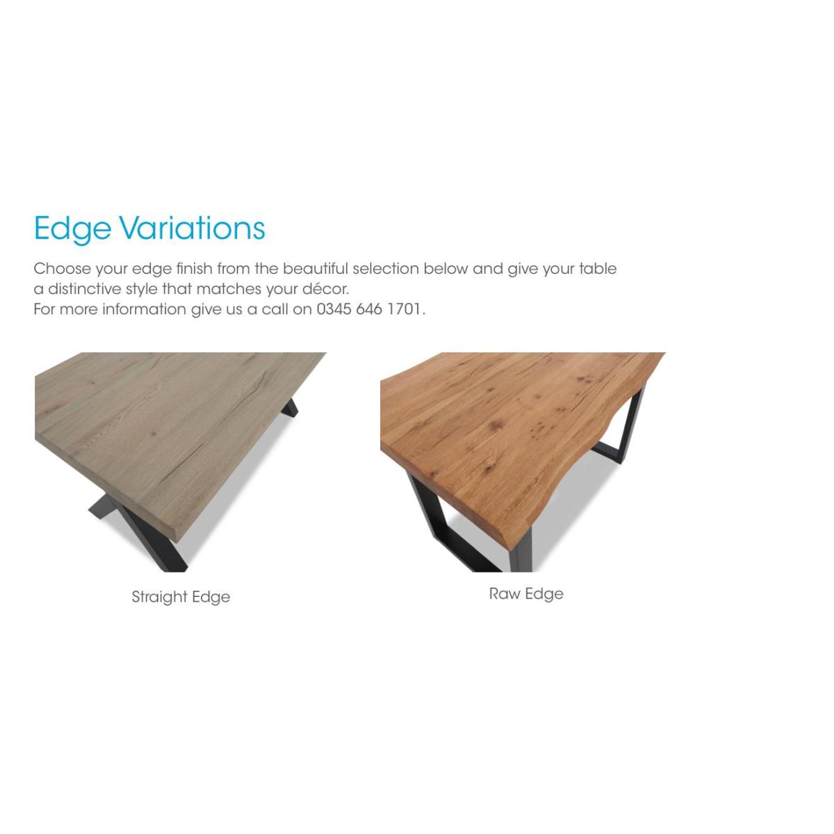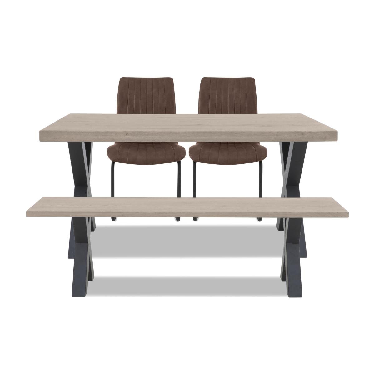 The Terra range combines the warmth of rustic style with the urban edge of industrial design – and it does it beautifully. Expertly handcrafted from solid natural oak, every piece boasts impeccable craftsmanship with knots and markings on full display. Its distinctive black metal legs and natural warmth make this a statement range for design-led interiors and relaxed dining spaces alike. And with a handcrafted padded bench or soft, faux leather cantilevered chairs, there’s plenty of comfy perches to choose from. Simply sit back, tuck in and enjoy your meal in comfort. The Terra range is fully bespoke with a wide range of options for table top edges, thickness, size and colour, alongside several striking leg options. Create your unique design today. Here’s the perfect industrial dining set for a smaller dining room. With both bench and dining chair seating, it’s as versatile as it is stylish. Why you'll love it This family-friendly industrial dining set is designed for smaller spaces. At last – a compact version of our popular Bodahl Terra range. Handcrafted 100% solid oak table top in a choice of colours and finishes. A protective matt lacquer makes this an enduring piece. Black metal X-shaped legs. This dining set comes with very versatile seating – a dining bench and 2 dining chairs. Oak dining bench has your choice of X-shaped or U-shaped metal legs. The 2 dining chairs have fluted faux leather upholstery in a rich cognac colour. Black metal cantilever bases. The dining table is extendable – extra leaves are available separately. Only at Furniture Village. This dining set is part of the Bodahl Compact Terra collection. What you need to know Dining chairs have metal bases and foam cushioning. Table and bench are made of solid oak and metal. 160 cm dining bench seats 3 adults. 160 x 90 cm dining table seats 6 to 8. Table edge depth is 6 cm. Table can accommodate 2 extension leaves (not included) to seat 4 more people. Table and bench oak top may display knots, saw marks and variations in tone and texture. Metal legs are finished by hand and may show marks. Use a clean, damp cloth to clean the oak top.