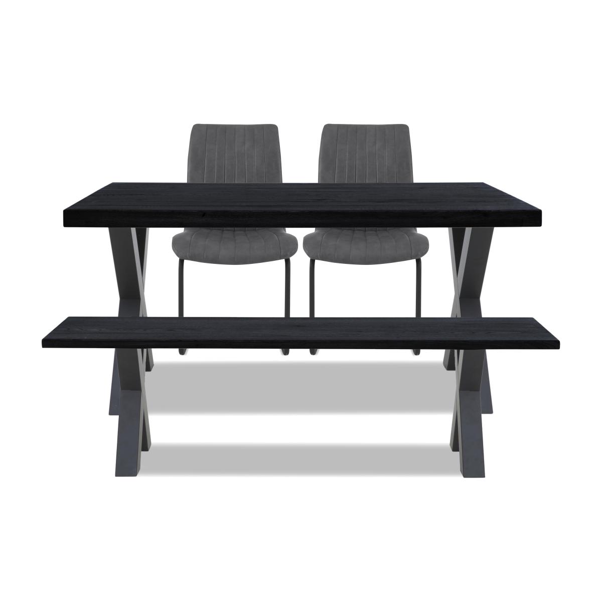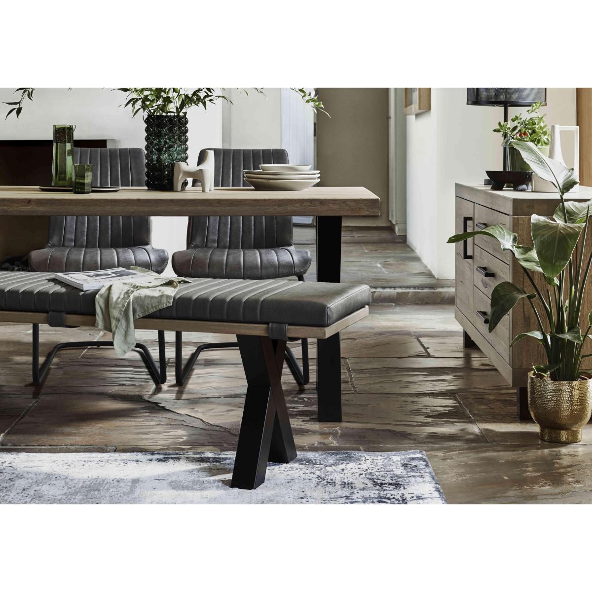 The Terra range combines the warmth of rustic style with the urban edge of industrial design – and it does it beautifully. Expertly handcrafted from solid natural oak, every piece boasts impeccable craftsmanship with knots and markings on full display. Its distinctive black metal legs and natural warmth make this a statement range for design-led interiors and relaxed dining spaces alike. And with a handcrafted padded bench or soft, faux leather cantilevered chairs, there’s plenty of comfy perches to choose from. Simply sit back, tuck in and enjoy your meal in comfort. The Terra range is fully bespoke with a wide range of options for table top edges, thickness, size and colour, alongside several striking leg options. Create your unique design today. With bench and dining chair seating, this compact industrial dining set by Bodahl is as versatile as it is stylish. Why you'll love it Enjoy industrial style that’s made for smaller dining spaces with this dining set. At last – a compact version of our popular Bodahl Terra range. Handcrafted 100% solid oak table top in a choice of colours and finishes. A protective matt lacquer makes this an enduring piece. Black metal X-shaped legs. This dining set comes with very versatile seating – a dining bench and 2 dining chairs. Oak dining bench has your choice of X-shaped or U-shaped metal legs. The 2 dining chairs have fluted faux leather upholstery in on-trend grey. Black metal cantilever bases. The dining table is extendable – extra leaves are available separately. Only at Furniture Village. This dining set is part of the Bodahl Compact Terra collection. What you need to know Dining chairs have metal bases and foam cushioning. Table and bench are made of solid oak and metal. 160 cm dining bench seats 3 adults. 160 x 90 cm dining table seats 6 to 8. Table edge depth is 6 cm. Table can accommodate 2 extension leaves (not included) to seat 4 more people. Table and bench oak top may display knots, saw marks and variations in tone and texture. Metal legs are finished by hand and may show marks. Use a clean, damp cloth to clean the oak top.