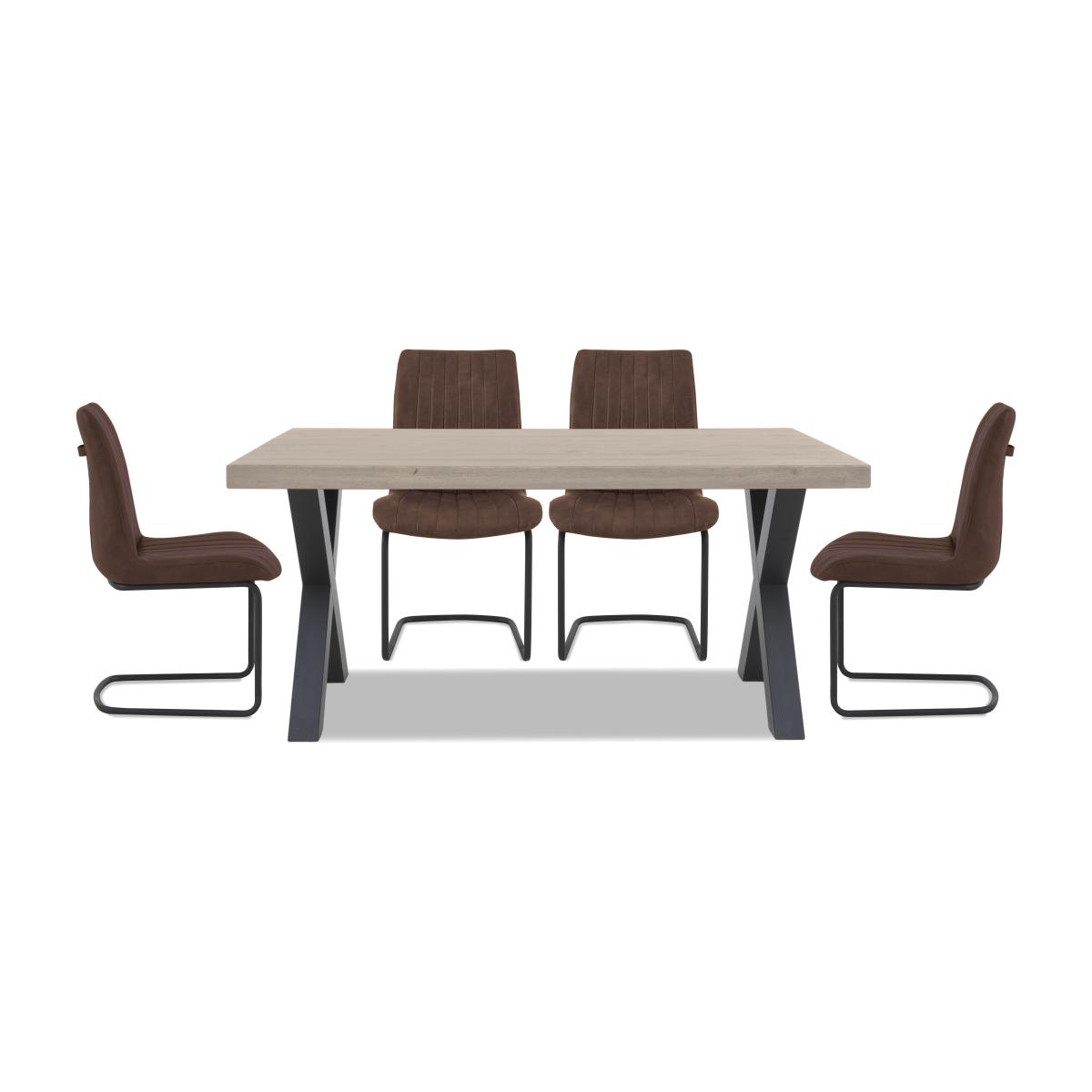The Terra range combines the warmth of rustic style with the urban edge of industrial design – and it does it beautifully. Expertly handcrafted from solid natural oak, every piece boasts impeccable craftsmanship with knots and markings on full display. Its distinctive black metal legs and natural warmth make this a statement range for design-led interiors and relaxed dining spaces alike. And with a handcrafted padded bench or soft, faux leather cantilevered chairs, there’s plenty of comfy perches to choose from. Simply sit back, tuck in and enjoy your meal in comfort. The Terra range is fully bespoke with a wide range of options for table top edges, thickness, size and colour, alongside several striking leg options. Create your unique design today. Whatever the style of your dining space, this compact industrial dining set will look fabulous. The solid oak-topped table comes in a choice of finishes and is paired with four stylish dining chairs in cognac. Why you'll love it Perfect size, perfect style – modern industrial dining set with 4 on-trend chairs. At last – a compact version of our popular Bodahl Terra range. Handcrafted 100% solid oak table top in a choice of colours and finishes. A protective matt lacquer makes this an enduring piece. Black metal X-shaped legs. 4 dining chairs with fluted faux leather upholstery in a rich cognac colour. Black metal cantilever bases. The dining table is extendable – extra leaves are available separately. Only at Furniture Village. This dining set is part of the Bodahl Compact Terra collection. What you need to know Dining chairs have metal bases and foam cushioning. Table and bench are made of solid oak and metal. 160 x 90 cm dining table seats 6 to 8. Table edge depth is 6 cm. Table can accommodate 2 extension leaves (not included) to seat 4 more people. Oak top may display knots, saw marks and variations in tone and texture. Metal legs are finished by hand and may show marks. Use a clean, damp cloth to clean the oak top.