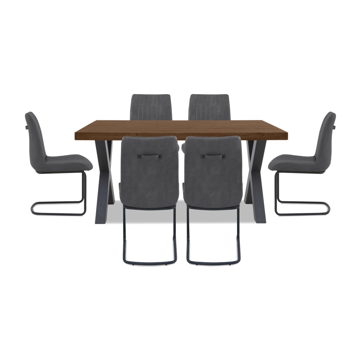The Terra range combines the warmth of rustic style with the urban edge of industrial design – and it does it beautifully. Expertly handcrafted from solid natural oak, every piece boasts impeccable craftsmanship with knots and markings on full display. Its distinctive black metal legs and natural warmth make this a statement range for design-led interiors and relaxed dining spaces alike. And with a handcrafted padded bench or soft, faux leather cantilevered chairs, there’s plenty of comfy perches to choose from. Simply sit back, tuck in and enjoy your meal in comfort. The Terra range is fully bespoke with a wide range of options for table top edges, thickness, size and colour, alongside several striking leg options. Create your unique design today. Designed for smaller dining spaces, this compact industrial dining set nevertheless has room for the whole family thanks to its six grey-upholstered dining chairs. By Bodahl for Furniture Village. Why you'll love it This inviting compact industrial dining set includes 6 dining chairs. At last – a compact version of our popular Bodahl Terra range. Handcrafted 100% solid oak table top in a choice of colours and finishes. A protective matt lacquer makes this an enduring piece. Black metal X-shaped legs. 6 dining chairs with fluted faux leather upholstery in on-trend grey. Black metal cantilever bases. The dining table is extendable – extra leaves are available separately. Only at Furniture Village. This dining set is part of the Bodahl Compact Terra collection. What you need to know Dining chairs have metal bases and foam cushioning. 160 x 90 cm dining table seats 6 to 8. Table edge depth is 6 cm. Table can accommodate 2 extension leaves (not included) to seat 4 more people. Oak top may display knots, saw marks and variations in tone and texture. Metal legs are finished by hand and may show marks. Use a clean, damp cloth to clean the oak top.