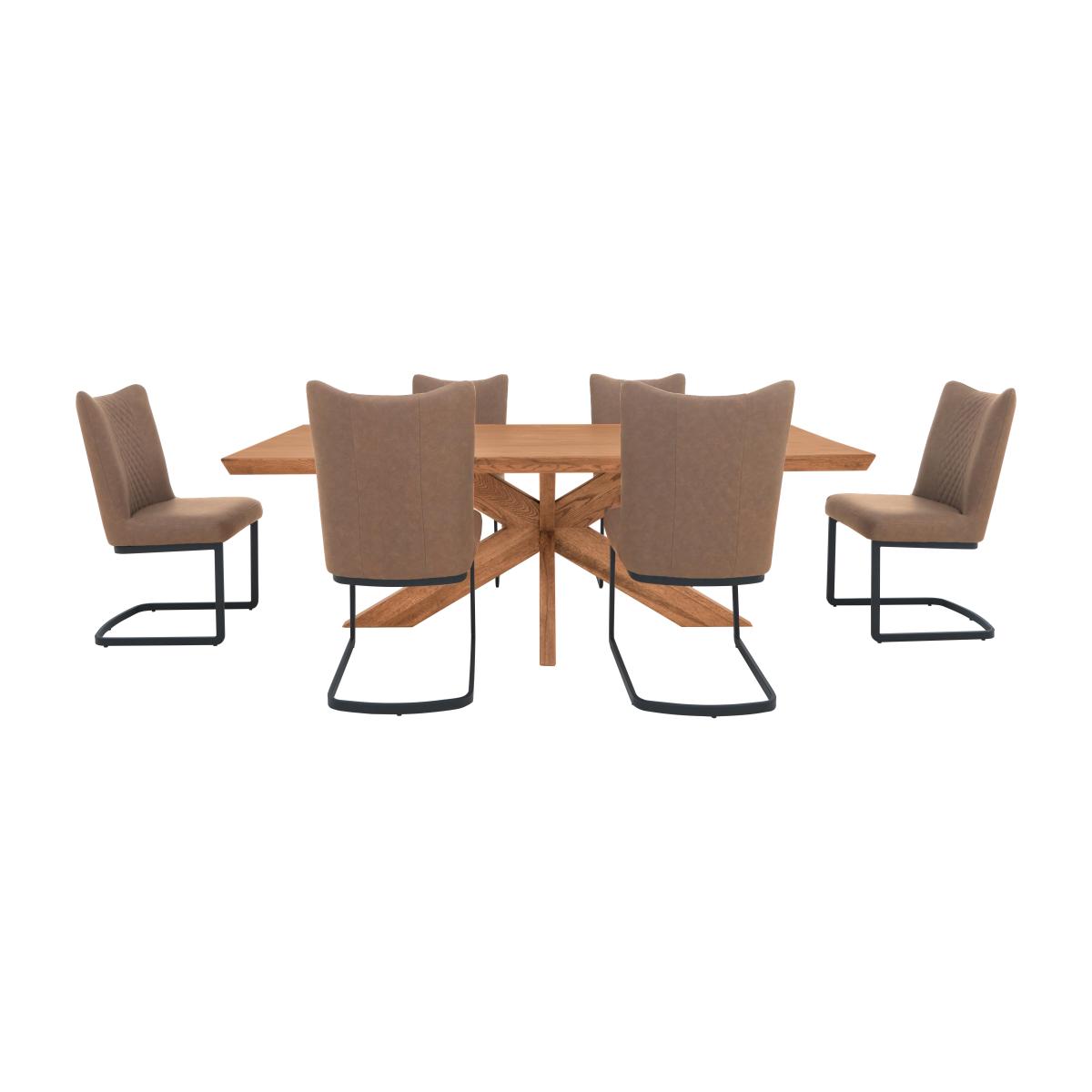 Striking industrial style meets the warmth and familiarity of rustic oak in the Bodahl Loki range, exclusively available at Furniture Village. At the heart of this beautiful collection is a handcrafted solid oak dining table set on a star-shaped base. It’s offered in seven sizes and eight finishes, and with even more customisable options available it’s easy to create the perfect dining table for your home and family. Pair it with the range’s faux leather cantilever dining chairs and dining bench – or make life even easier by choosing one of the ready-made dining sets – and complete the look with a stylish sideboard. It’s the combination of solid rustic oak dining table and urban-cool cantilever dining chairs that make this dining set so irresistible – and so perfect for all kinds of dining spaces. Why you'll love it. Dining set showcases traditional rustic style updated for contemporary dining spaces. Inviting solid oak dining table with striking star-shaped base. Slanted table top edge adds a touch of elegance. Handcrafted from high-quality solid European oak. Finished with a protective, woodgrain-enhancing matt lacquer. In 8 beautiful wood colour finishes. This dining set includes 6 cantilever dining chairs. In brown faux leather with quilted-effect stitching on inner and outer seat backs. Exclusively available at Furniture Village. This dining set is part of the Bodahl Loki range. What you need to know. Dining chair cantilever bases are made of metal with a black finish. Seat cushioning is foam. Dining table seats 8. Dining table can accommodate up to 2 extension leaves, available separately. The dining table features unique and natural marks, knots and colour variation. Saw cuts are an intentional feature and will vary in frequency and location from table to table. Please be aware that this dining table is extremely heavy. We recommend using coasters and placemats at all times. Easy to care for – simply wipe with a clean, non-abrasive damp cloth.