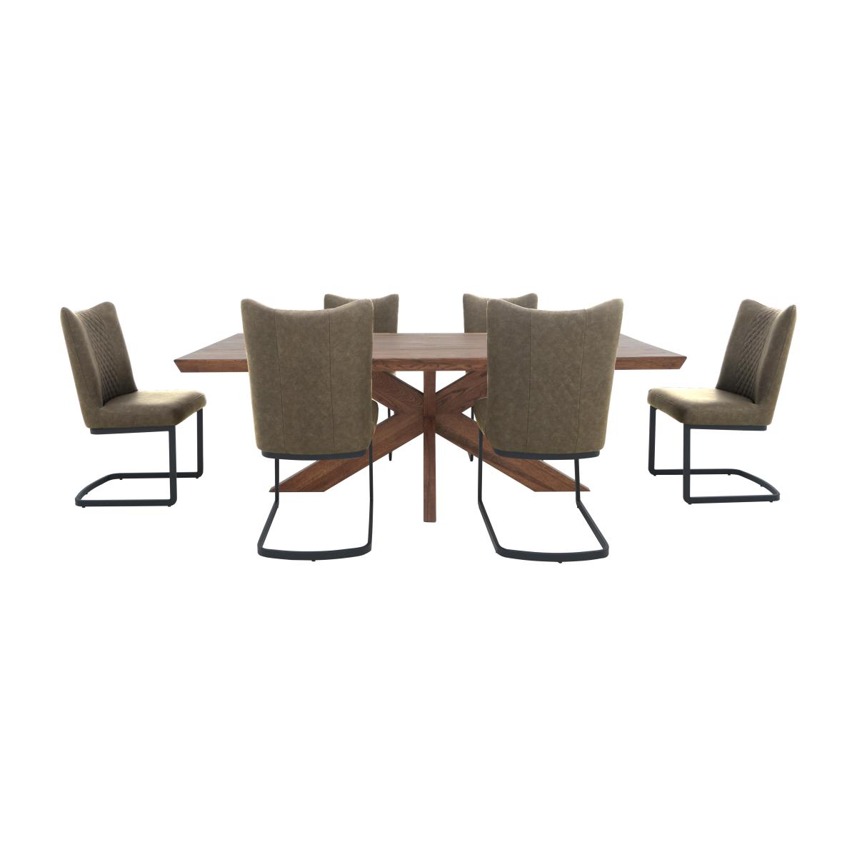 Striking industrial style meets the warmth and familiarity of rustic oak in the Bodahl Loki range, exclusively available at Furniture Village. At the heart of this beautiful collection is a handcrafted solid oak dining table set on a star-shaped base. It’s offered in seven sizes and eight finishes, and with even more customisable options available it’s easy to create the perfect dining table for your home and family. Pair it with the range’s faux leather cantilever dining chairs and dining bench – or make life even easier by choosing one of the ready-made dining sets – and complete the look with a stylish sideboard. We’ve paired this solid rustic oak dining table with six olive green faux leather chairs and we’re very pleased with the result. Modern industrial style that’s just so inviting. Why you'll love it Dining set showcases traditional rustic style updated for contemporary dining spaces. Inviting solid oak dining table with striking star-shaped base. Slanted table top edge adds a touch of elegance. Handcrafted from high-quality solid European oak. Finished with a protective, woodgrain-enhancing matt lacquer. In 8 beautiful wood colour finishes. This dining set includes 6 cantilever dining chairs. In olive green faux leather with quilted-effect stitching on inner and outer seat backs. Exclusively available at Furniture Village. This dining set is part of the Bodahl Loki range. What you need to know Dining chair cantilever bases are made of metal with a black finish. Seat cushioning is foam. Dining table seats 8. Dining table can accommodate up to 2 extension leaves, available separately. The dining table features unique and natural marks, knots and colour variation. Saw cuts are an intentional feature and will vary in frequency and location from table to table. Please be aware that this dining table is extremely heavy. We recommend using coasters and placemats at all times. Easy to care for – simply wipe with a clean, non-abrasive damp cloth.