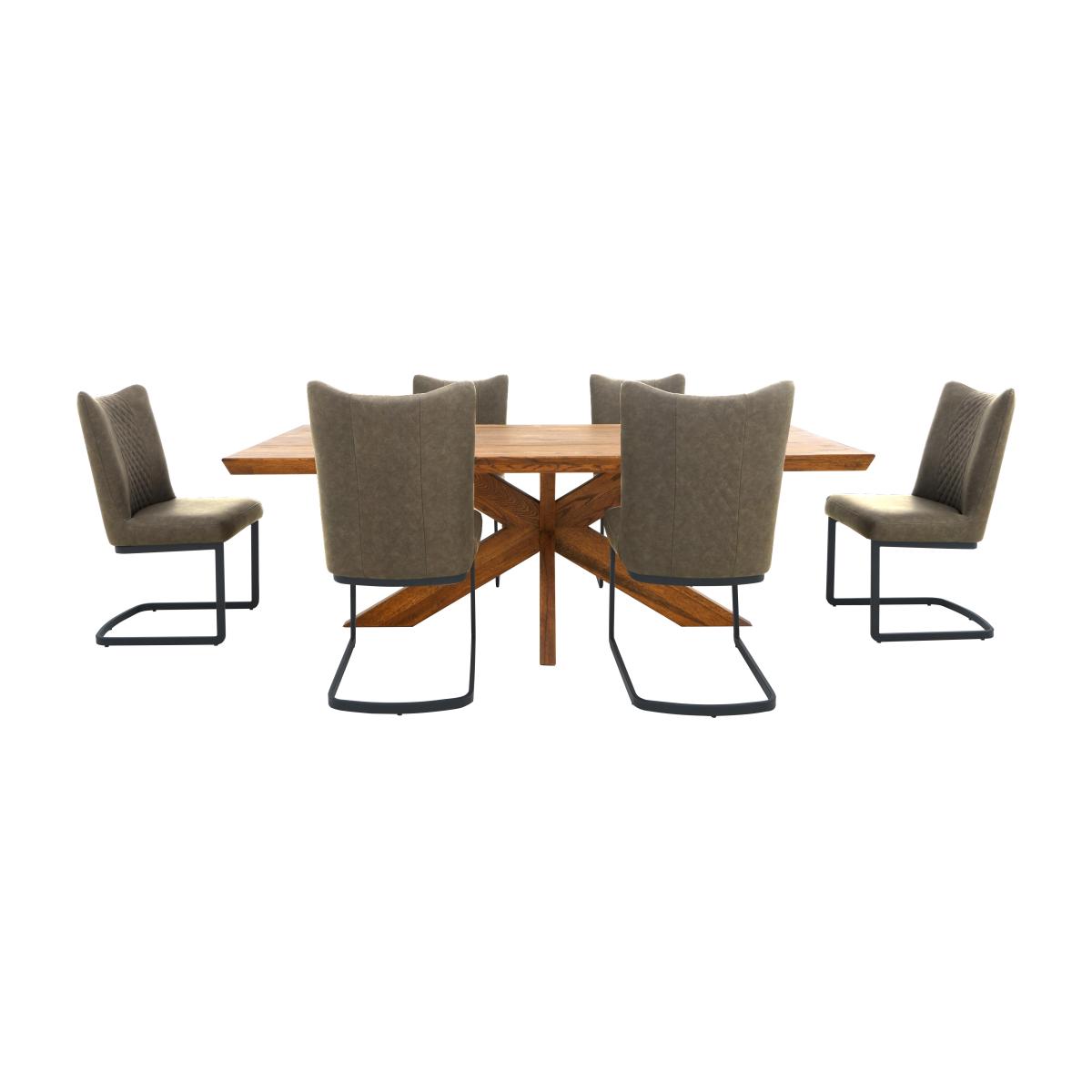 Striking industrial style meets the warmth and familiarity of rustic oak in the Bodahl Loki range, exclusively available at Furniture Village. At the heart of this beautiful collection is a handcrafted solid oak dining table set on a star-shaped base. It’s offered in seven sizes and eight finishes, and with even more customisable options available it’s easy to create the perfect dining table for your home and family. Pair it with the range’s faux leather cantilever dining chairs and dining bench – or make life even easier by choosing one of the ready-made dining sets – and complete the look with a stylish sideboard. We’ve paired this solid rustic oak dining table with six olive green faux leather chairs and we’re very pleased with the result. Modern industrial style that’s just so inviting. Why you'll love it Dining set showcases traditional rustic style updated for contemporary dining spaces. Inviting solid oak dining table with striking star-shaped base. Slanted table top edge adds a touch of elegance. Handcrafted from high-quality solid European oak. Finished with a protective, woodgrain-enhancing matt lacquer. In 8 beautiful wood colour finishes. This dining set includes 6 cantilever dining chairs. In olive green faux leather with quilted-effect stitching on inner and outer seat backs. Exclusively available at Furniture Village. This dining set is part of the Bodahl Loki range. What you need to know Dining chair cantilever bases are made of metal with a black finish. Seat cushioning is foam. Dining table seats 8. Dining table can accommodate up to 2 extension leaves, available separately. The dining table features unique and natural marks, knots and colour variation. Saw cuts are an intentional feature and will vary in frequency and location from table to table. Please be aware that this dining table is extremely heavy. We recommend using coasters and placemats at all times. Easy to care for – simply wipe with a clean, non-abrasive damp cloth.