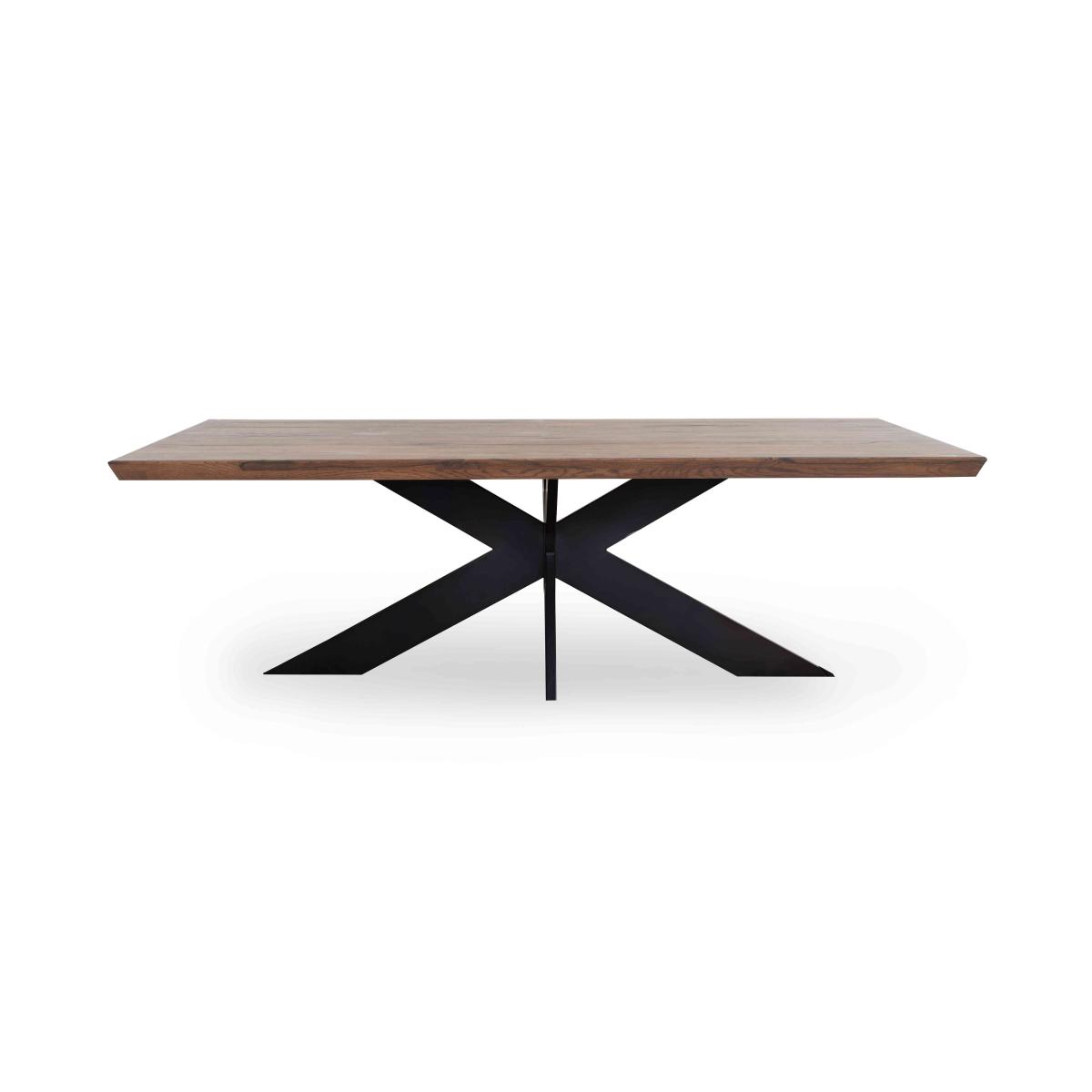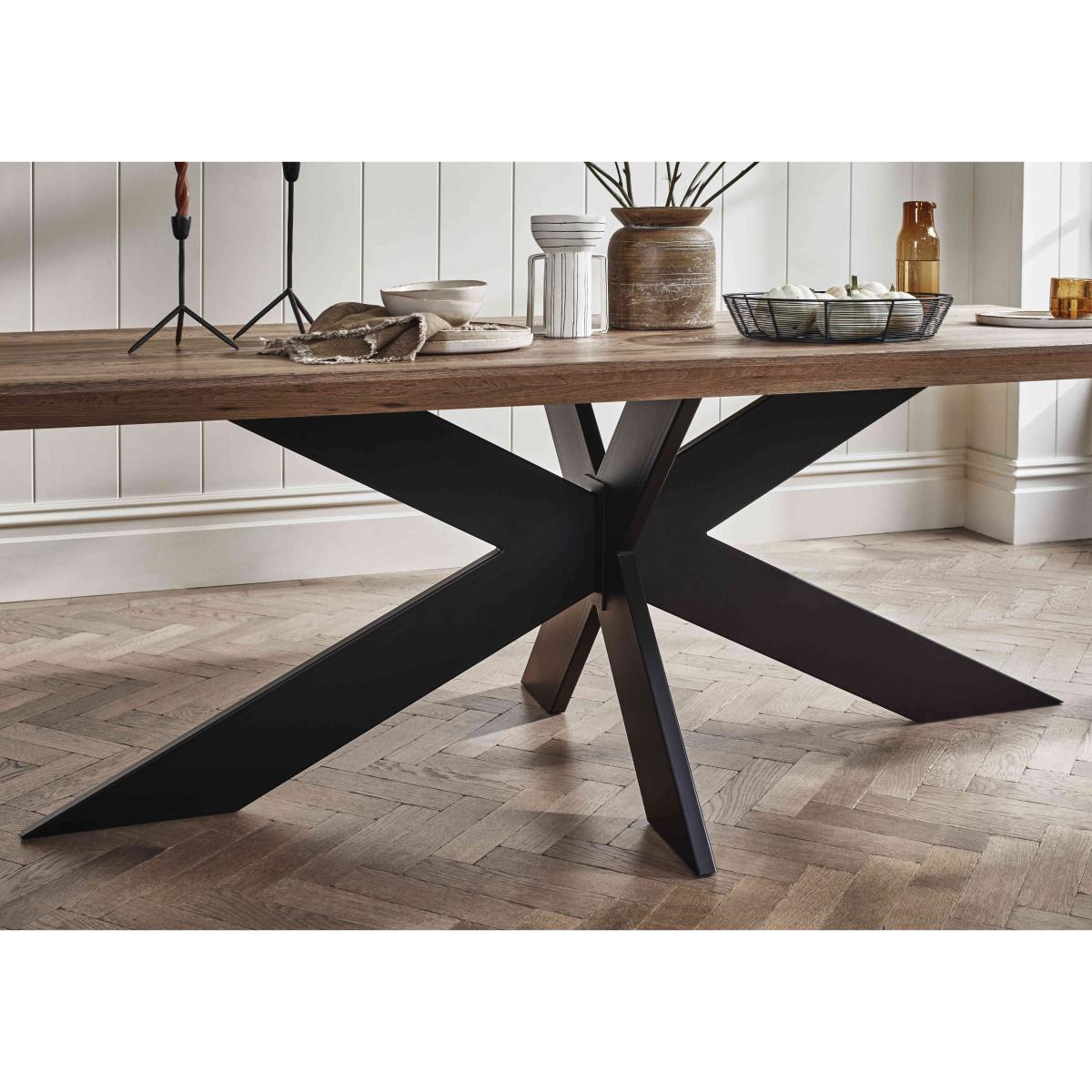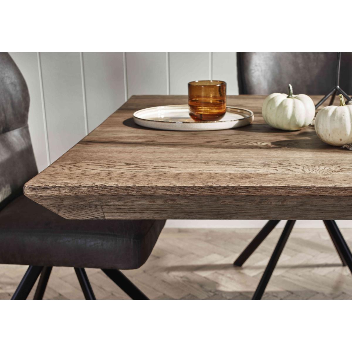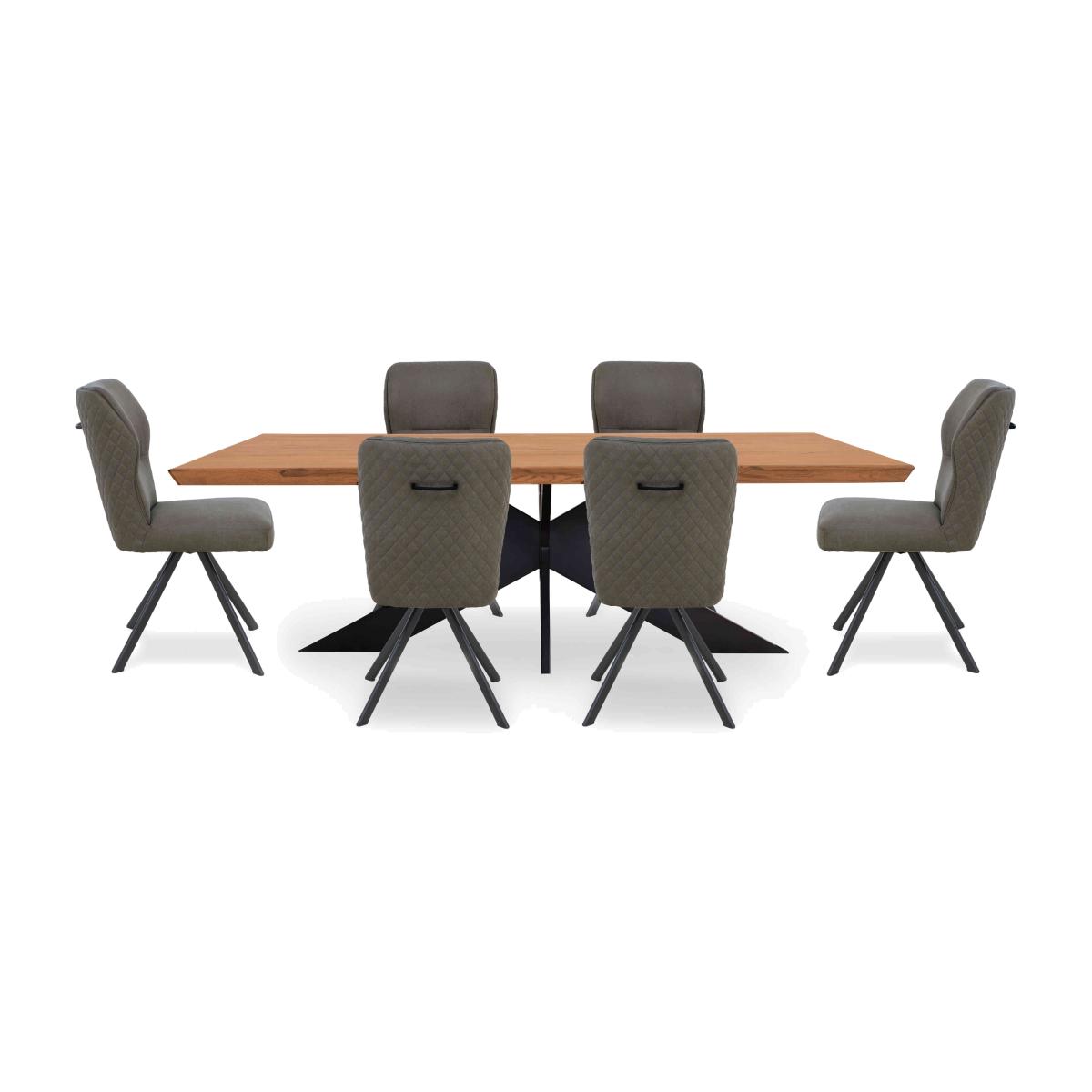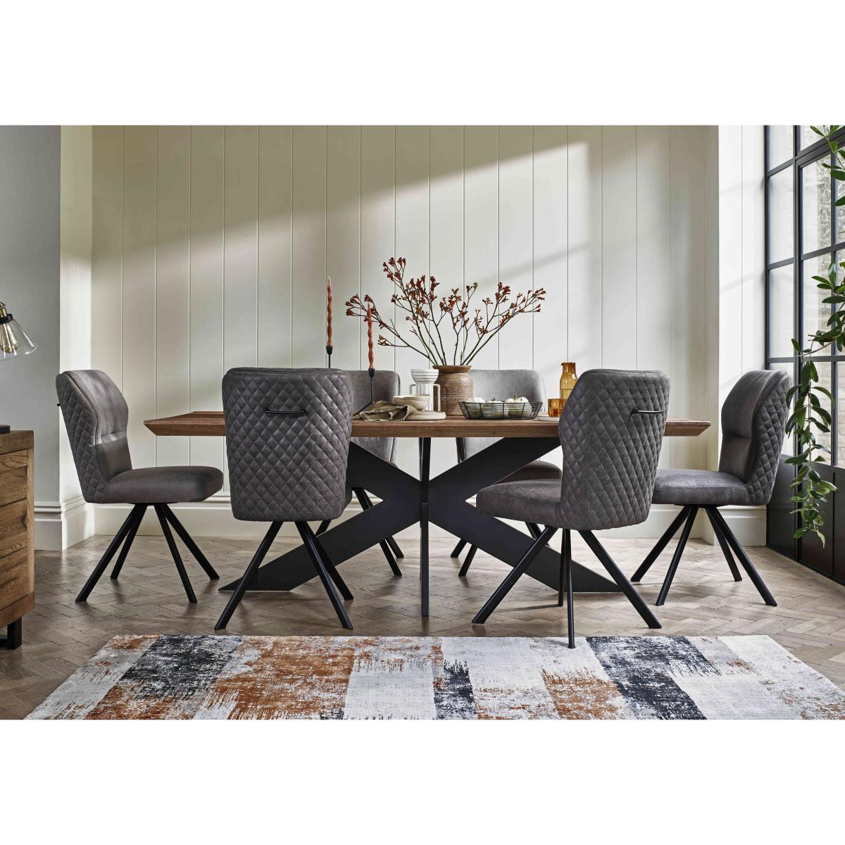 Striking industrial style meets the warmth and familiarity of rustic oak in the Bodahl Loki range, exclusively available at Furniture Village. At the heart of this beautiful collection is a handcrafted solid oak dining table set on a star-shaped base. It’s offered in seven sizes and eight finishes, and with even more customisable options available it’s easy to create the perfect dining table for your home and family. Pair it with the range’s faux leather cantilever dining chairs and dining bench – or make life even easier by choosing one of the ready-made dining sets – and complete the look with a stylish sideboard. Bring bold rustic style to your dining room with this beautiful dining set, part of our exclusive Bodahl Loki range. The table seats ten and can be extended to seat 14. The set includes six swivel chairs. Why you'll love it Fashionable industrial style meets traditional rustic charm. This solid oak dining table has a striking star-shaped base. Slanted table top edge adds a touch of elegance. Handcrafted from high-quality solid European oak. Finished with a protective, woodgrain-enhancing matt lacquer. In 8 beautiful wood colour finishes. This dining set includes 6 stylish swivel dining chairs. Soft fabric upholstery in a steel grey colour. Comfortably shaped seats. Black metal legs. Dining table is extendable with extra leaves, available separately. Exclusively available at Furniture Village. This dining set is part of the Bodahl Loki range. What you need to know Dining chairs are cushioned with foam. This 240 cm dining table seats 10. It can accommodate up to 2 extension leaves, available separately. Every dining table features unique and natural marks, knots and colour variation. Saw cuts are an intentional feature and will vary in frequency and location from table to table. Please be aware that this dining table is extremely heavy. We recommend using coasters and placemats at all times. Easy to care for – simply wipe with a clean, non-abrasive damp cloth.