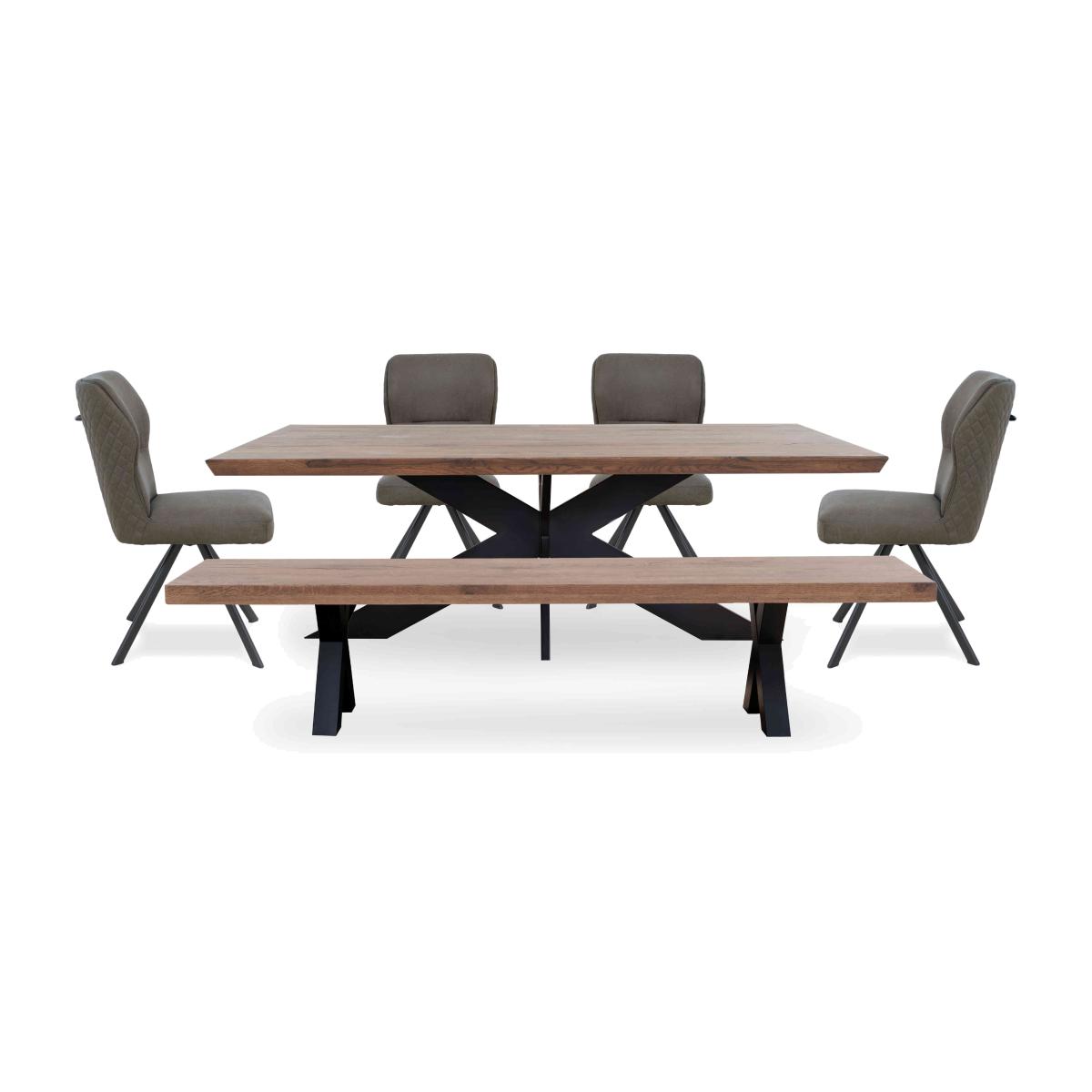 Striking industrial style meets the warmth and familiarity of rustic oak in the Bodahl Loki range, exclusively available at Furniture Village. At the heart of this beautiful collection is a handcrafted solid oak dining table set on a star-shaped base. It’s offered in seven sizes and eight finishes, and with even more customisable options available it’s easy to create the perfect dining table for your home and family. Pair it with the range’s faux leather cantilever dining chairs and dining bench – or make life even easier by choosing one of the ready-made dining sets – and complete the look with a stylish sideboard. Enjoy the perfect blend of traditional craftsmanship and industrial design with this Bodahl dining set. The table is made of solid oak and the set includes a bench and four swivel dining chairs. Why you'll love it Fashionable industrial style meets traditional rustic charm. This solid oak dining table has a striking star-shaped base. Slanted table top edge adds a touch of elegance. Handcrafted from high-quality solid European oak. Finished with a protective, woodgrain-enhancing matt lacquer. In 8 beautiful wood colour finishes. This dining set includes a dining bench and 4 swivel dining chairs. Chairs have supportive seats upholstered a steel grey fabric. Black metal legs. Dining table is extendable with extra leaves, available separately. Exclusively available at Furniture Village. This dining set is part of the Bodahl Loki range. What you need to know Dining chairs are cushioned with foam. This 220 cm dining table seats 8. It can accommodate up to 2 extension leaves, available separately. Every dining table features unique and natural marks, knots and colour variation. Saw cuts are an intentional feature and will vary in frequency and location from table to table. Please be aware that this dining table is extremely heavy. We recommend using coasters and placemats at all times. Easy to care for – simply wipe with a clean, non-abrasive damp cloth.