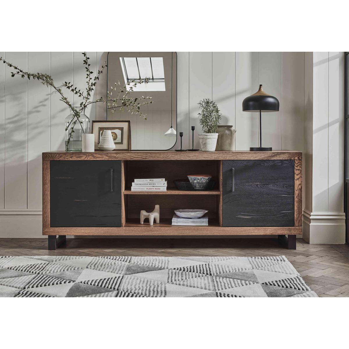 Striking industrial style meets the warmth and familiarity of rustic oak in the Bodahl Loki range, exclusively available at Furniture Village. At the heart of this beautiful collection is a handcrafted solid oak dining table set on a star-shaped base. It’s offered in seven sizes and eight finishes, and with even more customisable options available it’s easy to create the perfect dining table for your home and family. Pair it with the range’s faux leather cantilever dining chairs and dining bench – or make life even easier by choosing one of the ready-made dining sets – and complete the look with a stylish sideboard. With contrasting black-finished cupboard doors, this two-tone sideboard from Bodahl has a look that’s bold and on-trend. And with six open and closed storage areas, it gets top marks for practicality too. Why you'll love it. Rustic oak two-tone sideboard is perfect for contemporary dining spaces. Handcrafted from high-quality solid European oak. Cupboard doors are finished in black. Finished with a protective, woodgrain-enhancing matt lacquer. Versatile storage areas have adjustable shelves. Soft-closing cupboard doors. In 8 beautiful wood colour finishes. Exclusively available at Furniture Village. This two-tone sideboard is part of the Bodahl Loki range. What you need to know. Open storage area has an adjustable shelf. 2 cupboards, each with an adjustable shelf. Black metal handles and U-shaped legs. This sideboard features unique and natural marks, knots and colour variation. Saw cuts are an intentional feature and will vary in frequency and location from table to table. The metalwork has been finished by hand and may display marks. Please be aware that this sideboard is extremely heavy. We recommend using coasters and placemats at all times. Easy to care for – simply wipe with a clean, non-abrasive damp cloth. WARNING!. Furniture can tip over unexpectedly and cause injury. This item must be fixed to a wall using the anti-tip kit provided. Be sure to use the correct wall fixings suitable for the walls in your home. Furniture Village is not able to fix anti-tip devices for you. Seek professional advice if you are unsure.