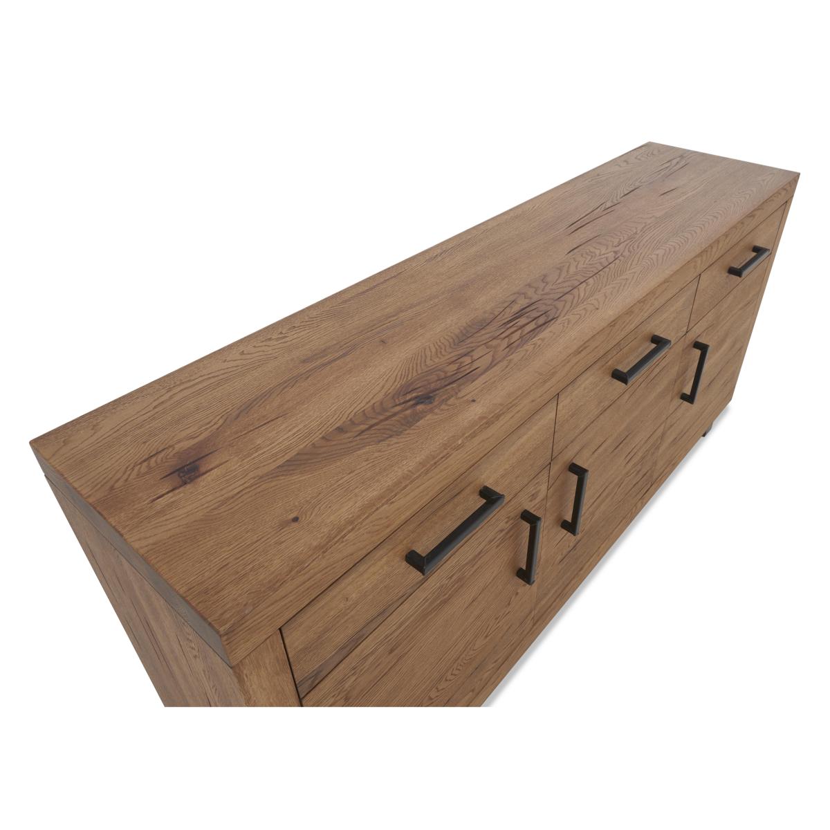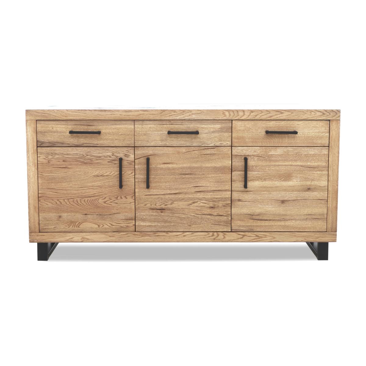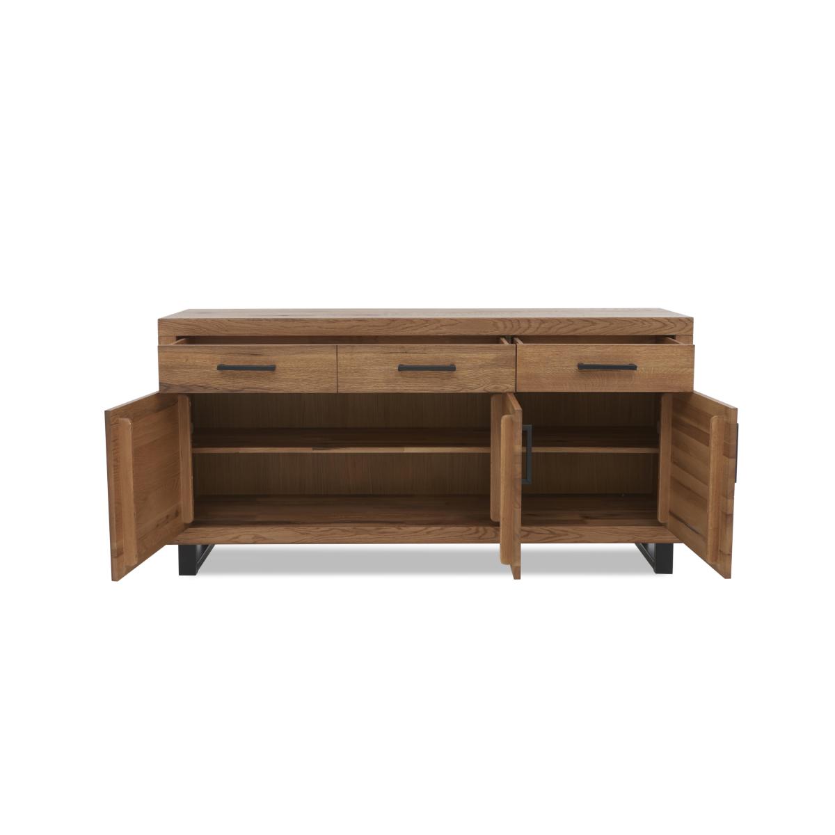 Effortless industrial style at a great-value price is yours with our Bodahl Njord collection. The range’s dining table showcases a distinctive look and finish – a handcrafted solid rustic oak top with beautiful natural raw edges, a sure sign of authenticity and quality, and a star-shaped base in wood or metal. As with all Bodahl furniture, customisability is at the heart of Bodahl Njord’s unique design aesthetic. The dining table is available in bespoke edge styles and a wide choice of finishes, table sizes and edge depths, and as part of a dining set with dining chairs and dining bench seating or as a standalone piece. The Bodahl Njord collection is exclusive to Furniture Village. This industrial sideboard has a lovely rustic oak finish, metal legs and, of course, plenty of space for dinnerware, glasses, table linens and cutlery. Why you'll love it Authentic rustic sideboard offers stylish dining room storage. Fabulous industrial style at an equally fabulous price. Handcrafted solid rustic oak in a choice of colours and finishes. A protective matt lacquer enhances the wood and makes it even more hardwearing. Metal U-shaped legs. Soft-closing drawers and cupboard doors. A Furniture Village exclusive. This sideboard is part of the Bodahl Njord collection. What you need to know Cupboards each have 1 adjustable shelf. Made of solid oak and metal. Oak may display knots, saw marks and variations in tone and texture. Use a clean, damp cloth to clean the oak top. Metal legs are finished by hand and may show marks. WARNING!