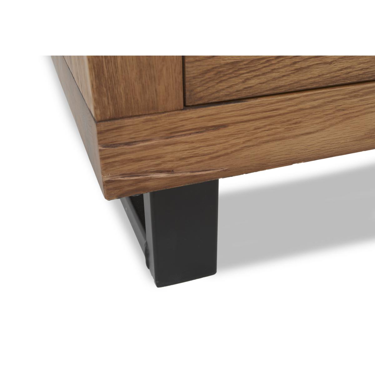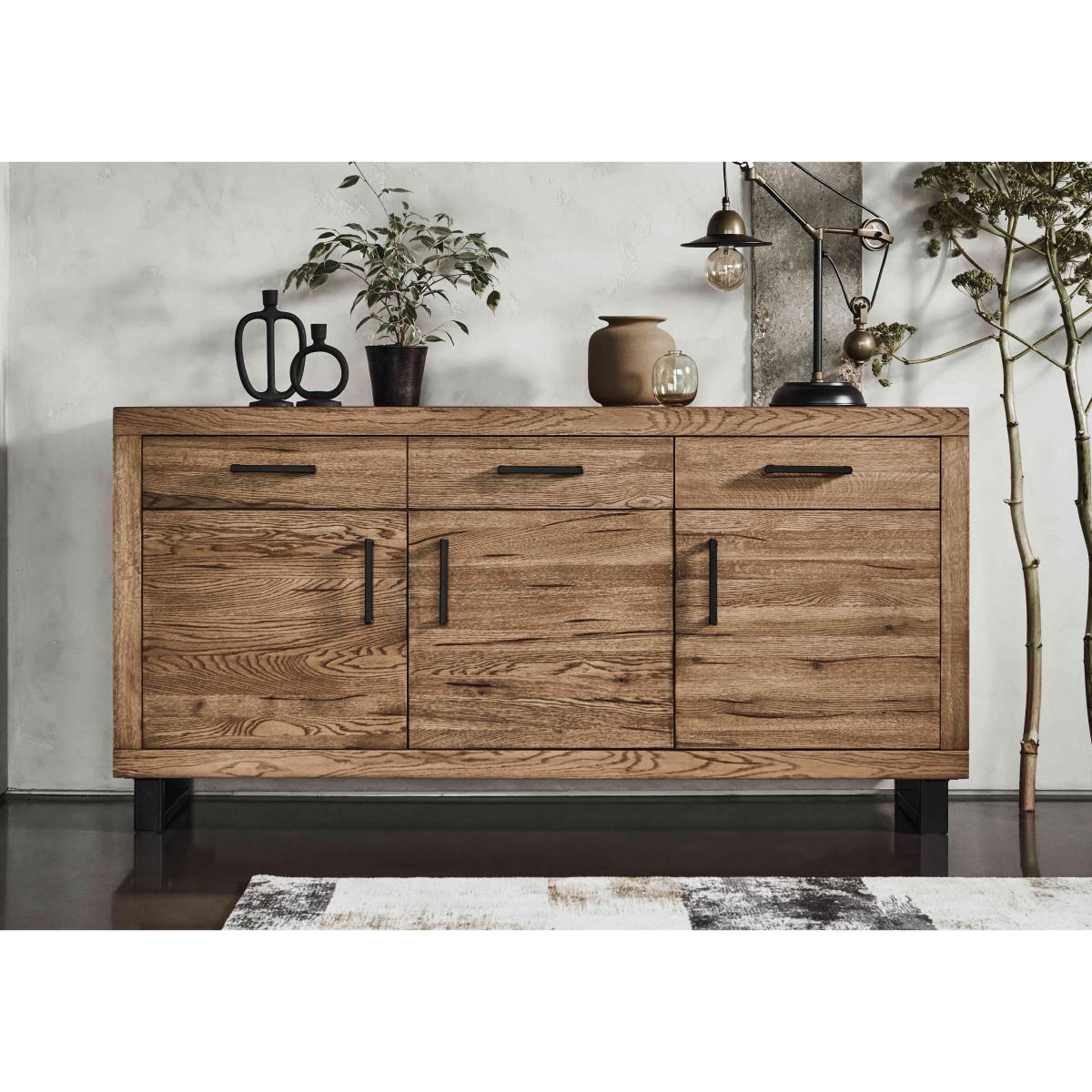 Effortless industrial style at a great-value price is yours with our Bodahl Njord collection. The range’s dining table showcases a distinctive look and finish – a handcrafted solid rustic oak top with beautiful natural raw edges, a sure sign of authenticity and quality, and a star-shaped base in wood or metal. As with all Bodahl furniture, customisability is at the heart of Bodahl Njord’s unique design aesthetic. The dining table is available in bespoke edge styles and a wide choice of finishes, table sizes and edge depths, and as part of a dining set with dining chairs and dining bench seating or as a standalone piece. The Bodahl Njord collection is exclusive to Furniture Village. This industrial sideboard has a lovely rustic oak finish, metal legs and, of course, plenty of space for dinnerware, glasses, table linens and cutlery. Why you'll love it Authentic rustic sideboard offers stylish dining room storage. Fabulous industrial style at an equally fabulous price. Handcrafted solid rustic oak in a choice of colours and finishes. A protective matt lacquer enhances the wood and makes it even more hardwearing. Metal U-shaped legs. Soft-closing drawers and cupboard doors. A Furniture Village exclusive. This sideboard is part of the Bodahl Njord collection. What you need to know Cupboards each have 1 adjustable shelf. Made of solid oak and metal. Oak may display knots, saw marks and variations in tone and texture. Use a clean, damp cloth to clean the oak top. Metal legs are finished by hand and may show marks. WARNING!
