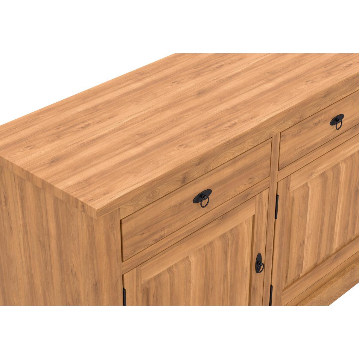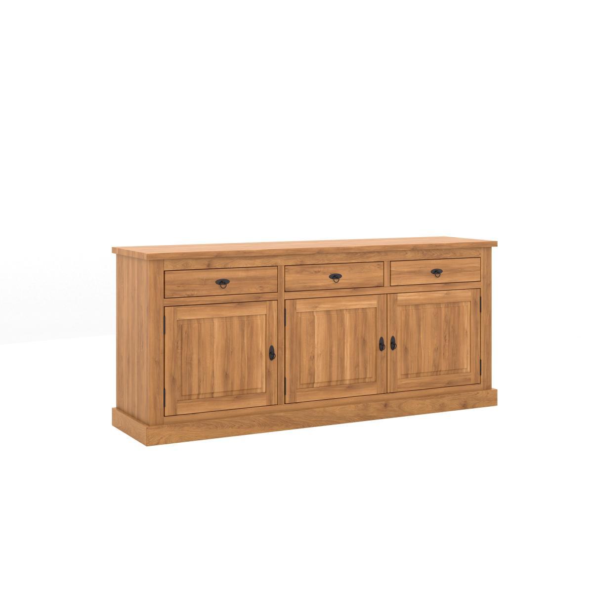 Rustic country style for the contemporary home. The dining table, with a unique handcrafted base, is made of warm and rustic solid oak. It comes in a wide choice of finishes including oiled and whitewashed. Choose a size to suit your space (the largest seats up to 14), or create your own custom size. A solid oak sideboard, oak dining bench and luxurious button backed 100% leather dining chair complete this characterful, timeless range. Timeless in style, the Bodahl Norse sideboard is handcrafted from warm and rustic solid oak. Lovely touches include the stylish brass finish cup handles and classic, plinth base. Why you'll love it. Classic country style for the contemporary home. Handcrafted, every sideboard is unique. Timeless rustic, solid oak. In a choice of finishes including oiled and whitewash. Protected by strong, family-friendly matt lacquer. Plenty of storage in the 3 cupboards and 3 drawers. The drawers have stylish brass-finish cup handles. ???. Complements the Bodahl Norse dining table. Exclusive to Furniture Village. What you need to know. 3 drawers and 3 roomy cupboards. Each cupboard has one fixed shelf. Solid, plinth style base. Made of solid natural oak so every sideboard is unique, with its own natural markings, knots and colour variations. We recommend using coasters and placemats at all times. Easy to care for, simply wipe with a clean, non abrasive damp cloth. For more advice, see our Dining Care Guide. Part of the solid oak Bodahl Norse country style dining range.