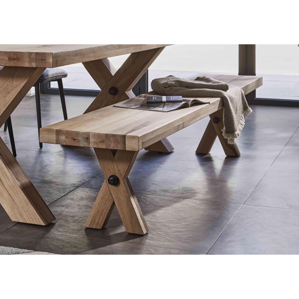 Designed and made exclusively for Furniture Village, the Odin range from Bodahl takes industrial style to a new level. Large and striking, the collection’s statement dining table features a linear metal strip that runs end to end through its solid rustic oak top, while X-shaped legs introduce a timeless rustic quality. Available in seven sizes and eight finishes, this handcrafted dining table is designed to complement any dining space, or you can create your own by customising almost every detail. The range also includes a wide choice of dining sets, dining room seating – a stylish faux leather dining chair and a solid oak dining bench – and roomy sideboards. Dining benches are known for their space-saving practicality, and this one brings plenty of industrial character to the table, too. Handcrafted from solid oak, it features a sturdy X-shaped base. Why you'll love it Characterful dining bench that’s both practical and stylish. Timeless rustic style with an industrial edge. Handcrafted from solid European oak selected for its exceptional quality. Ideal for everyday family use – it's finished with a protective matt lacquer. Choose from 8 different wood colour finishes. In 3 sizes. A Furniture Village exclusive. This dining bench is part of the Bodahl Odin range. What you need to know The 200 cm bench seats 3, 220 cm 4, 240 cm 4. Every bench features unique and natural marks, knots and colour variation. Saw cuts are an intentional feature and will vary in frequency and location from bench to bench. Easy to care for – simply wipe with a clean, non-abrasive damp cloth.