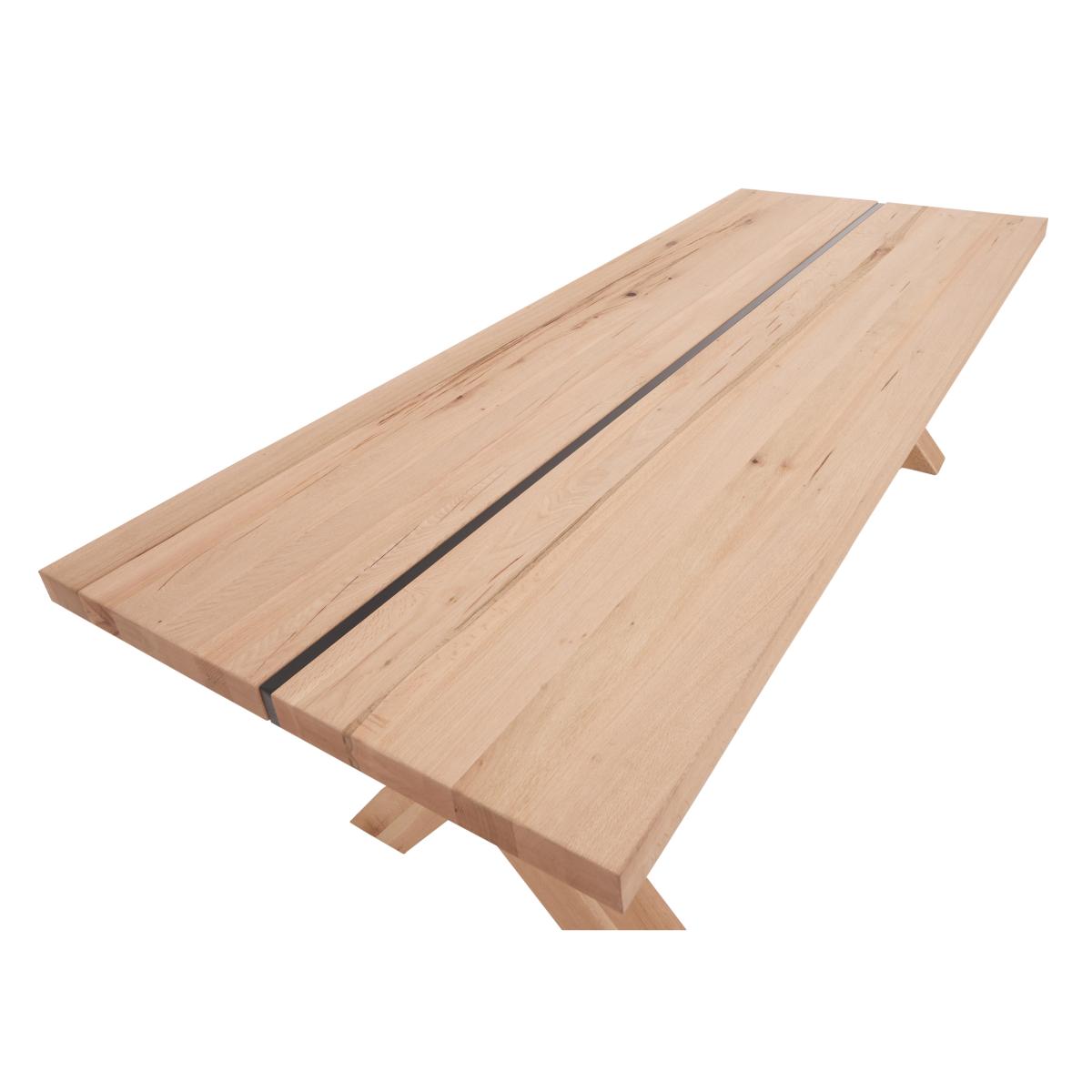 Designed and made exclusively for Furniture Village, the Odin range from Bodahl takes industrial style to a new level. Large and striking, the collection’s statement dining table features a linear metal strip that runs end to end through its solid rustic oak top, while X-shaped legs introduce a timeless rustic quality. Available in seven sizes and eight finishes, this handcrafted dining table is designed to complement any dining space, or you can create your own by customising almost every detail. The range also includes a wide choice of dining sets, dining room seating – a stylish faux leather dining chair and a solid oak dining bench – and roomy sideboards. This fabulous dining table, part of the Bodahl Odin range, takes bold industrial style to the next level thanks to the unexpected metal strip that runs down its length. Only at Furniture Village. Why you'll love it. Characterful one-of-a-kind dining table brings wood and metal together like never before. Timeless rustic style with an industrial edge. This table’s unique look is defined by the metal piece that runs down its centre. Handcrafted from solid European oak selected for its exceptional quality. Ideal for everyday family use – it's finished with a protective matt lacquer. Choose from 8 different wood colour finishes. In 3 sizes. The largest seats 10, and extension leaves are available. A Furniture Village exclusive. This dining table is part of the Bodahl Odin range. What you need to know. The 200 cm table seats 6, 220 cm 8, 240 cm 10. All sizes can accommodate up to 2 extension leaves, available separately. This dining table features unique and natural marks, knots and colour variation. Saw cuts are an intentional feature and will vary in frequency and location from table to table. The metalwork has been finished by hand and may display marks. Please be aware that this dining table is extremely heavy. We recommend using coasters and placemats at all times. Easy to care for – simply wipe with a clean, non-abrasive damp cloth.