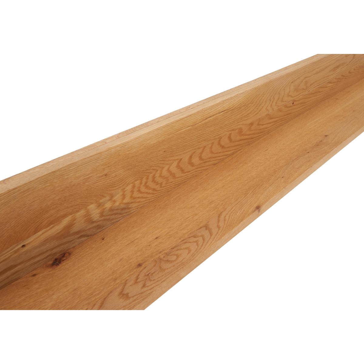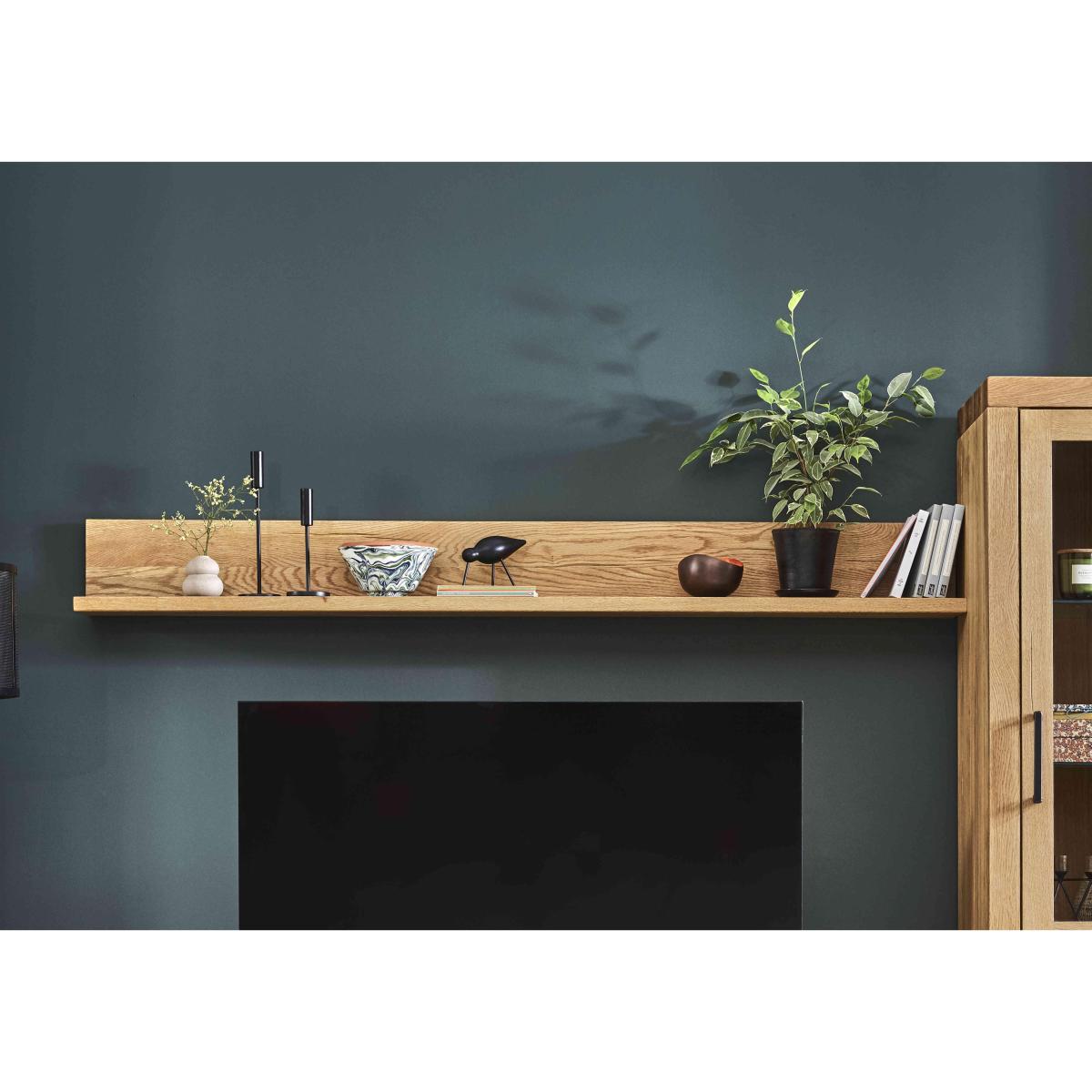 The Terra range combines the warmth of rustic style with the urban edge of industrial design – and it does it beautifully. Expertly handcrafted from solid natural oak, every piece boasts impeccable craftsmanship with knots and markings on full display. Its distinctive black metal legs and natural warmth make this a statement range for design-led interiors and relaxed dining spaces alike. And with a handcrafted padded bench or soft, faux leather cantilevered chairs, there’s plenty of comfy perches to choose from. Simply sit back, tuck in and enjoy your meal in comfort. The Terra range is fully bespoke with a wide range of options for table top edges, thickness, size and colour, alongside several striking leg options. Create your unique design today. This wall shelf is long enough to make an impact in any industrial-style living room. It’s handcrafted from solid oak and available in a wide choice of finishes to suit any decor. Ideal for books, ornaments and more. Why you'll love it. This wall shelf brings bold urban design – and practical storage – to any wall. Statement industrial style. Made from 100% solid natural oak with authentic knots and markings. The protective matte lacquer enhances the wood grain. Choose from a wide selection of oak finishes. Made in Europe. Exclusively available at Furniture Village. This 180 cm wall shelf is part of the Bodahl Terra collection. What you need to know. Made of solid oak. Oak may feature knots, saw marks and variations in tone and texture. Use a clean damp cloth to clean the oak. For a creative display, mix and match with the range’s smaller wall shelf.