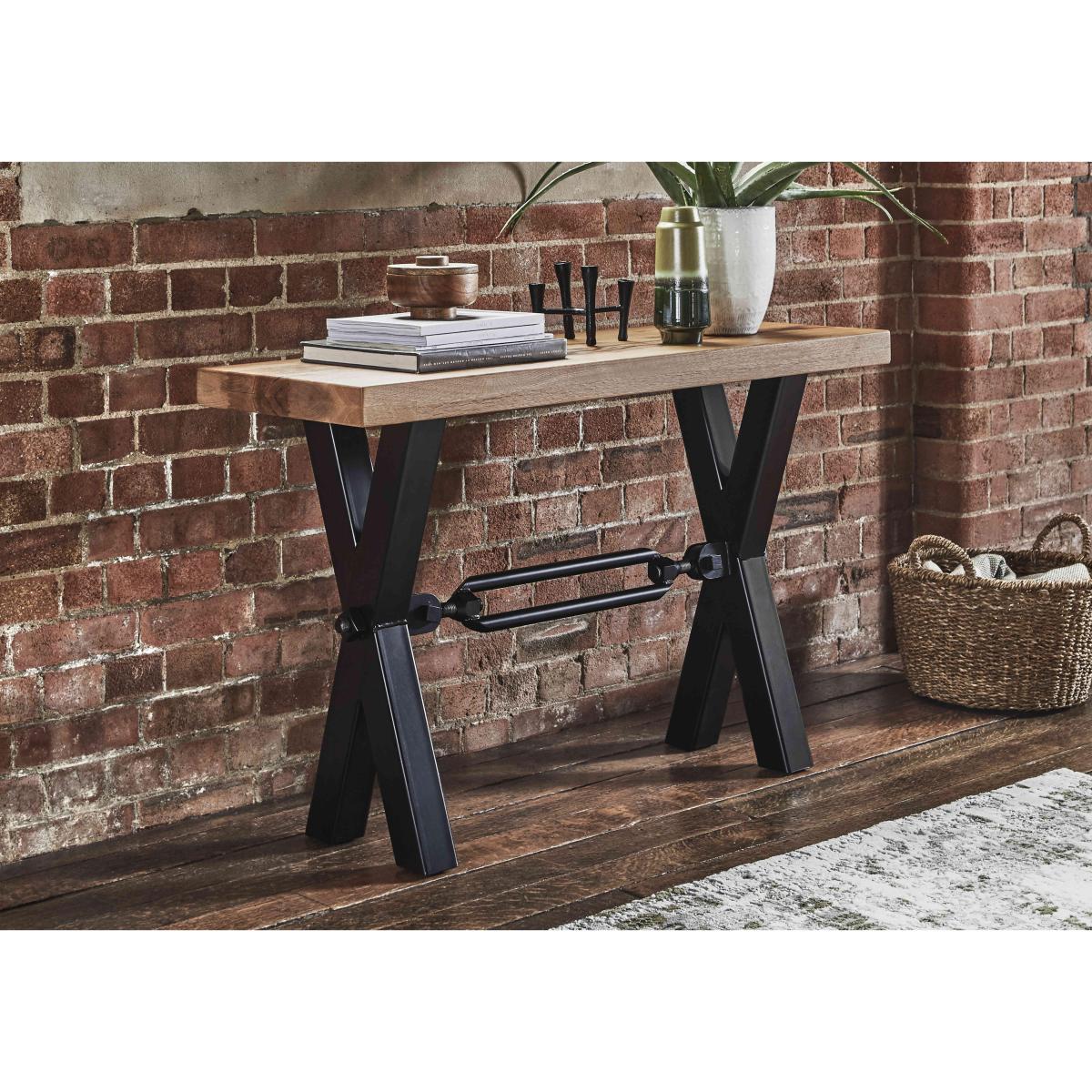 The Terra range combines the warmth of rustic style with the urban edge of industrial design – and it does it beautifully. Expertly handcrafted from solid natural oak, every piece boasts impeccable craftsmanship with knots and markings on full display. Its distinctive black metal legs and natural warmth make this a statement range for design-led interiors and relaxed dining spaces alike. And with a handcrafted padded bench or soft, faux leather cantilevered chairs, there’s plenty of comfy perches to choose from. Simply sit back, tuck in and enjoy your meal in comfort. The Terra range is fully bespoke with a wide range of options for table top edges, thickness, size and colour, alongside several striking leg options. Create your unique design today. The industrial-style Terra console table is the perfect halfway piece to welcome your visitors. Choose from a wide range of wood finishes for the solid oak top. Available in two sizes. Only at Furniture Village. Why you'll love it Handmade rustic oak console table is bold and characterful. Statement industrial style. 100% solid natural oak top has authentic knots and markings. Striking black metal X-shaped base. The table’s long sides have contemporary straight edges. Short sides have folded edges where the wood grain appears to fold over the edge. Choose from a wide selection of oak colour finishes. Wood is topped with a protective matte lacquer. Available in two sizes. The Bodahl Terra collection is only available at Furniture Village. What you need to know Made of solid oak and metal. Small console table is 120 cm wide; large console table is 160 cm wide. Oak top may feature knots, saw marks and variations in tone and texture. Metal legs are finished by hand and may show marks. Use a clean damp cloth to clean the oak top. This Terra console table is also available with a raw edge. A Furniture Village-online exclusive. The Bodahl Terra collection includes dining sets and storage furniture. WARNING! Furniture can tip over unexpectedly and cause injury. This item must be fixed to a wall using the anti-tip kit provided. Be sure to use the correct wall fixings suitable for the walls in your home. Furniture Village is not able to fix anti-tip devices for you. Seek professional advice if you are unsure.