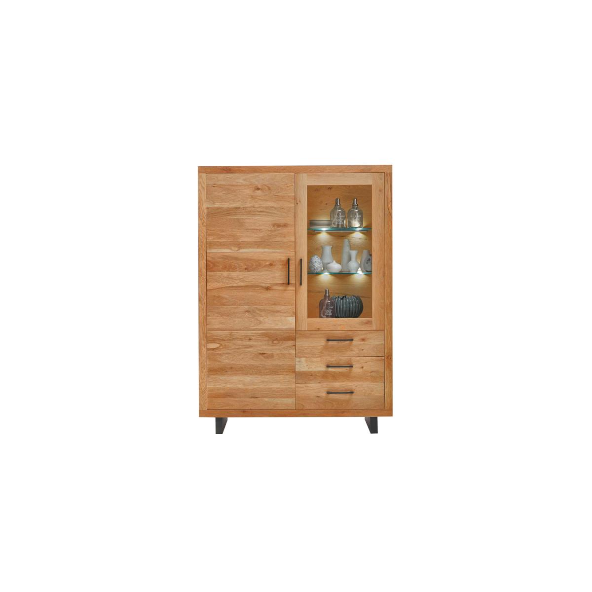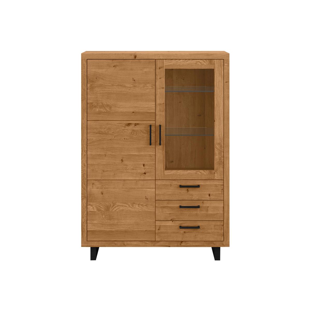 The Terra range combines the warmth of rustic style with the urban edge of industrial design – and it does it beautifully. Expertly handcrafted from solid natural oak, every piece boasts impeccable craftsmanship with knots and markings on full display. Its distinctive black metal legs and natural warmth make this a statement range for design-led interiors and relaxed dining spaces alike. And with a handcrafted padded bench or soft, faux leather cantilevered chairs, there’s plenty of comfy perches to choose from. Simply sit back, tuck in and enjoy your meal in comfort. The Terra range is fully bespoke with a wide range of options for table top edges, thickness, size and colour, alongside several striking leg options. Create your unique design today. Designed to offer optimum storage – and maximum industrial style – this large display cabinet combines handcrafted rustic style with clever features like the glass-fronted cupboard and LED lighting. Why you'll love it This fabulous large display cabinet brings together roomy storage and elegant shelving. Statement industrial style. Made from 100% solid natural oak with authentic knots and markings. Striking black metal U-shaped legs. Built in LED lighting helps show off your favourite ornaments. A protective matte lacquer makes this piece even more robust. Versatile arrangement of display space and cupboard storage. Choose from a wide selection of oak finishes. Made in Europe. Exclusively available at Furniture Village. This large display cabinet is part of the Bodahl Terra collection. What you need to know Left-hand cupboard has 3 shelves. Glass-fronted cupboard has 2 glass shelves. 3 drawers. Doors and drawers are soft-closing. Made of solid oak and metal. Oak may feature knots, saw marks and variations in tone and texture. Metal legs are finished by hand and may show marks. Use a clean damp cloth to clean the oak. Create a complete entertainment centre by pairing with a TV unit from the range. WARNING!