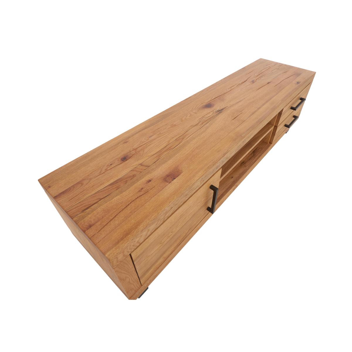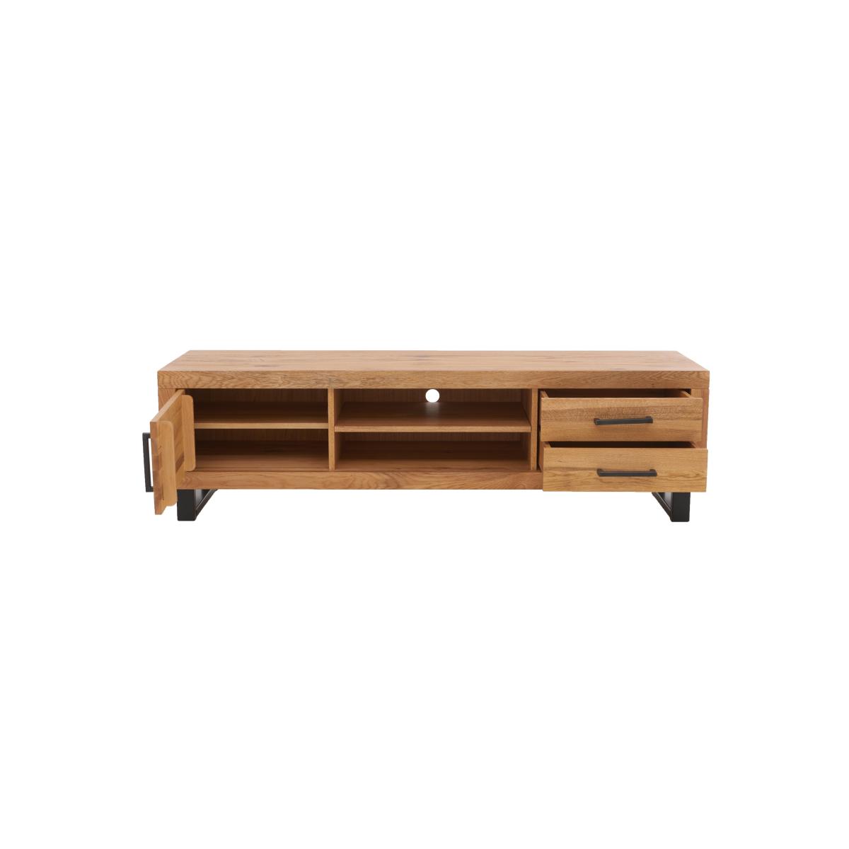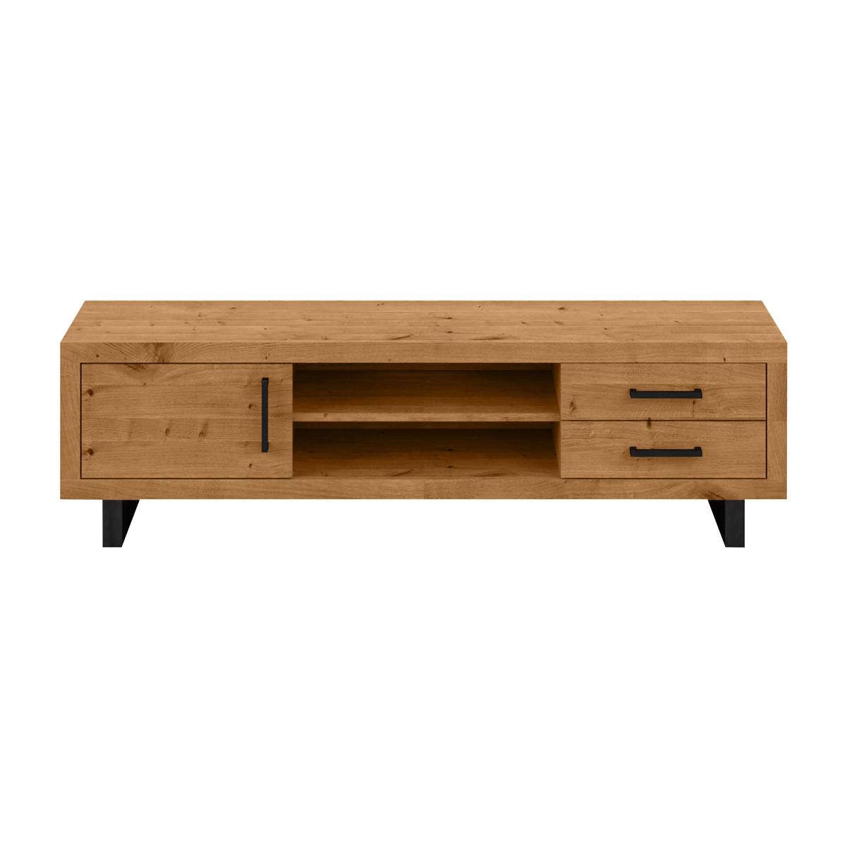 The Terra range combines the warmth of rustic style with the urban edge of industrial design – and it does it beautifully. Expertly handcrafted from solid natural oak, every piece boasts impeccable craftsmanship with knots and markings on full display. Its distinctive black metal legs and natural warmth make this a statement range for design-led interiors and relaxed dining spaces alike. And with a handcrafted padded bench or soft, faux leather cantilevered chairs, there’s plenty of comfy perches to choose from. Simply sit back, tuck in and enjoy your meal in comfort. The Terra range is fully bespoke with a wide range of options for table top edges, thickness, size and colour, alongside several striking leg options. Create your unique design today. Get the media storage you need and the bold industrial style you crave with this stunning large TV unit, part of the handcrafted Bodahl Terra collection. Choose from a wide range of finishes. Why you'll love it Striking and spacious, this large TV unit is handcrafted from solid rustic oak. Statement industrial style. Made from 100% solid natural oak with authentic knots and markings. Striking black metal U-shaped legs. A protective matte lacquer makes this piece even more robust. Choose from a wide selection of oak finishes. Made in Europe. Exclusively available at Furniture Village. This large TV unit is part of the Bodahl Terra collection. What you need to know 1 cupboard, alcove with shelf, 2 drawers. Doors and drawers are soft-closing. Made of solid oak and metal. Oak may feature knots, saw marks and variations in tone and texture. Metal legs are finished by hand and may show marks. Use a clean damp cloth to clean the oak. Create a complete entertainment centre by adding a display cabinet from the range. WARNING!