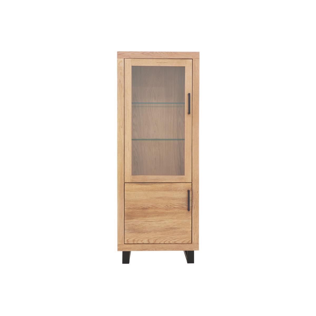 The Terra range combines the warmth of rustic style with the urban edge of industrial design – and it does it beautifully. Expertly handcrafted from solid natural oak, every piece boasts impeccable craftsmanship with knots and markings on full display. Its distinctive black metal legs and natural warmth make this a statement range for design-led interiors and relaxed dining spaces alike. And with a handcrafted padded bench or soft, faux leather cantilevered chairs, there’s plenty of comfy perches to choose from. Simply sit back, tuck in and enjoy your meal in comfort. The Terra range is fully bespoke with a wide range of options for table top edges, thickness, size and colour, alongside several striking leg options. Create your unique design today. With built-in LED lights and plenty of display and storage space, this small display cabinet is a versatile and practical way to bring home on-trend industrial style. Why you'll love it Beautifully made small display unit represents the elegant side of urban design. Statement industrial style. Made from 100% solid natural oak with authentic knots and markings. Striking black metal U-shaped legs. Built-in LED lighting helps show off your favourite ornaments. A protective matte lacquer makes this piece even more robust. Versatile arrangement of display space and cupboard storage. The door of this display cabinet is hinged on the left. Also available with a right-hand hinged door. Made in Europe. Exclusively available at Furniture Village. This small display cabinet is part of the Bodahl Terra collection. What you need to know Glass-fronted cupboard has 2 glass shelves. Lower cupboard has 1 shelf. Doors and drawers are soft-closing. Made of solid oak and metal. Oak may feature knots, saw marks and variations in tone and texture. Metal legs are finished by hand and may show marks. Use a clean, damp cloth to clean the oak. Also available as part of the range's media sets. WARNING!Furniture can tip over unexpectedly and cause injury. This item must be fixed to a wall using the anti-tip kit provided. Be sure to use the correct wall fixings suitable for the walls in your home. Furniture Village is not able to fix anti-tip devices for you. Seek professional advice if you are unsure.