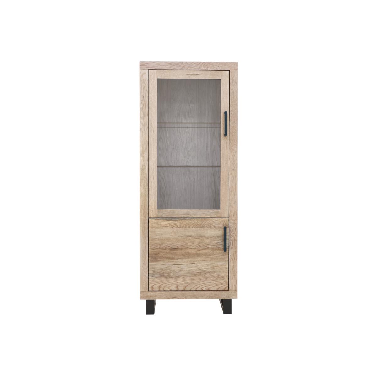 The Terra range combines the warmth of rustic style with the urban edge of industrial design – and it does it beautifully. Expertly handcrafted from solid natural oak, every piece boasts impeccable craftsmanship with knots and markings on full display. Its distinctive black metal legs and natural warmth make this a statement range for design-led interiors and relaxed dining spaces alike. And with a handcrafted padded bench or soft, faux leather cantilevered chairs, there’s plenty of comfy perches to choose from. Simply sit back, tuck in and enjoy your meal in comfort. The Terra range is fully bespoke with a wide range of options for table top edges, thickness, size and colour, alongside several striking leg options. Create your unique design today. With built-in LED lights and plenty of display and storage space, this small display cabinet is a versatile and practical way to bring home on-trend industrial style. Why you'll love it Beautifully made small display unit represents the elegant side of urban design. Statement industrial style. Made from 100% solid natural oak with authentic knots and markings. Striking black metal U-shaped legs. Built-in LED lighting helps show off your favourite ornaments. A protective matte lacquer makes this piece even more robust. Versatile arrangement of display space and cupboard storage. The door of this display cabinet is hinged on the left. Also available with a right-hand hinged door. Made in Europe. Exclusively available at Furniture Village. This small display cabinet is part of the Bodahl Terra collection. What you need to know Glass-fronted cupboard has 2 glass shelves. Lower cupboard has 1 shelf. Doors and drawers are soft-closing. Made of solid oak and metal. Oak may feature knots, saw marks and variations in tone and texture. Metal legs are finished by hand and may show marks. Use a clean, damp cloth to clean the oak. Also available as part of the range's media sets. WARNING!Furniture can tip over unexpectedly and cause injury. This item must be fixed to a wall using the anti-tip kit provided. Be sure to use the correct wall fixings suitable for the walls in your home. Furniture Village is not able to fix anti-tip devices for you. Seek professional advice if you are unsure.