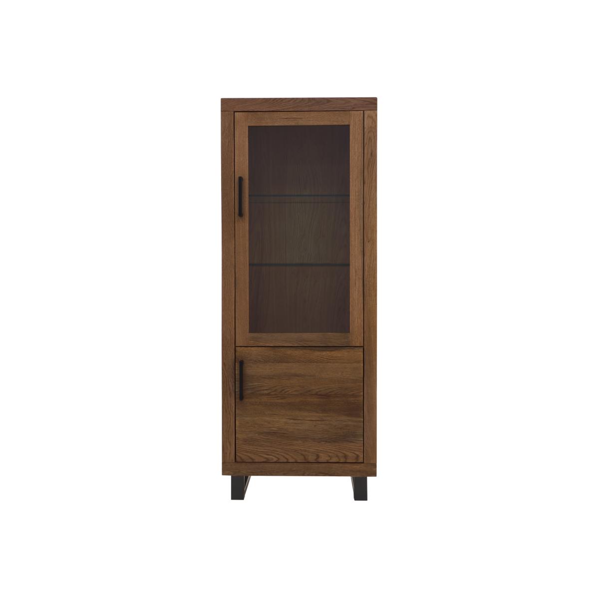 The Terra range combines the warmth of rustic style with the urban edge of industrial design – and it does it beautifully. Expertly handcrafted from solid natural oak, every piece boasts impeccable craftsmanship with knots and markings on full display. Its distinctive black metal legs and natural warmth make this a statement range for design-led interiors and relaxed dining spaces alike. And with a handcrafted padded bench or soft, faux leather cantilevered chairs, there’s plenty of comfy perches to choose from. Simply sit back, tuck in and enjoy your meal in comfort. The Terra range is fully bespoke with a wide range of options for table top edges, thickness, size and colour, alongside several striking leg options. Create your unique design today. If you love industrial furniture, we think you’ll love this versatile and well-crafted small display cabinet. Made from solid oak to suit your decor. Why you'll love it Beautifully made small display unit represents the elegant side of urban design. Statement industrial style. Made from 100% solid natural oak with authentic knots and markings. Striking black metal U-shaped legs. Built-in LED lighting helps show off your favourite ornaments. A protective matte lacquer makes this piece even more robust. Versatile arrangement of display space and cupboard storage. The door of this display cabinet is hinged on the right. Also available with a left-hand hinged door. Made in Europe. Exclusively available at Furniture Village. This small display cabinet is part of the Bodahl Terra collection. What you need to know Glass-fronted cupboard has 2 glass shelves. Lower cupboard has 1 shelf. Doors and drawers are soft-closing. Made of solid oak and metal. Oak may feature knots, saw marks and variations in tone and texture. Metal legs are finished by hand and may show marks. Use a clean, damp cloth to clean the oak. Also available as part of the range's media sets. WARNING!Furniture can tip over unexpectedly and cause injury. This item must be fixed to a wall using the anti-tip kit provided. Be sure to use the correct wall fixings suitable for the walls in your home. Furniture Village is not able to fix anti-tip devices for you. Seek professional advice if you are unsure.