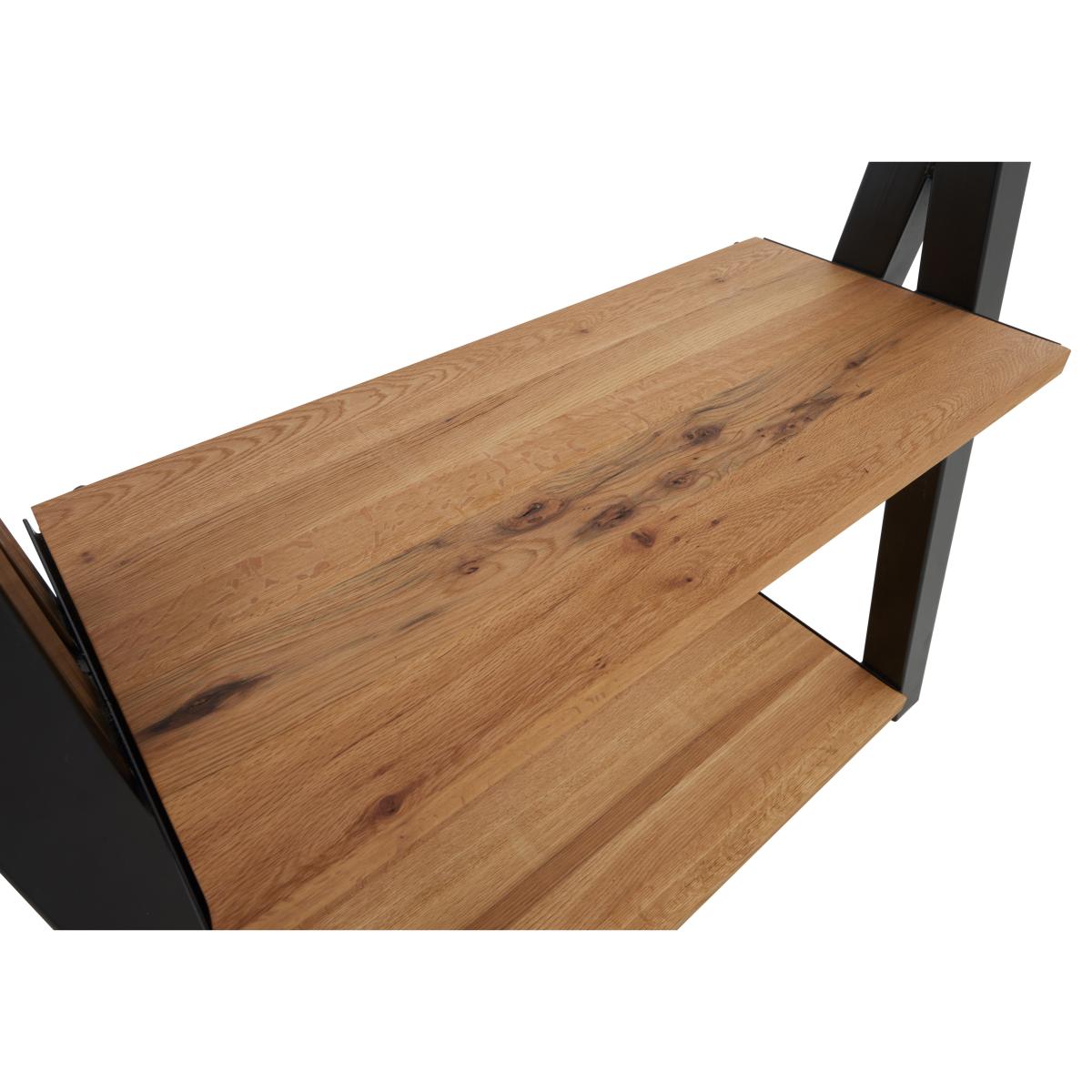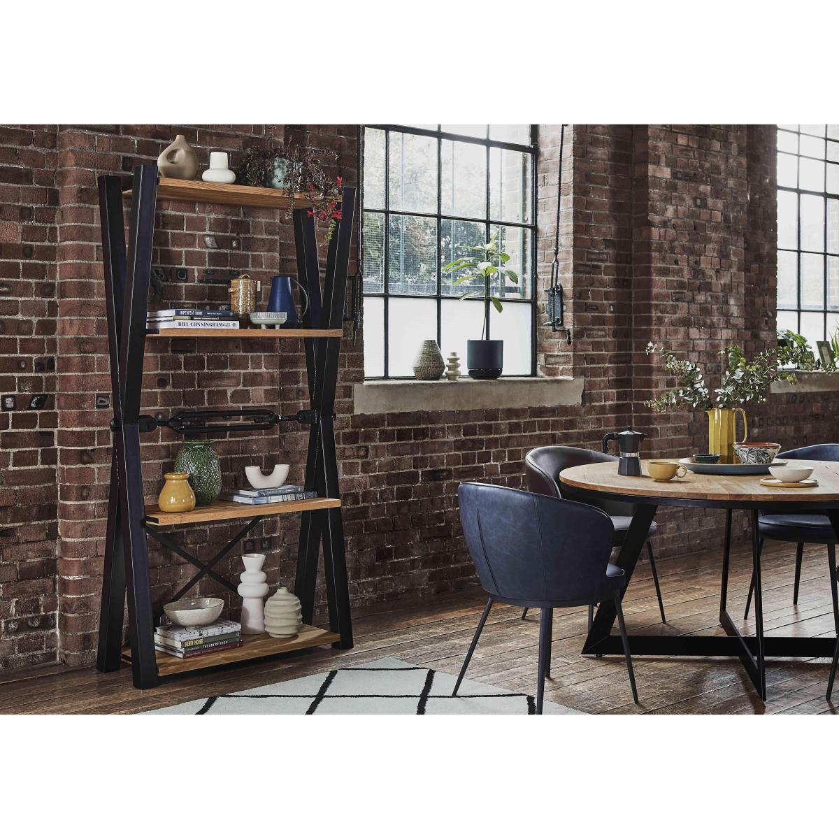 The Terra range combines the warmth of rustic style with the urban edge of industrial design – and it does it beautifully. Expertly handcrafted from solid natural oak, every piece boasts impeccable craftsmanship with knots and markings on full display. Its distinctive black metal legs and natural warmth make this a statement range for design-led interiors and relaxed dining spaces alike. And with a handcrafted padded bench or soft, faux leather cantilevered chairs, there’s plenty of comfy perches to choose from. Simply sit back, tuck in and enjoy your meal in comfort. The Terra range is fully bespoke with a wide range of options for table top edges, thickness, size and colour, alongside several striking leg options. Create your unique design today. This practical shelving unit delivers standout style thanks to its deep oak shelves and eye-catching crossed metal frame. It’s perfect for storing books and makes a cool home for a display of ceramics or glassware. Why you'll love it Handmade rustic oak and metal shelving unit is bold and characterful. Statement industrial style. 100% solid natural oak shelves have authentic knots and markings. Striking black metal X-shaped supports. Choose from a wide selection of oak colour finishes for the shelves. Wood is topped with a protective matte lacquer. The Bodahl Terra collection is only available at Furniture Village. What you need to know Made of solid oak and metal. 4 shelves. Oak shelves may feature knots, saw marks and variations in tone and texture. Metal frame is finished by hand and may show marks. Use a clean damp cloth to clean the oak shelves. A Furniture Village-online exclusive. The Bodahl Terra collection includes dining sets and storage furniture. WARNING!