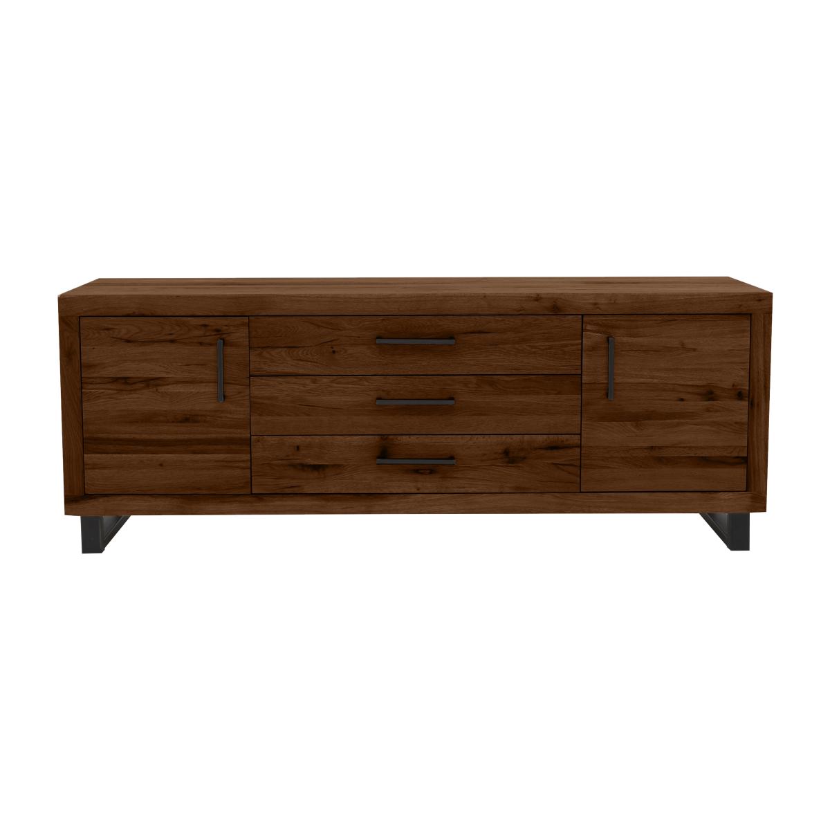 The Terra range combines the warmth of rustic style with the urban edge of industrial design – and it does it beautifully. Expertly handcrafted from solid natural oak, every piece boasts impeccable craftsmanship with knots and markings on full display. Its distinctive black metal legs and natural warmth make this a statement range for design-led interiors and relaxed dining spaces alike. And with a handcrafted padded bench or soft, faux leather cantilevered chairs, there’s plenty of comfy perches to choose from. Simply sit back, tuck in and enjoy your meal in comfort. The Terra range is fully bespoke with a wide range of options for table top edges, thickness, size and colour, alongside several striking leg options. Create your unique design today.• A warm, rustic industrial design with a statement feel • Elegant and distinctive metal work • Beautifully handcrafted from solid natural oak Bring home signature industrial style with the beautifully crafted Terra Sideboard. Imbued with a natural, rustic feel, it looks right at home in many dining and living spaces and instantly elevates décor. Long and wide, it boasts plenty of storage with three roomy drawers which are perfect for cutlery, table linen or placemats. Inside its two spacious cupboards you’ll find a shelf to hide away glassware and dinnerware, so you’re always ready to entertain. It perfectly showcases the beauty of natural wood, with unique knots and grain in every piece. Elegant, black metal handles and ski-style feet contrast with the warm-toned timber to stunning effect. Choose from several different colour options to find the design that best complements your décor. The Terra Sideboard is part of the carefully handcrafted Terra range which offers a rustic and industrial selection if dining and living room furniture. Please note: The pieces in this collection are handcrafted from solid oak, and characterful knots, saw marks and variations in tone and texture are to be expected. The oak is finished with a matte lacquer. Simply use a clean cloth wrung in water to clean. The metal work has been finished by hand and may display similar marks. WARNING! Furniture can tip over unexpectedly and cause injury. This item must be fixed to a wall using the anti-tip kit provided. Be sure to use the correct wall fixings suitable for the walls in your home. Furniture Village is not able to fix anti-tip devices for you. Seek professional advice if you are unsure.