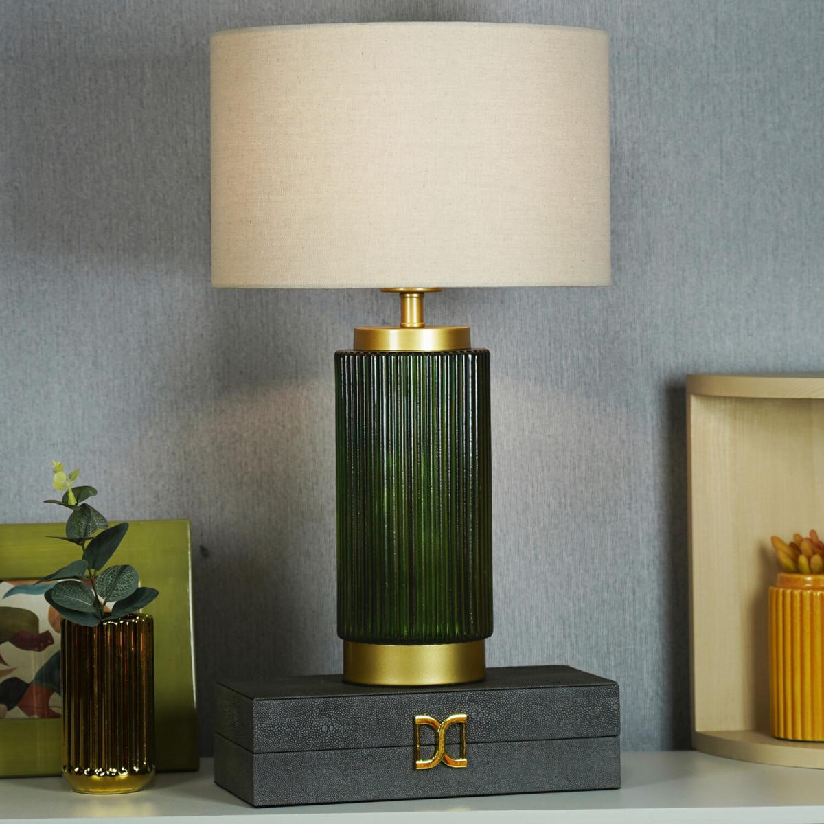 Enhance your interior with the Boden Glass Table Lamp, designed in a soft green hue with subtle gold detailing on the corners. Combining glass elegance with a refined touch of colour, this lamp complements modern and classic spaces alike, adding style and sophistication to any tabletop, desk, or decorative corner in your home.
