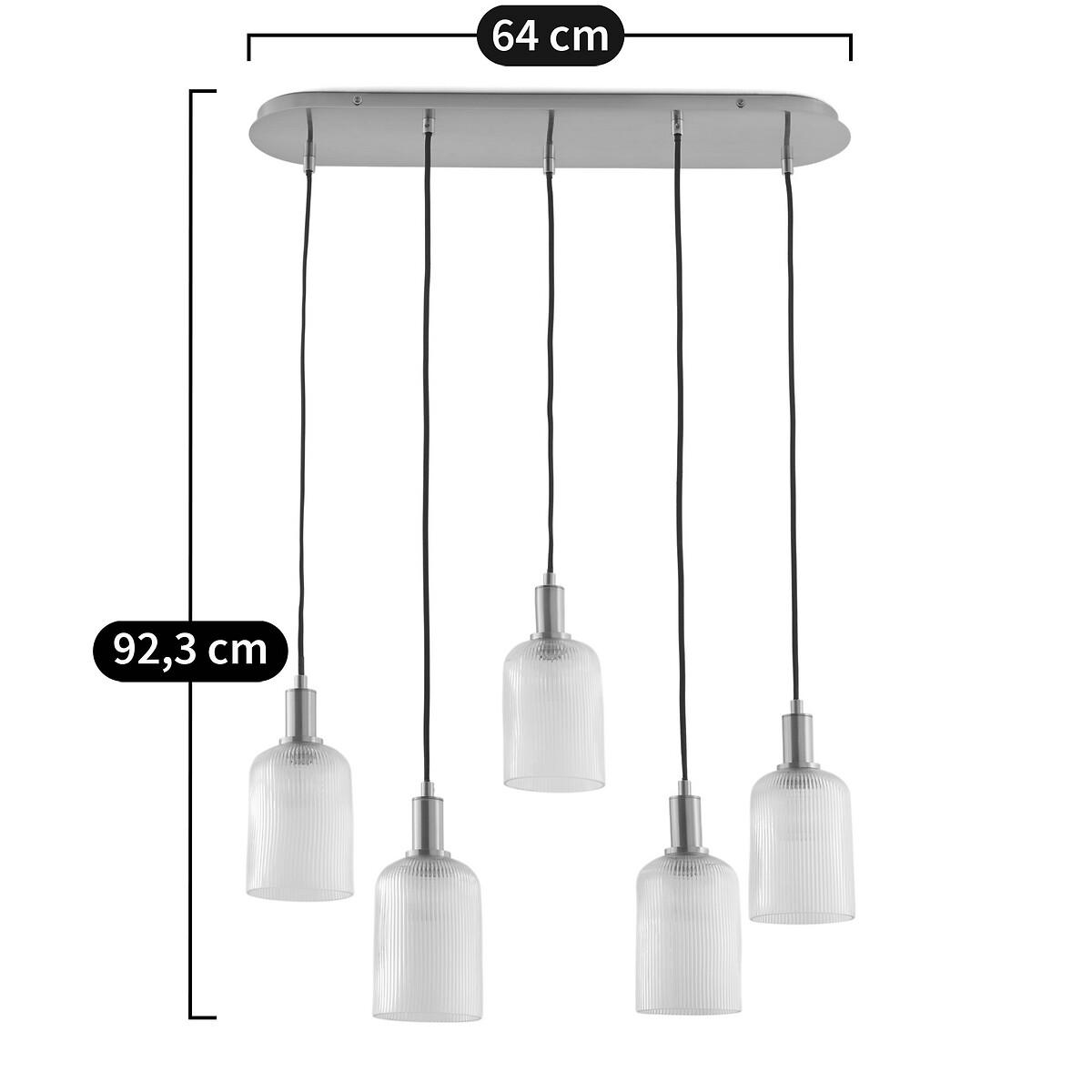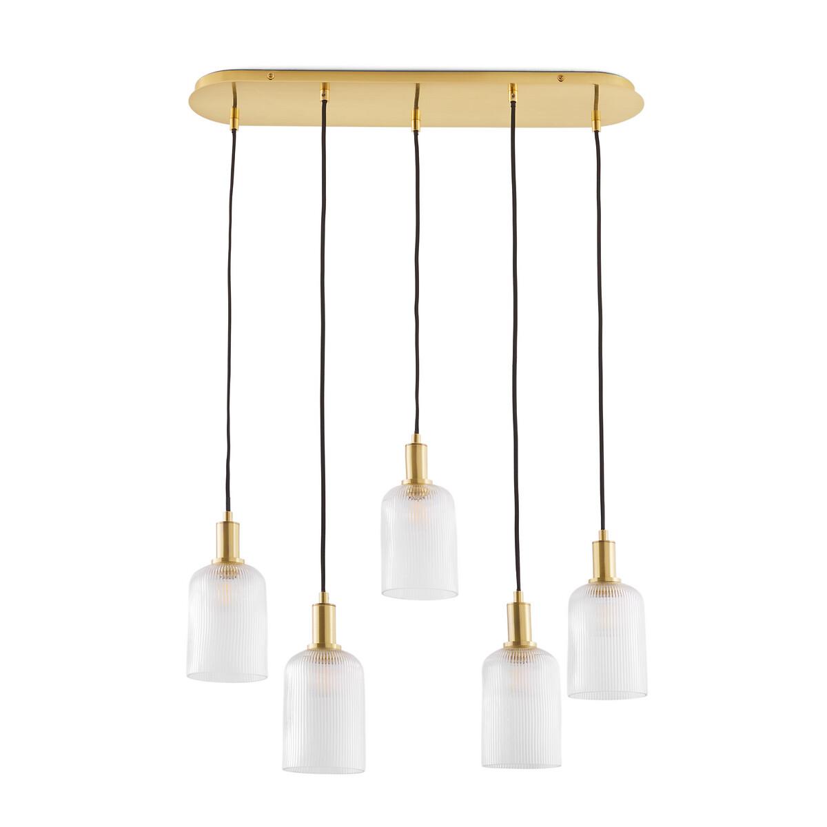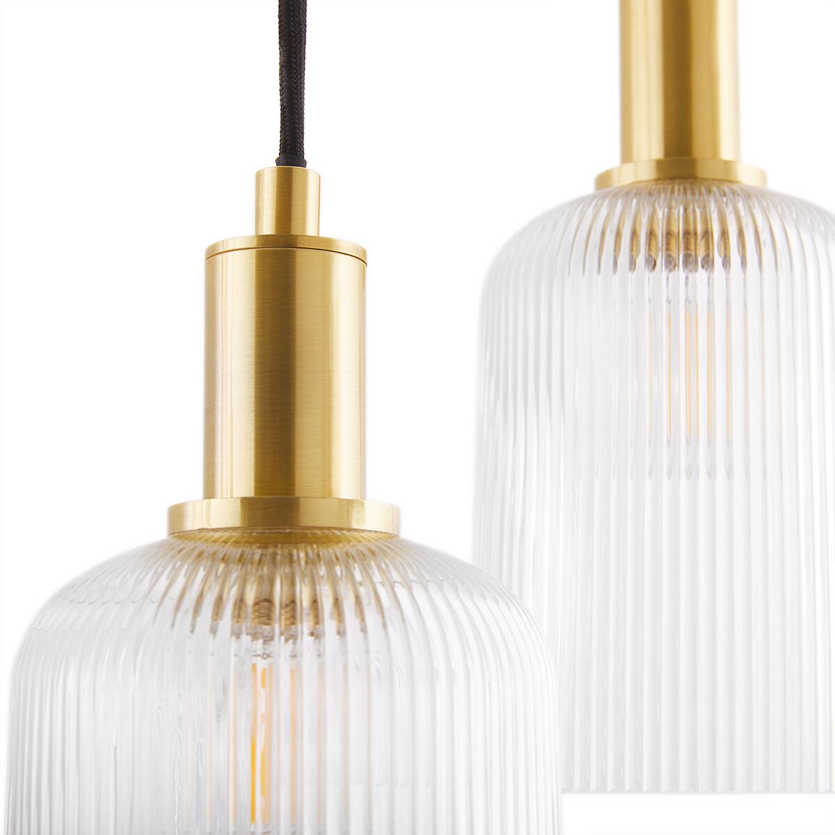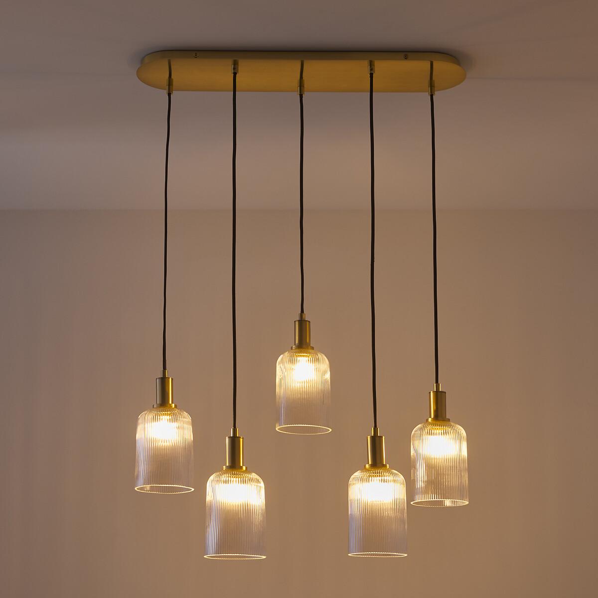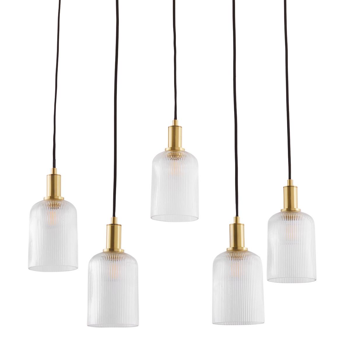 You'll be charmed by this pendant light which combines striated glass and brass for an antique feel! A pendant lamp with multiple light fixtures, its vintage chic will put a smile on your face. Product Details • Brass-finish iron structure and textured glass lampshade • E14 socket for compact fluorescent bulb, 8W max (not supplied) • Compatible with energy saving bulbs classes: A Dimensions • Length: 64cm • Height: 92.3cm Shop the full lighting collection online. Dimensions and weight of parcel1 parcel • 29 x 22 x 67.5cm • 5.2kg