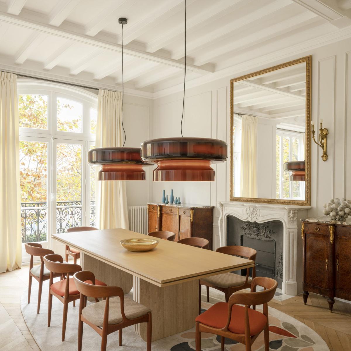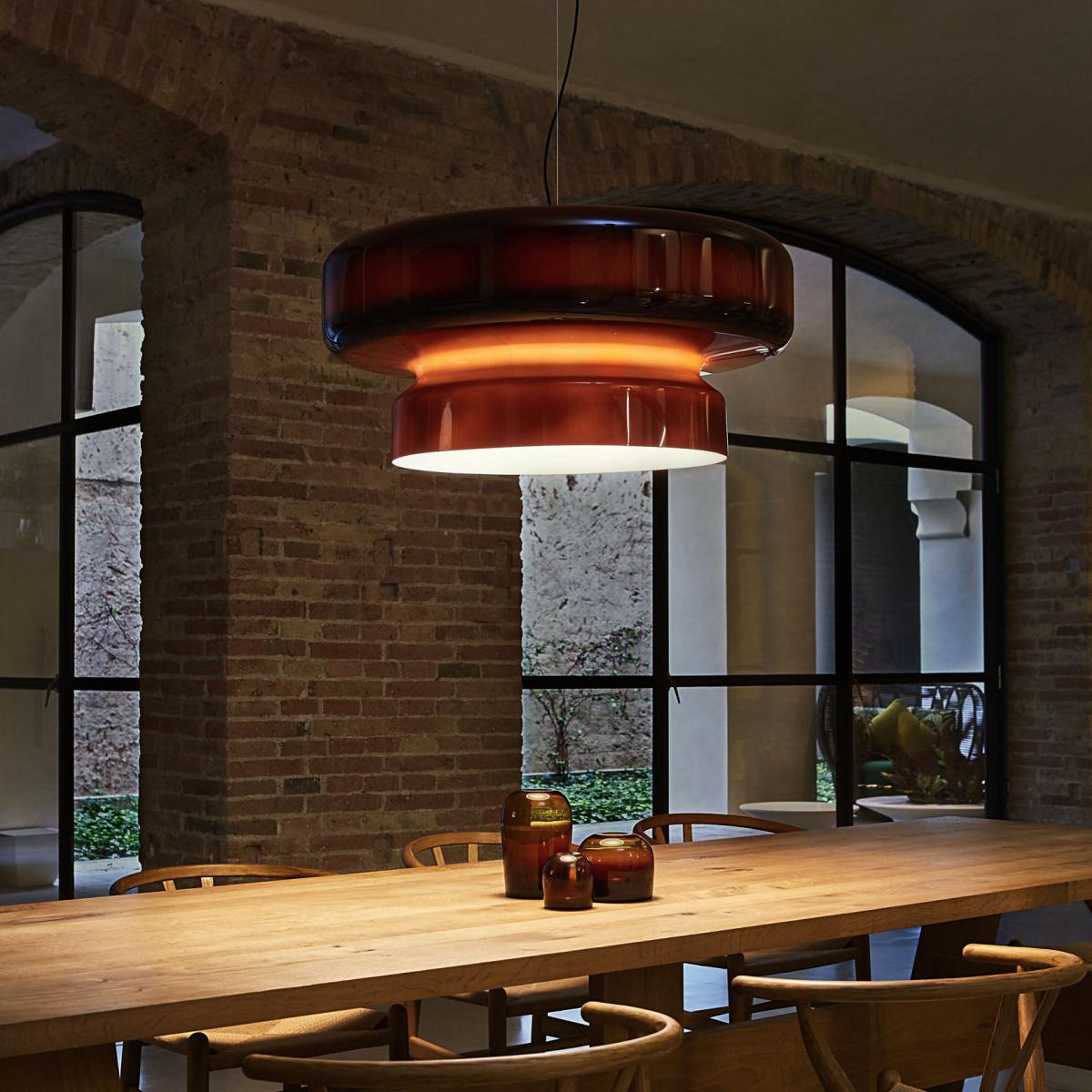 At first glance, you might think that the Pendant Bohemia is made of Blown glass, but this is not the case. In fact, the oversized Lampshade is made from Polycarbonate. The smooth, shiny surface and Toy of color and transparency imitate glass to perfection.