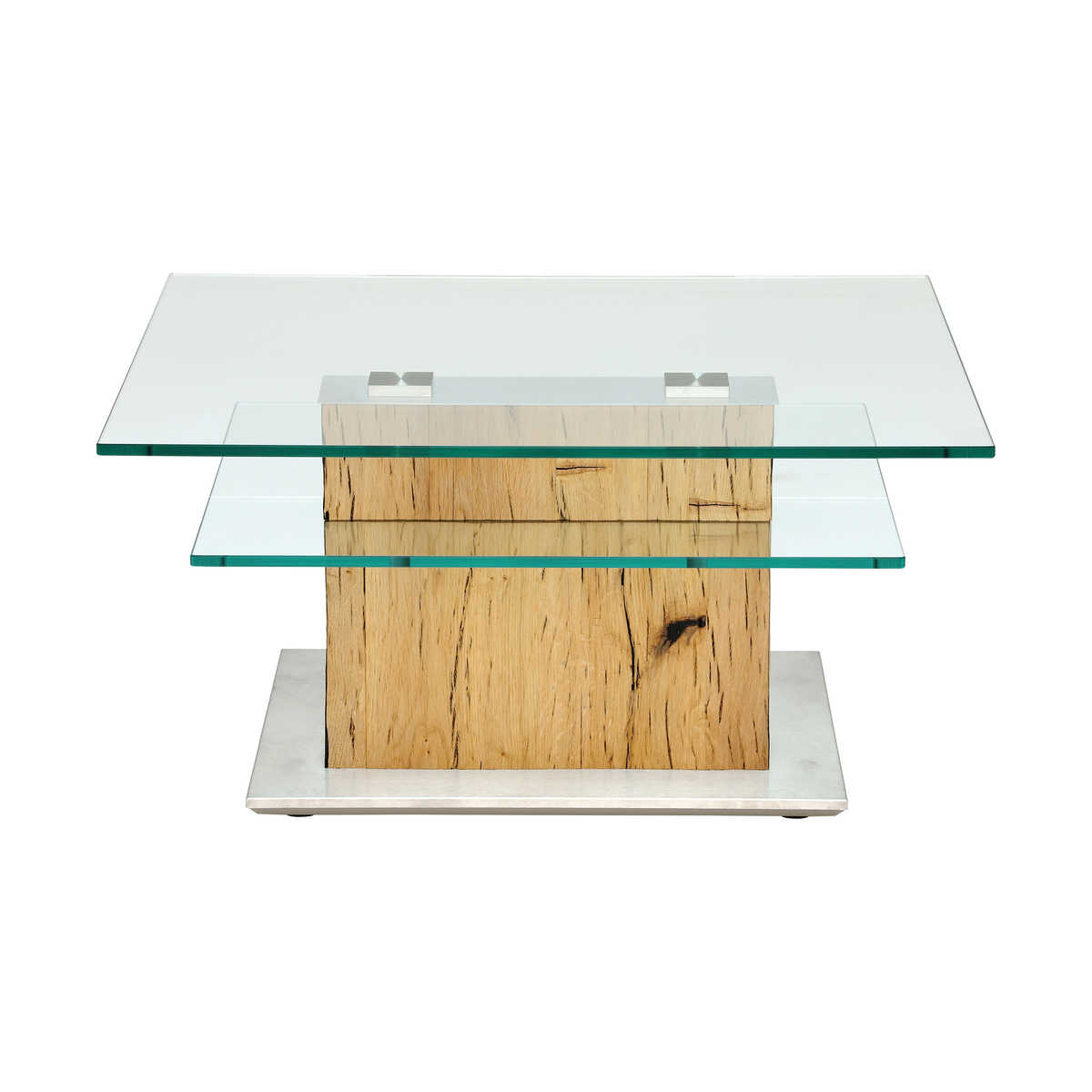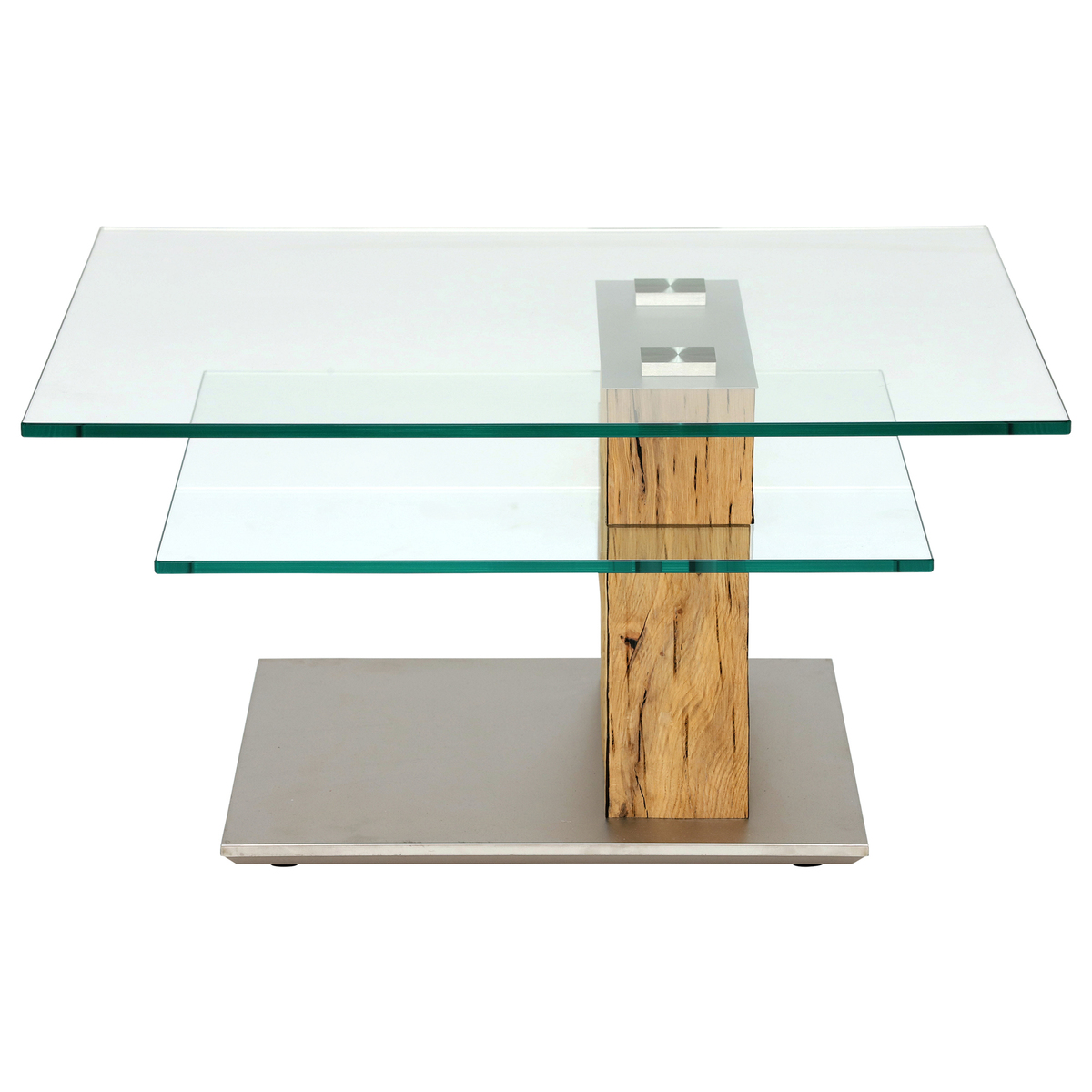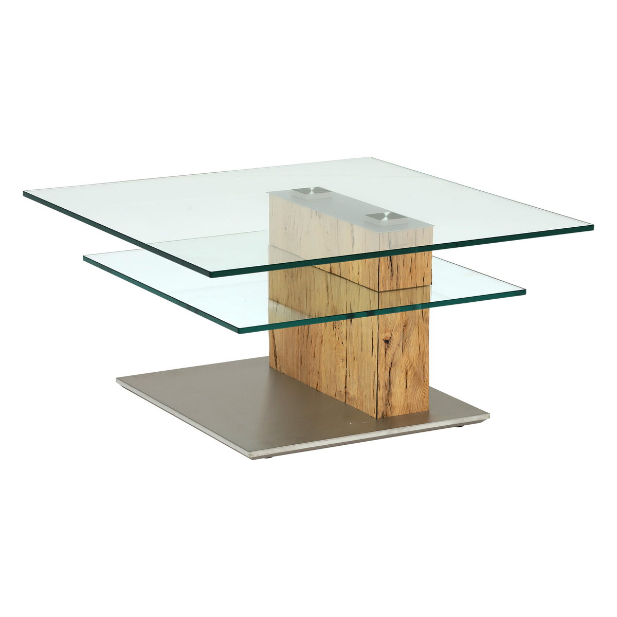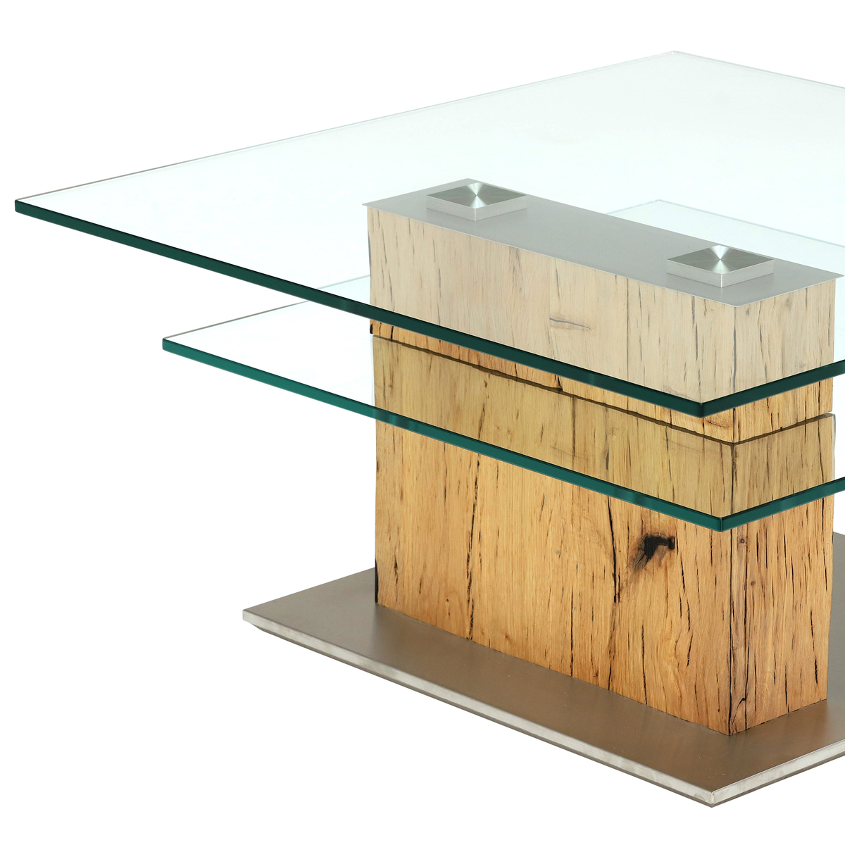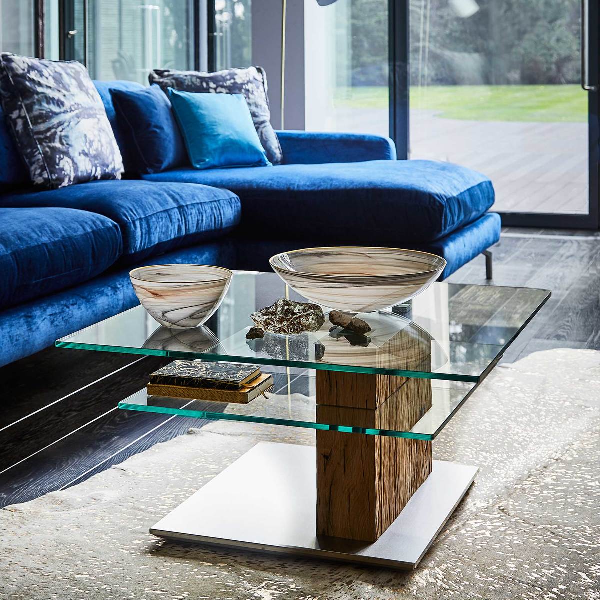A gorgeous, unique design that looks equally as stunning in modern homes as it does in traditional settings, the Bohle square coffee table brings a sense of lightness to any lounge. Its tiered style offers aesthetic qualities as well as additional surface space, with two glass shelves of differing sizes layered atop one another. A rectangular oak pillar stands upon the steel base, in a beautifully natural finish that offsets the table’s contemporary look. The perfect combination of sleek style and characterful wood, the Bohle is sure to catch the eye and intrigue guests for years to come.