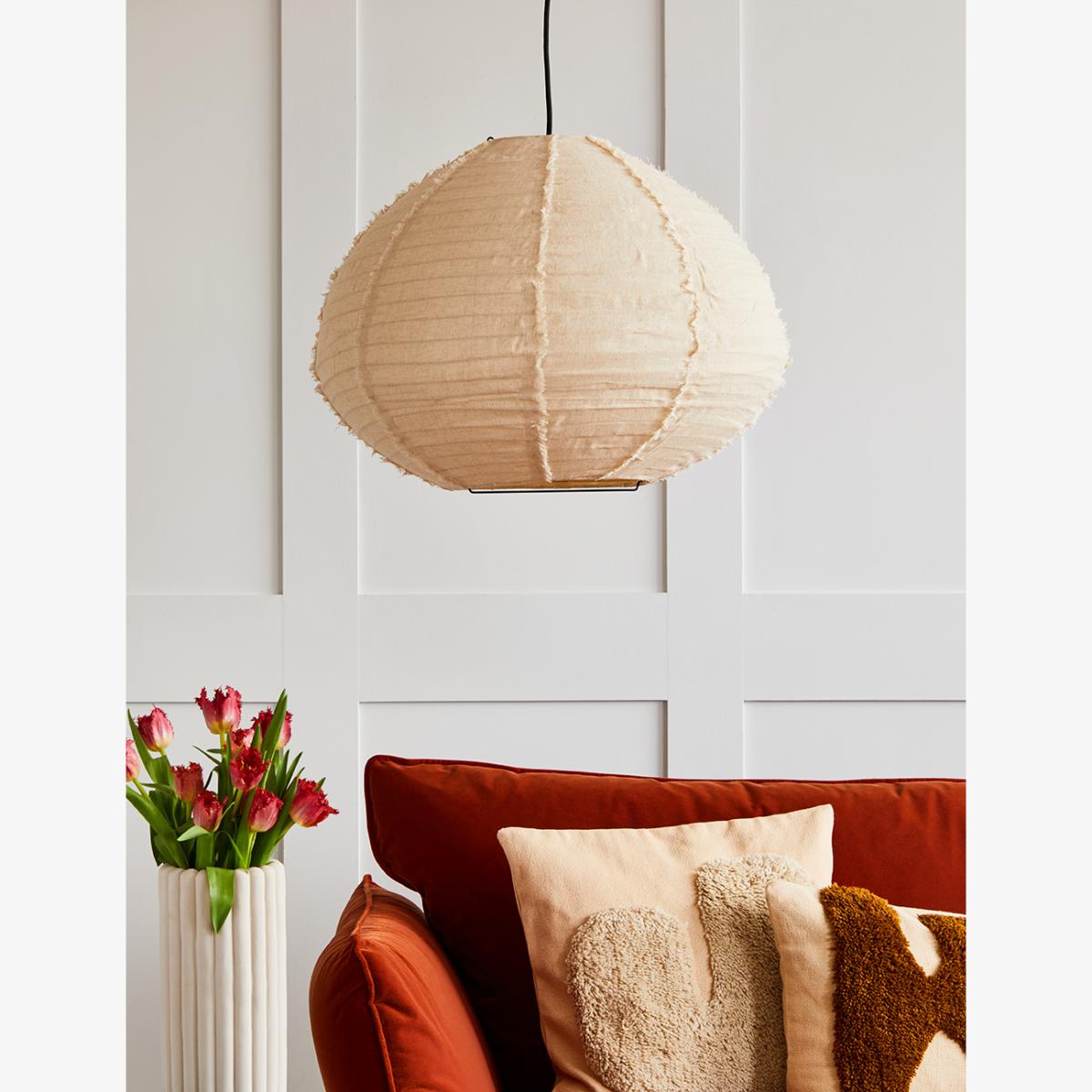 Create a cosy atmoshpere in your home with our Boho Cotton Ceiling Light, a natural linen lamp shade with a frayed fringe seam. Our off-white Boho Cotton Ceiling is perfect for softly diffusing light and adding a warm and welcoming glow to your home. This beautiful linen pendant lamp features a black pin cord and a ceiling cap, taking an E27/40W bulb. The ceiling light is versatile and looks great as a bedroom light, office lighting or living room lighting.