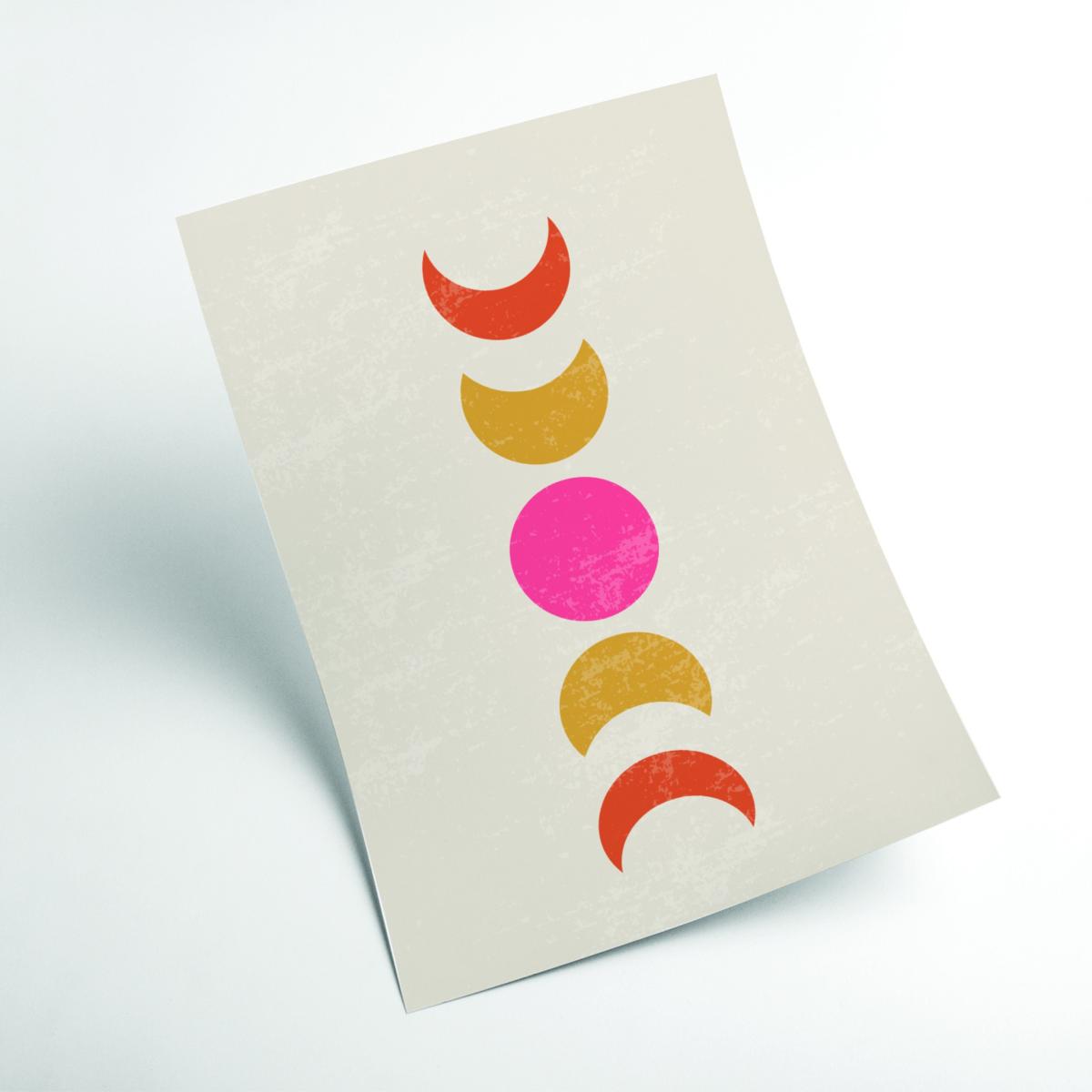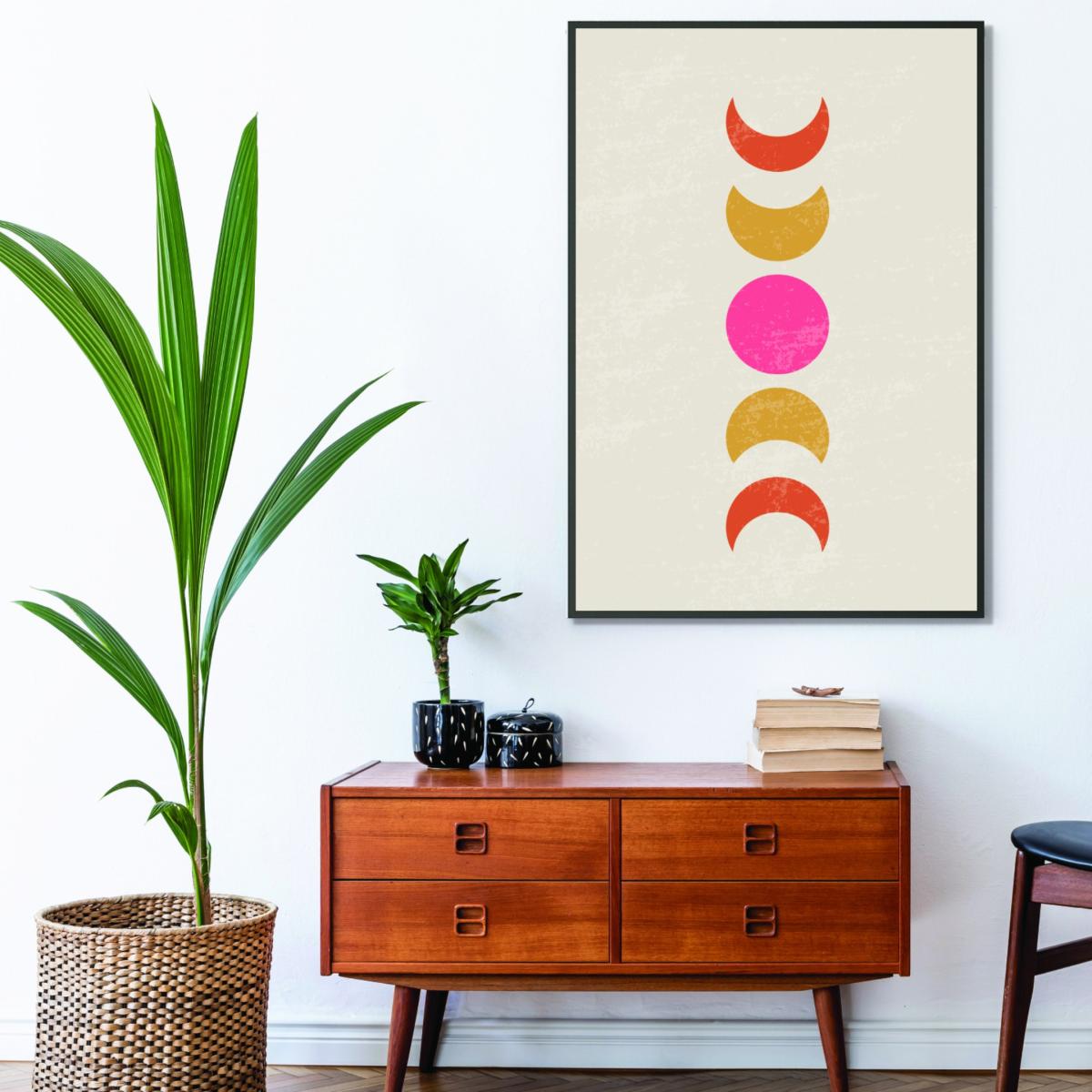 I love this print for its simple, modern take on celestial motifs, making it a versatile piece for a range of interiors. It works particularly well in boho or eclectic spaces, where earthy tones and layered textures allow the colours to pop. It’s also a great choice for contemporary or minimalist schemes if you keep the rest of the decor understated. To style this print effectively, consider pairing it with natural materials like rattan or wood, and arrange it above a neutral sofa or bed to add visual interest without overwhelming the space. Framing it in a sleek, thin border keeps it looking fresh and ensures it remains a focal point on your wall.