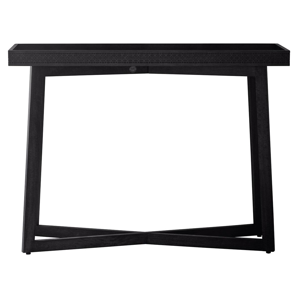 Offering a global traveller look that has a hint of ethnic design detail, this beautiful table is exciting but timeless in its approach and so can be mixed with modern or classic pieces in an eclectic living space. Made using Mango solids with mixed timber veneers of Teak-Mahogany-Mindy Ash and Mango which give contrast and make the inlaid pattern stand out. It has a stunning matt black charcoal finish - the different grains in the mixed timbers stand out in the light and catch your eye with this beautiful detail. The table features a patterned frieze of blind fret work, made from solid mango wood, around the tray-style top.