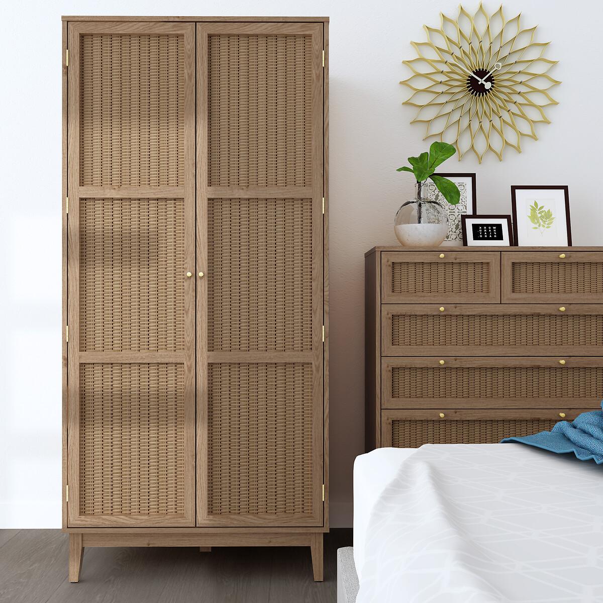 A beautifully designed wardrobe perfect for a boho bedroom. This wardrobe features a shelf a quarter the way down for added storage, with a hanging rail underneath the shelf - perfect for hanging longer items. Just under 6 foot tall, it is perfect for lower ceilings or to allow you to store more items on top. Product details- 2 door wardrobe - Hinged doors with woven frontage- Gold handles and hinges- Clothing rod included- Construction includes MDF, Particle Board, Chipboard- Assembly required. Product Dimensions. Full wardrobe L56 cm x W85 cm x H181cm Leg height 16.5cm Interior shelf W82cm x D55.25cm Hanging rail W82cm. Hanging rail weight capacity 60 KGShelf weight capacity 50 KGWardrobe weight 53 KGPlease note: this product cannot be be delivered to all Offshore Islands Northern Ireland or Republic of Ireland. This product will be dispatched by one of our trusted suppliers. You’ll be contacted by their selected courier about your delivery.