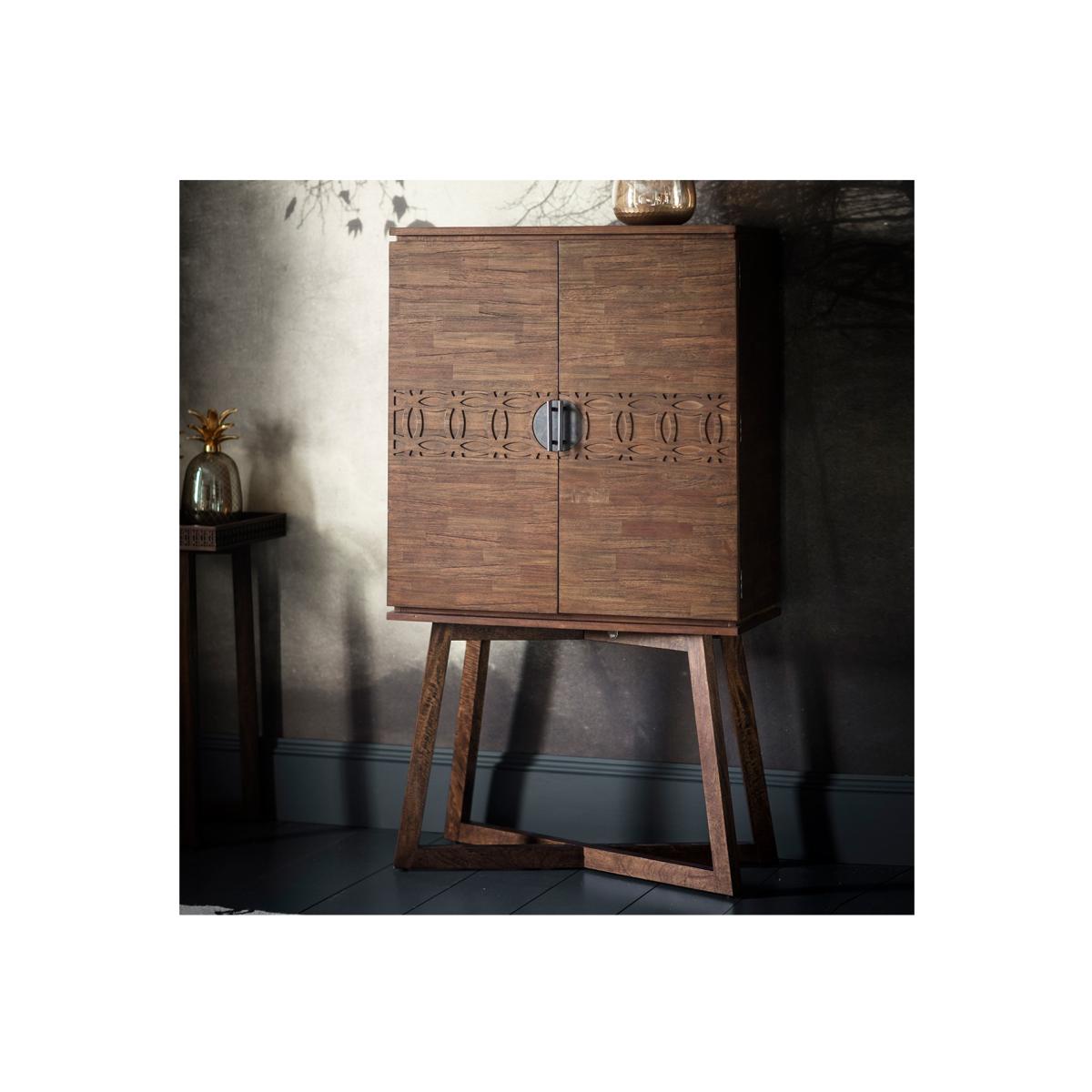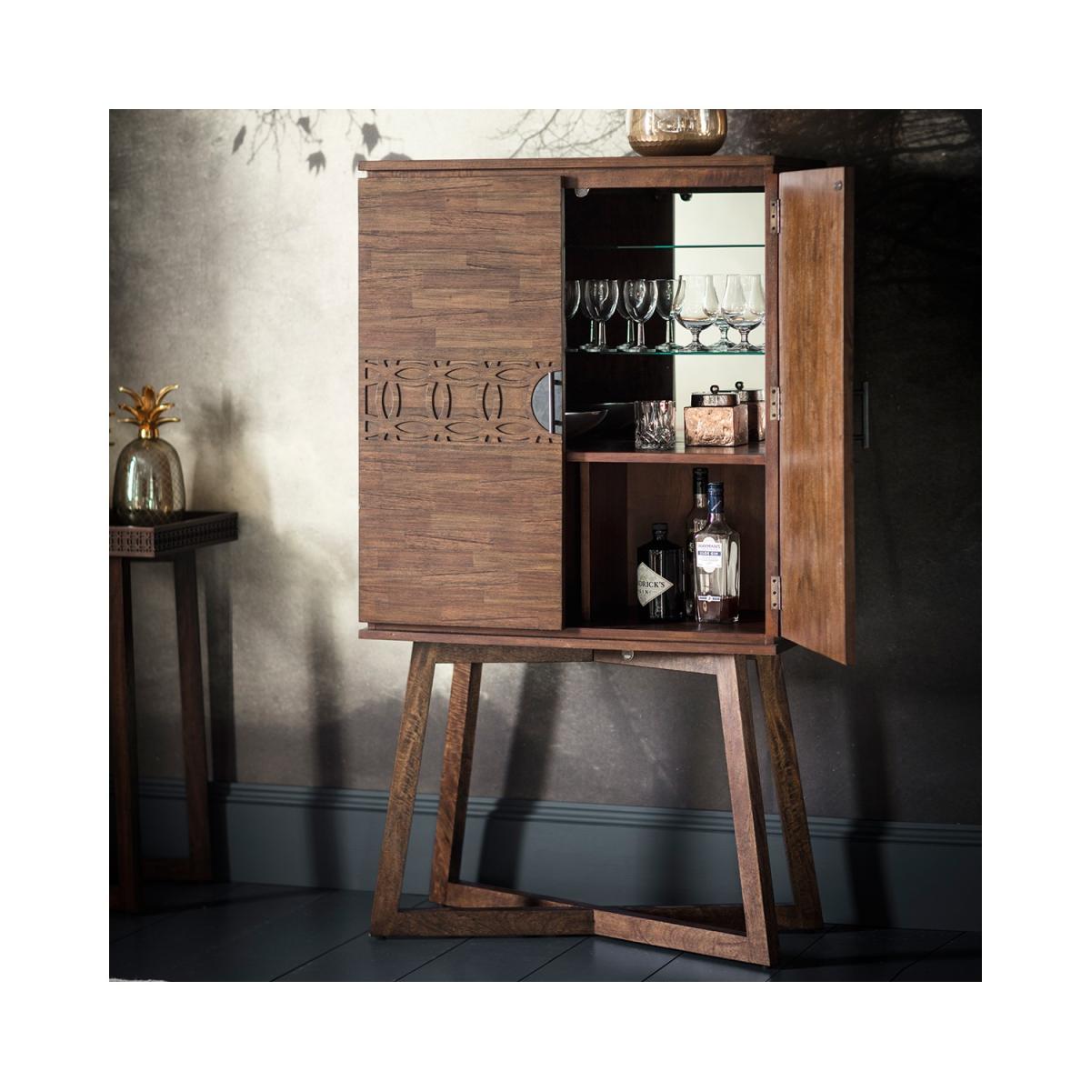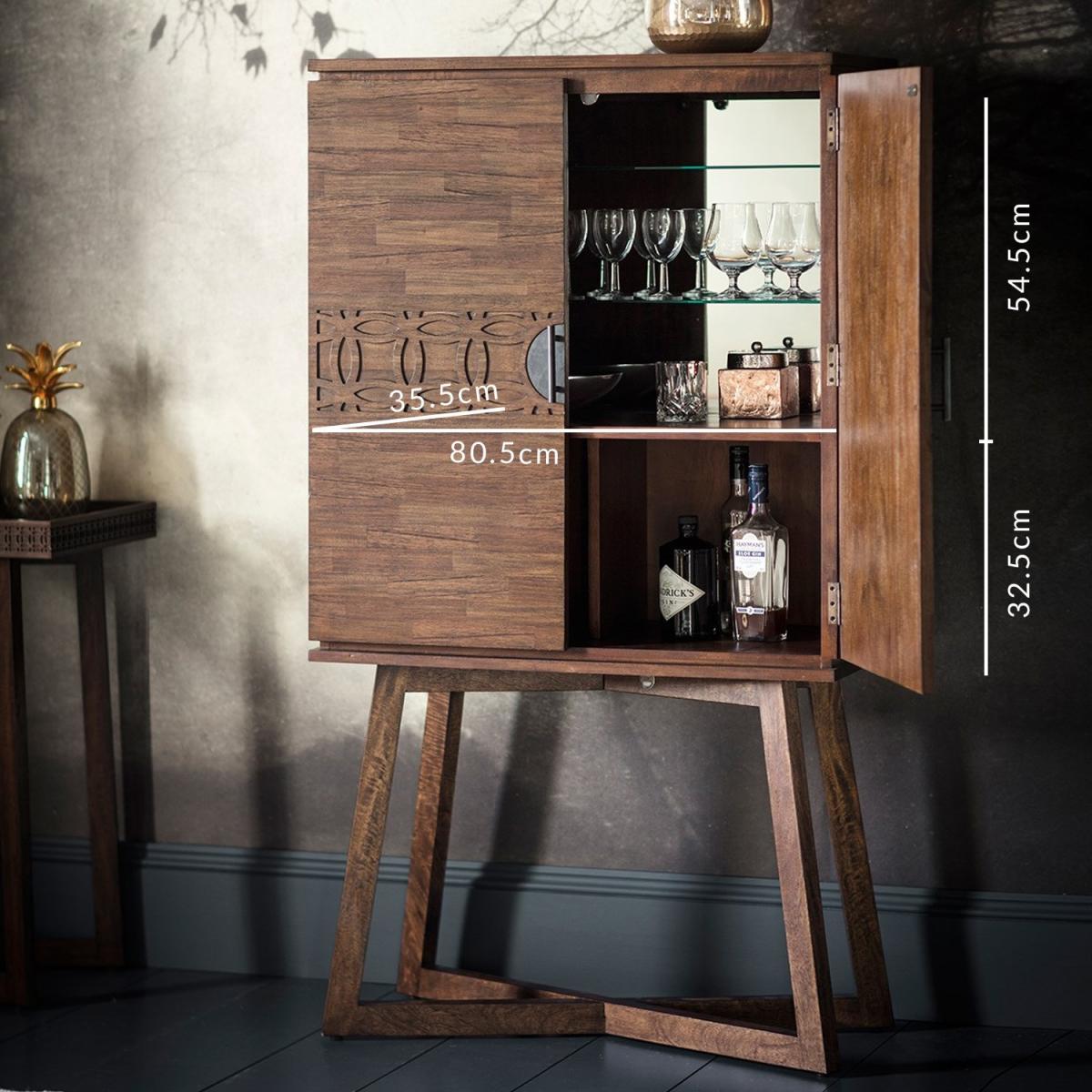 The beautiful Boho Boutique cocktail/display cabinet is made from solid wood with a dark finish with traditional carved detailing. It also has modern crossed legged base to give it that contemporary look.