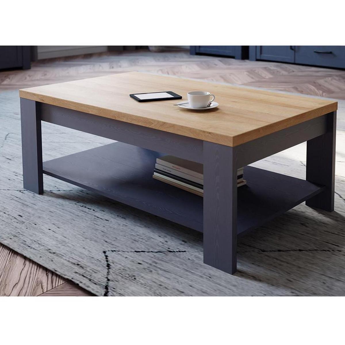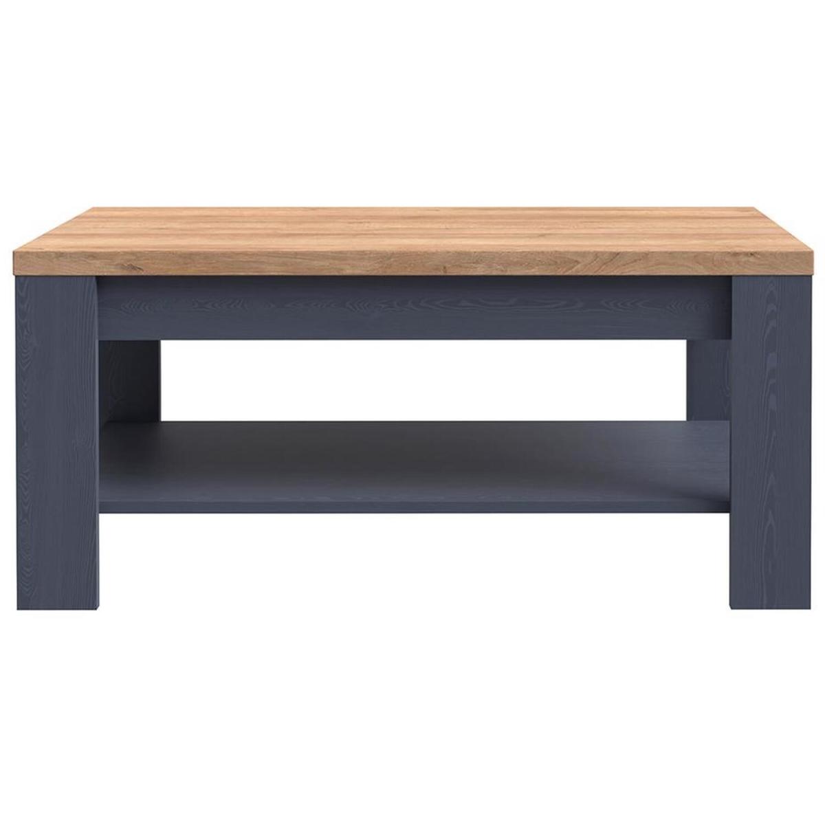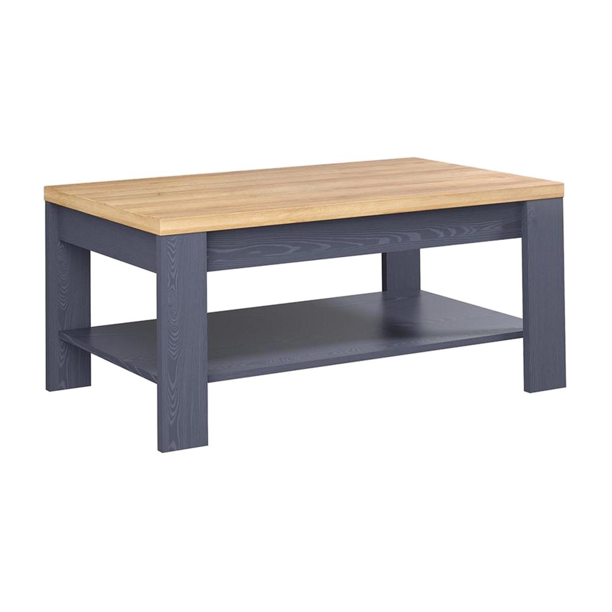 A stunning centre-piece large coffee table with undershelf, finished in a Navy Oak Woodgrain with a Riviera Oak Table Top. Four angled legs provide a sturdy base and support for the full width undershelf. Ideal for storage and display alike. Delivered in 1 box for self assembly. Once assembled , this Coffee Table measures Width 100 cm x Depth 60 cm x Height 45.7 cm.