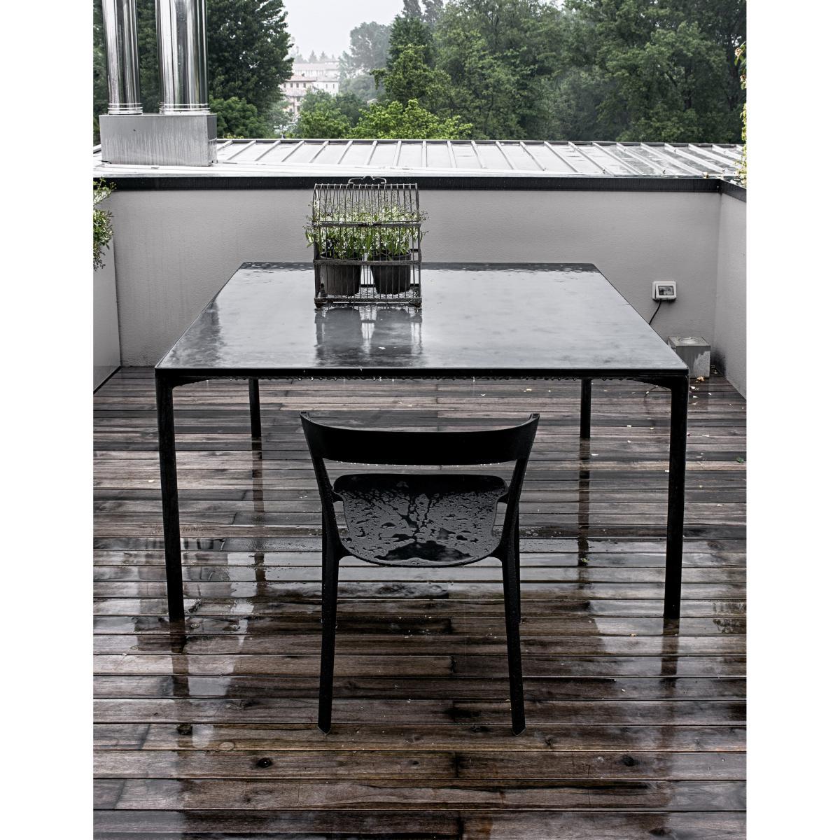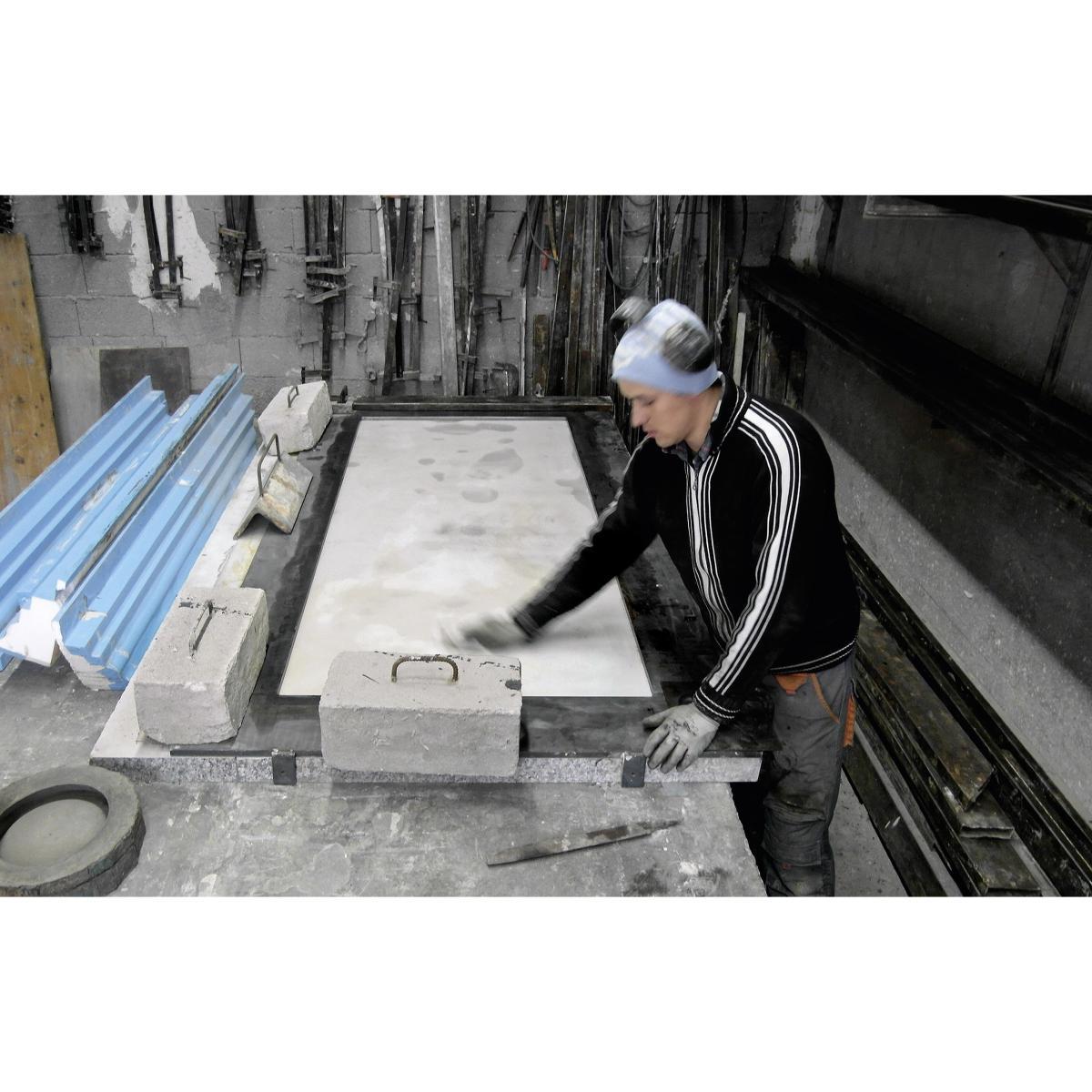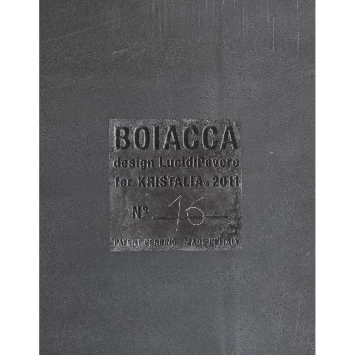 “Imperfection is beauty”, said Marilyn Monroe one day, perhaps unaware –or perhaps not- of reintroducing a philosophical concept that spans centuries and distances: the Japanese concept of “wabi-sabi”. The ineffable beauty of humble, modest and slightly irregular things, which makes them unique. In modern architecture, visible cement, with its rough surface, becomes a living material, the protagonist of new aesthetic appeal, which is both traditional and industrial. The Boiacca table, designed by Luca Pevere and Paolo Lucidi, amazes and fascinates when you first see it due to its cement, a very unusual material for furnishings, and to its visibly slim nature and the audacity with which the slight imperfections of this raw material are highlighted. Under the top, it has an identification number, the signature of a unique personality, just as movie stars left their footprints on the pavement of Hollywood Boulevard (1). Moreover, Boiacca arises from a series of studies and prototypes intended to obtain a table that is not too heavy and easily moved even by two people, despite being made of cement. This was achieved by inserting a metal core in the legs and creating a solid but quite slim top (13 mm). To understand the magnitude of the process used to make it lighter in terms of materials and less formal, just consider that the legs of the first prototype weighed 10 kg and had a slightly stiffer and awkward shape, whereas the legs of the final version weigh about 4,5 kg, and have graceful fluid plasticity. The cement used for this design project involves a special formula. The table has been treated with a transparent finish that gives its surface tactile appeal and makes it resistant to water. Boiacca is a unique design project. With its slightly uneven nature, the raw material used makes each table different from any other: this feature is highlighted by the number that distinguishes each product.