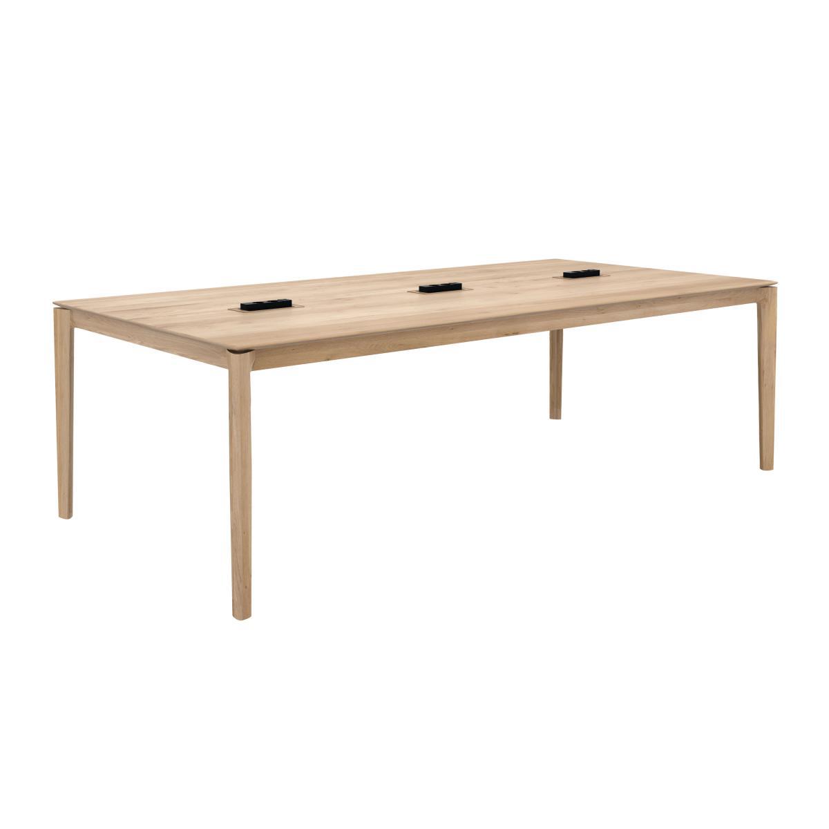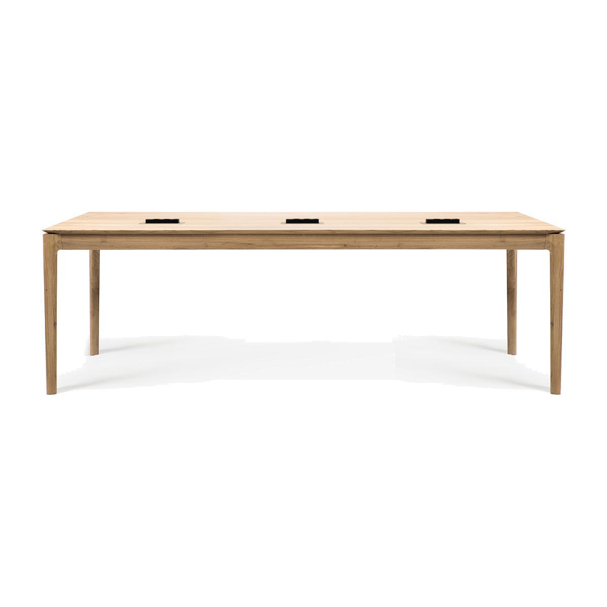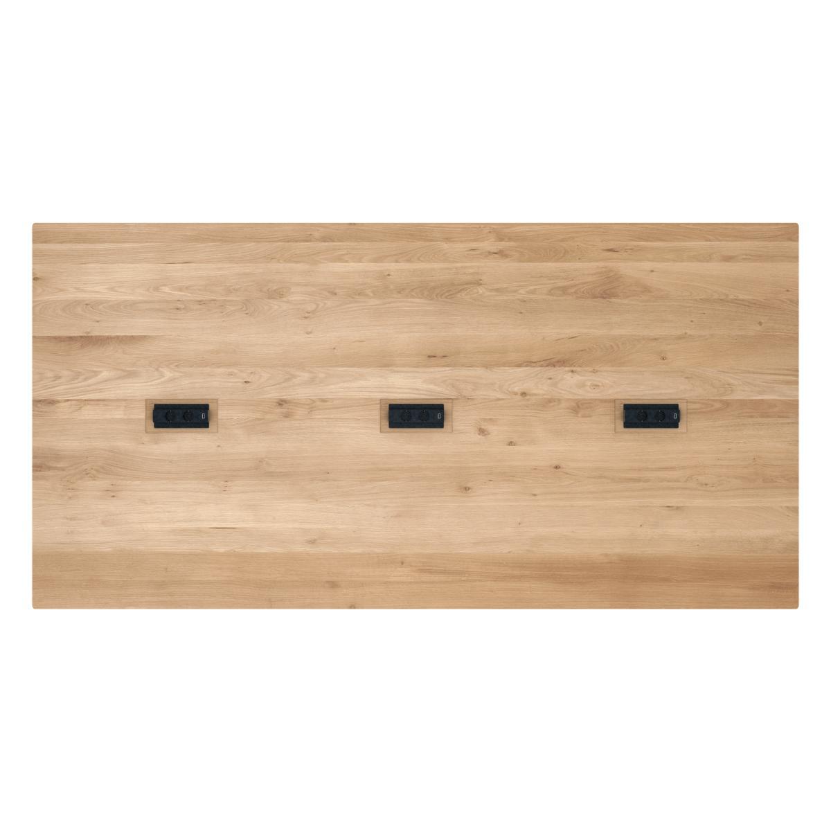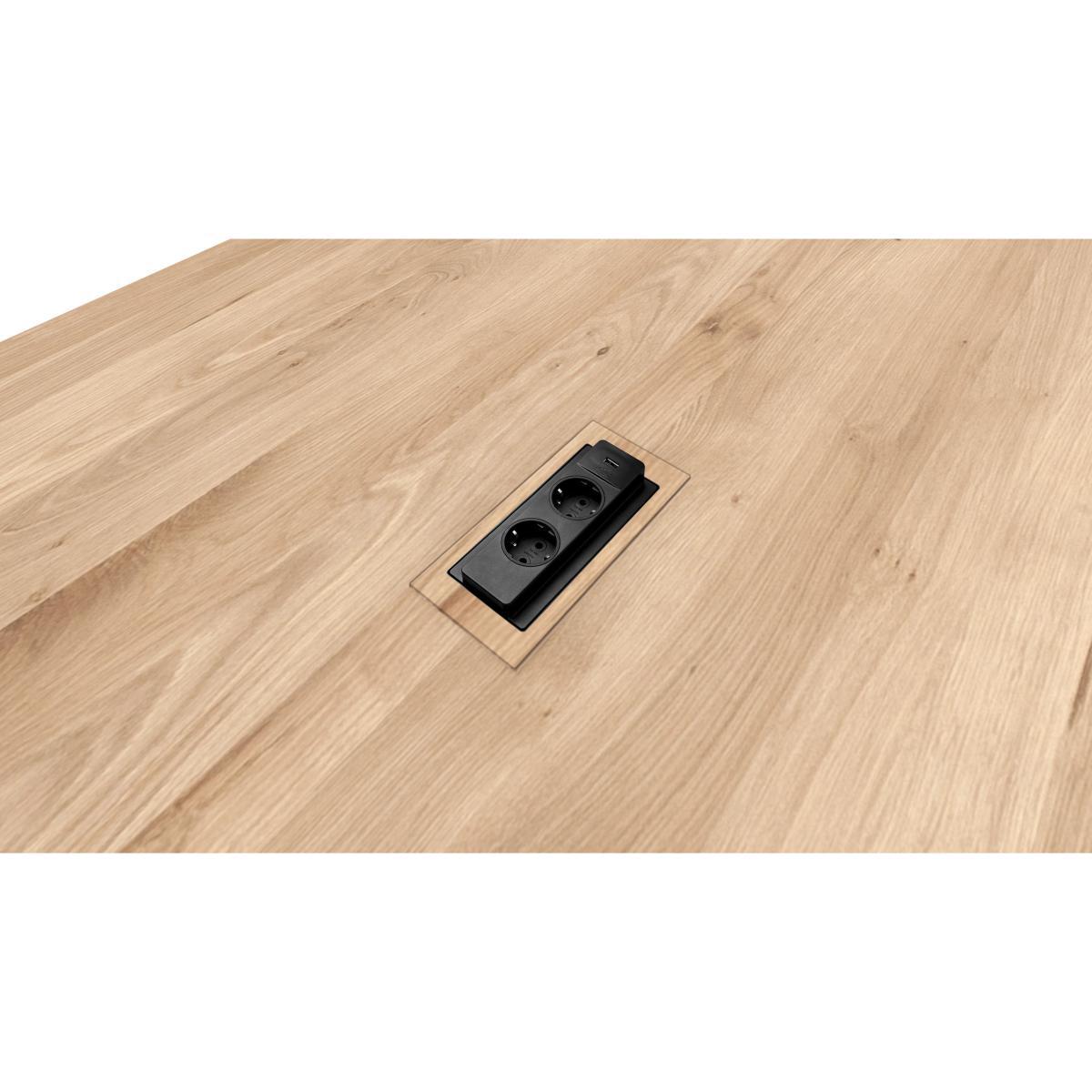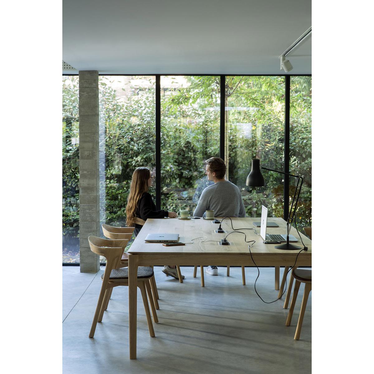 For twenty-five years, Belgian brand Ethnicraft has paid tribute to the beauty and authenticity of solid wood. Timeless, extremely strong and durable, these are quality pieces of furniture that age wonderfully and are passed down from generation to generation. Handcrafted, Ethnicraft furniture is the result of exceptional know-how. Behind the apparent simplicity of the design hides a constant search for innovation. Integrating advanced techniques into the creative process, each new design is worked out down to the smallest detail. Respectful of the environment, the wood used comes from sustainably, responsibly managed European forests (FSC Co. C certification which attests that the wood was produced with respect for the environment and social values). This very large solid oak table has been specially designed for co-working spaces. Very solid and functional, it’s equipped with three socket-outlets so you can use your electronic equipment. Each block includes two electrical sockets as well as a USB port. The black sockets are retractable: once your work is completed, they go back discreetly into the top. This co-working desk makes it easy to set up a connected space in an open area, meeting room or break room. The generous dimensions of the Bok desk allow two people to sit facing each other while retaining a large workspace. The Bok table has a warm, authentic look. Its clear, refined design makes it a modern, timeless piece capable of blending into any decor style without ever becoming boring. The finishes are perfect and extremely neat. The top with its bevelled edges is slightly raised at the legs, which brings lightness to the silhouette. With its slightly tapered legs, the Bok table is airy, delicate and extremely robust.