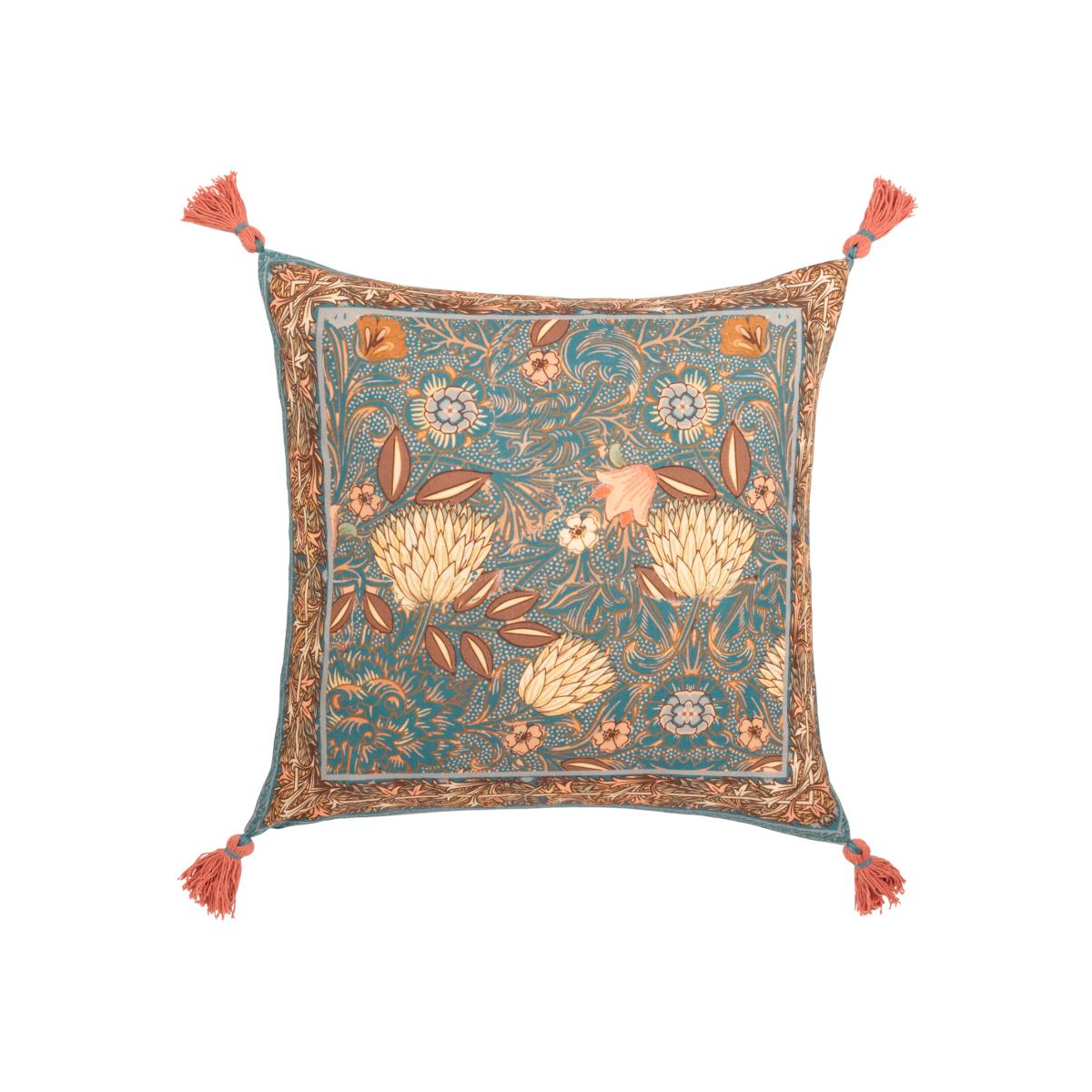 Inspired by arts and crafts, the Bolais cushion fuses mesmeric colour combinations together to create a busy palette of tones and floral patterns which are all printed on incredibly soft cotton and set against a deep toned teal background. Surrounded by a contrasting tassel on each corner for a bit of added style, this cushion brings a splash of colour to many contemporary interiors.