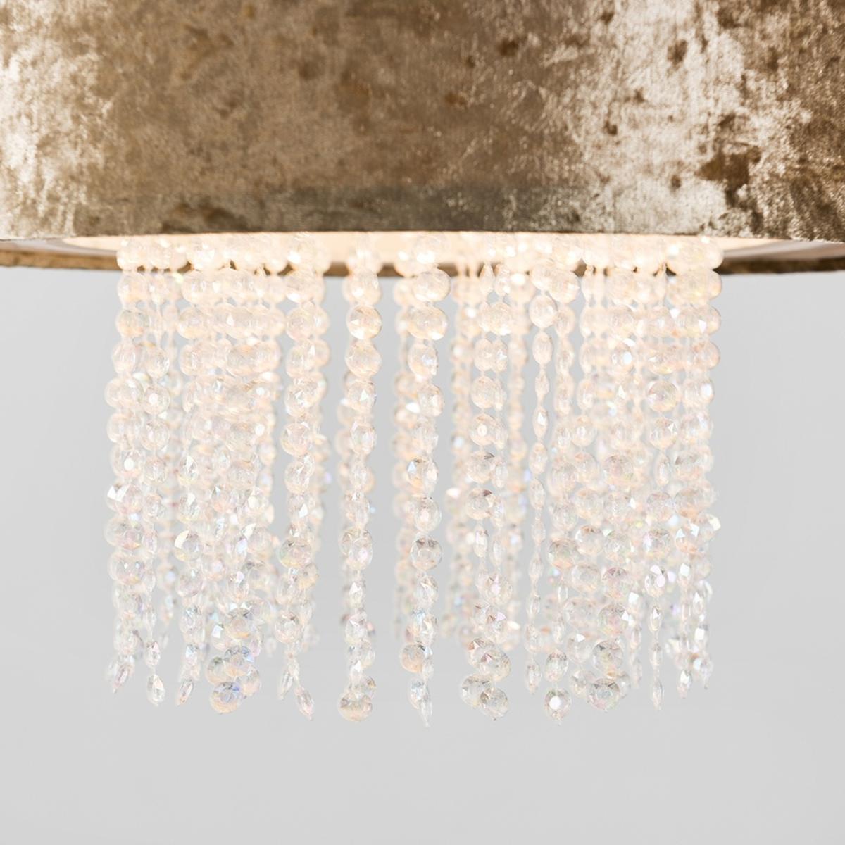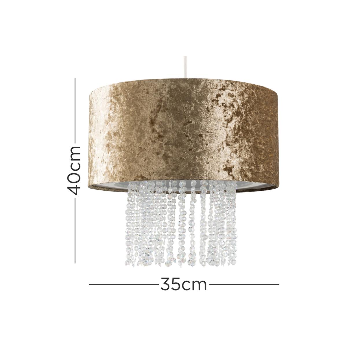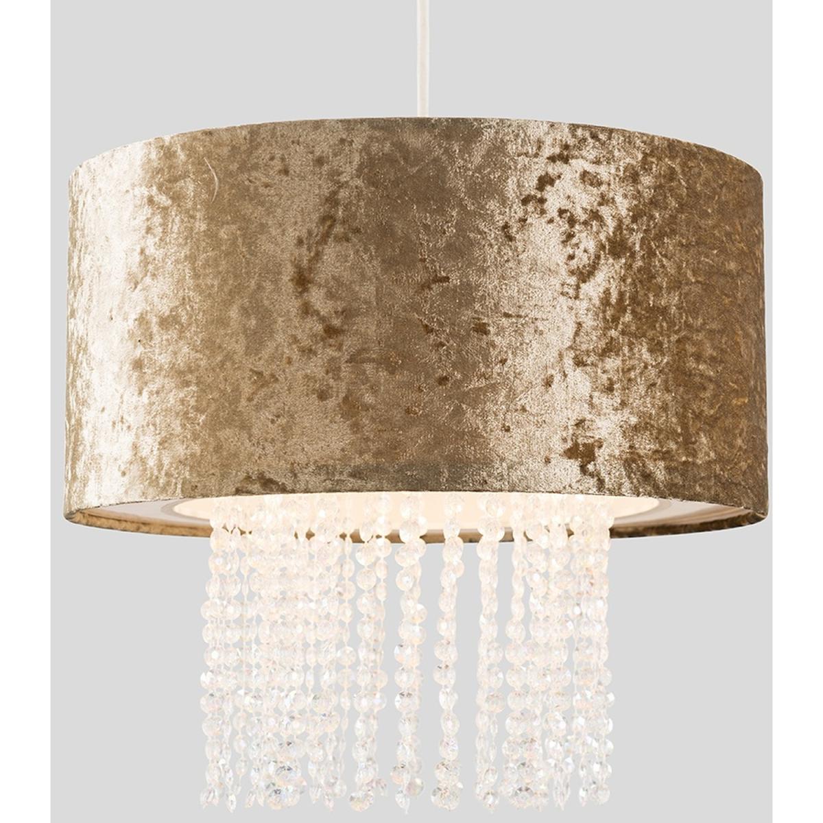 Modern cylinder ceiling pendant light shade in a gold velvet finish, which features clear acrylic jewel droplets which cast subtle patterns around the room when lit. Ideal for lounges, dining rooms, bedrooms, hallways and other areas around the home. Easily fits to your existing ceiling lampholder - no electrician required. Ceiling lights are usually the main light source in a room. The right fitting can create a statement and complete your living space look.