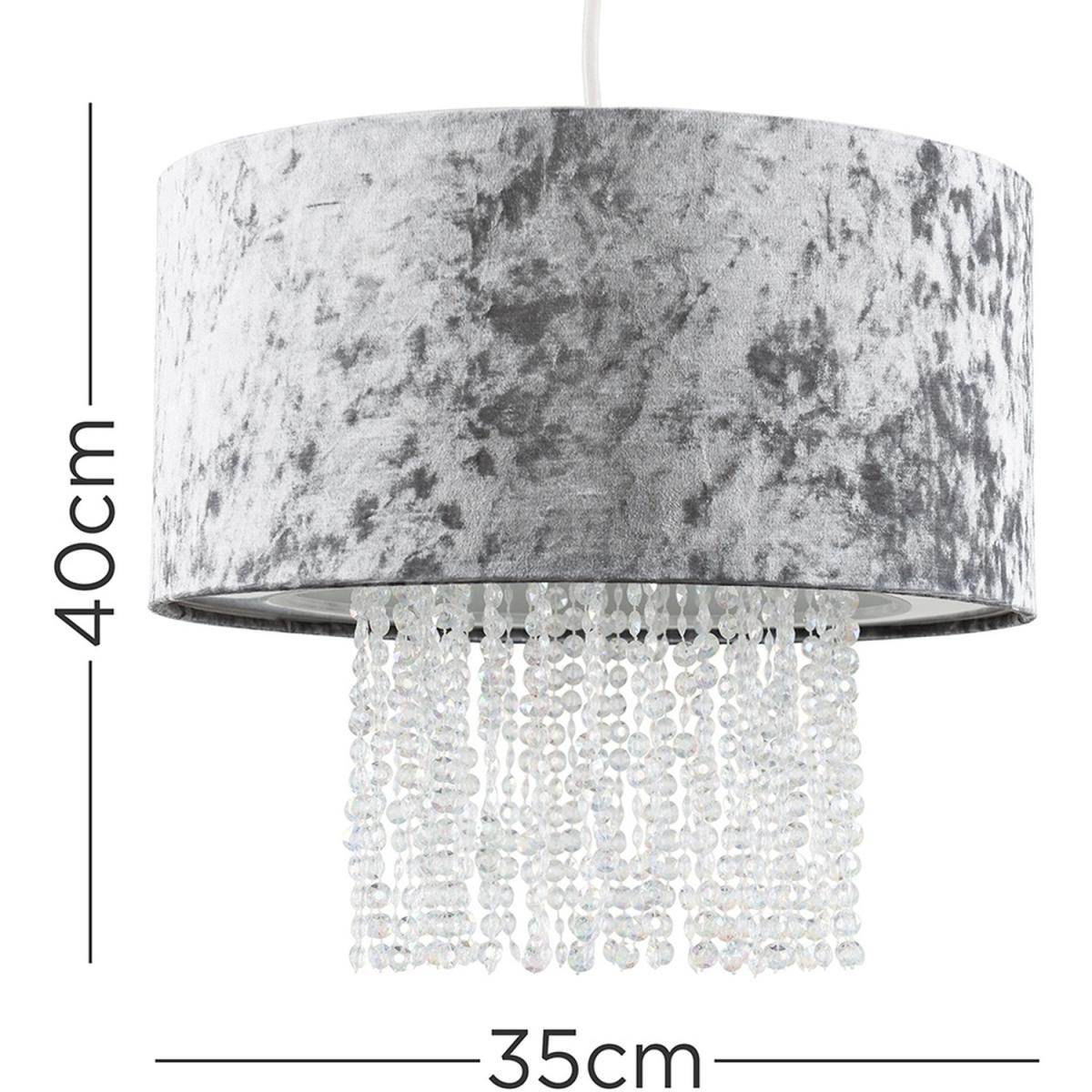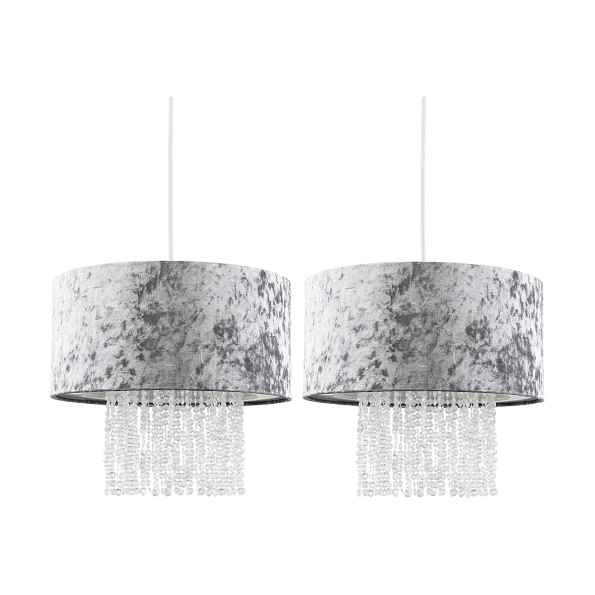 Pair of modern cylinder ceiling pendant light shades in a silver grey velvet finish, which features clear acrylic jewel droplets which cast subtle patterns around the room when lit. Ideal for lounges, dining rooms, bedrooms, hallways and other areas around the home. Easily fits to your existing ceiling lampholder - no electrician required. Ceiling lights are usually the main light source in a room. The right fitting can create a statement and complete your living space look.