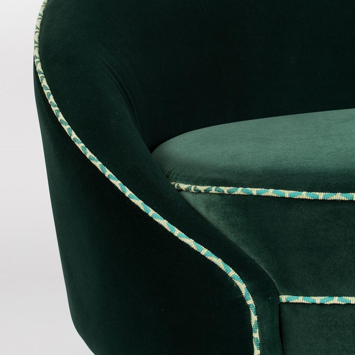 I love this piece for its bold, contemporary silhouette and rich velvet upholstery, making it a statement addition to both modern and eclectic interiors. It works particularly well in sophisticated living spaces or lounges that embrace colour and texture, adding a touch of playful elegance. Practical styling tips include pairing it with metallic or marble side tables and layered cushions for comfort and visual interest. Its deep green hue pairs beautifully with neutral tones or contrasting colours like blush pink or gold accents, making it a versatile centrepiece that can anchor a variety of colour schemes.