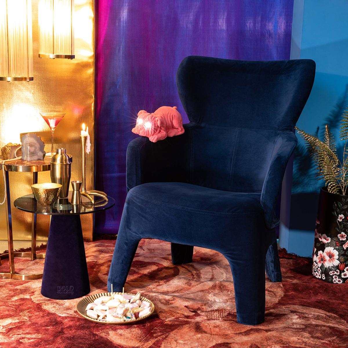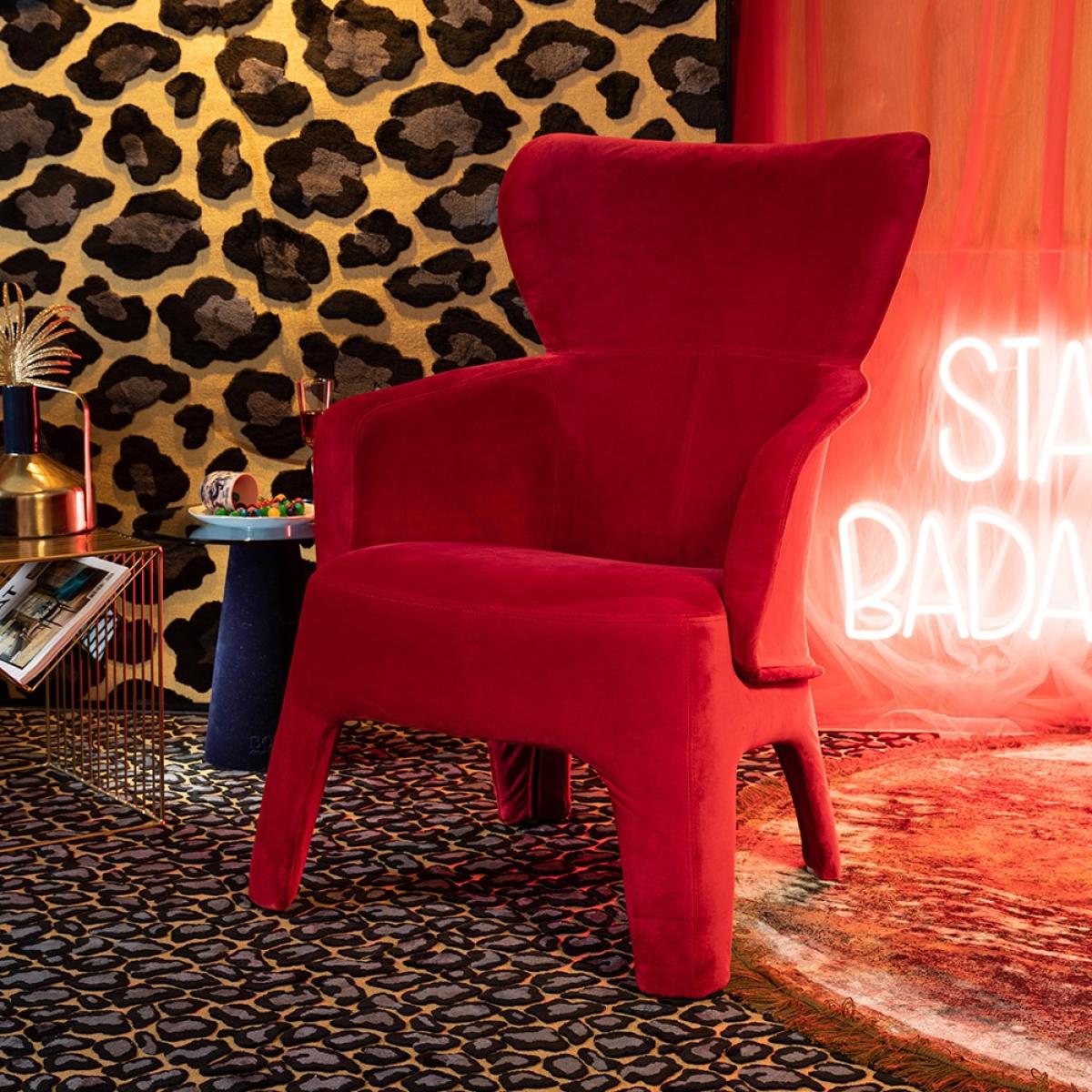 I love this armchair because it adds a playful yet sophisticated touch to any interior. Its bold design and vibrant colours make it a perfect statement piece in eclectic or vintage-inspired spaces, but it can also inject personality into more subdued modern styles. It works well as an accent piece in living rooms, bedrooms, or even a cosy reading nook. For styling, pair it with contrasting textures like velvet cushions or a soft throw to enhance its plush appeal. Keep surrounding furniture fairly simple to let the chair stand out, and consider mixing it with other colour pops or botanical accents, as seen here, to create a lively and inviting space.