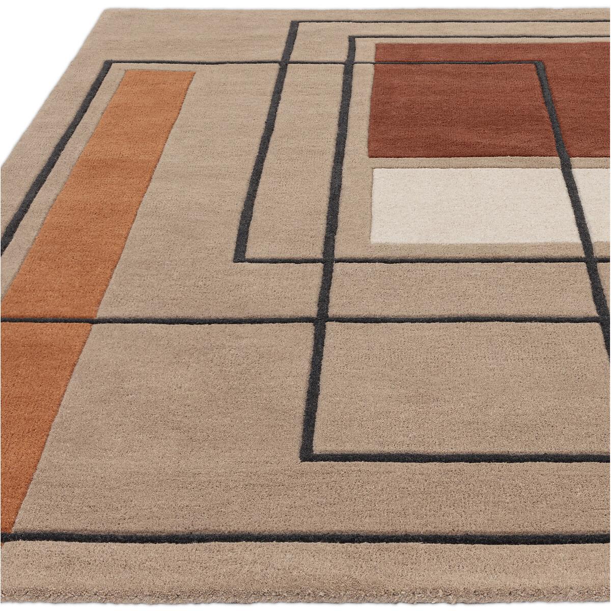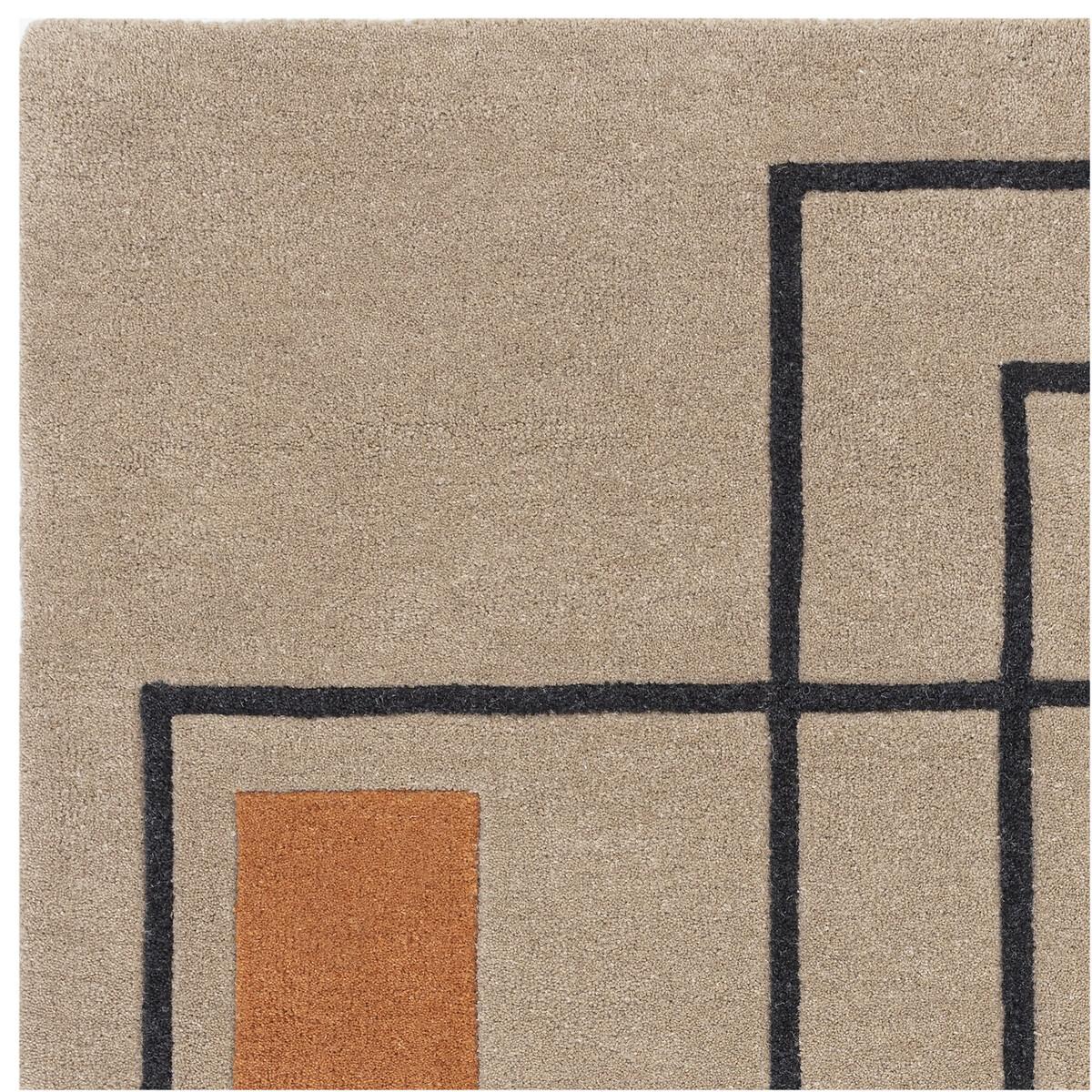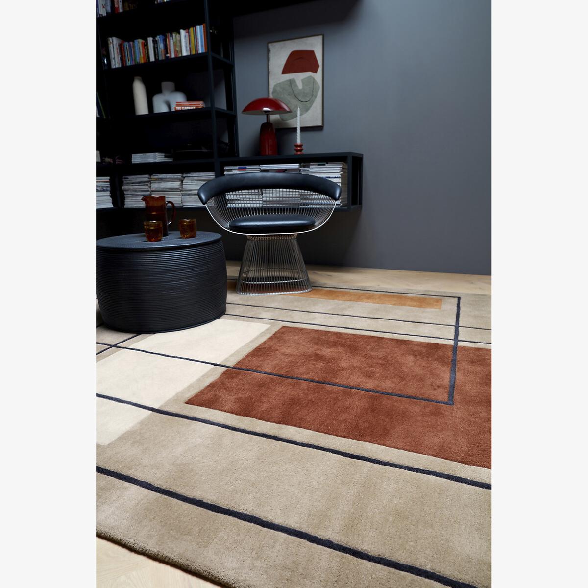 The bold outline rug is a fantastic statement piece that combines simplicity with a graphic edge. I love how its crisp lines and warm, earthy tones grounding a space, making it ideal for modern or contemporary interiors. It works well in living rooms or bedrooms, especially when paired with neutral furniture to allow the rug’s design to stand out. Practical styling tips include layering it over a larger neutral rug for added texture, or pairing it with sleek, minimalist furniture for a clean, cohesive look. Its 100% wool construction also ensures durability and comfort underfoot, making it as functional as it is stylish.