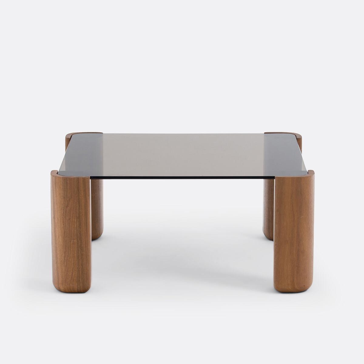 A base in solid walnut with a smoked tempered glass top... Boldi has a sculptural silhouette that evokes 1970's design. Designed by La Redoute Interiors.