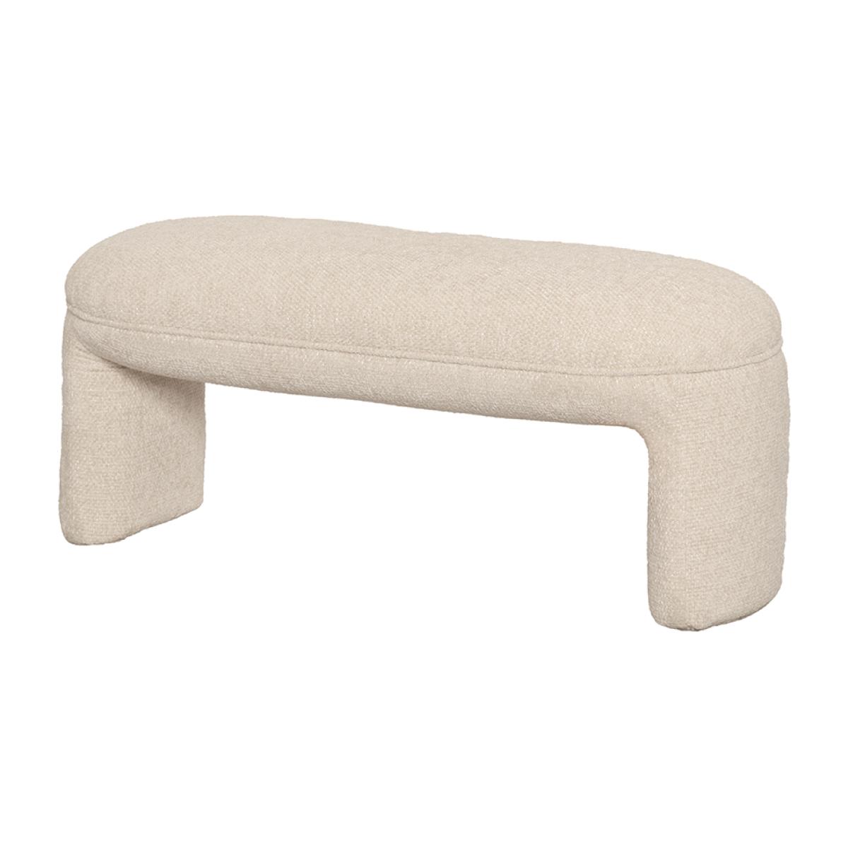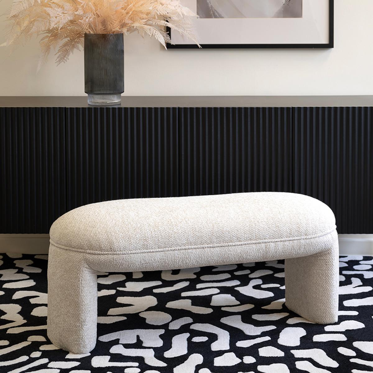 A distinctive two-legged bench with a playful puffy form. Ideal for use as a hallway bench or for occasional lounge seating. Upholstered in a soft, luxurious, polyester chenille fabric.