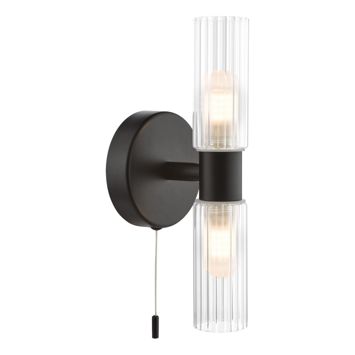 Bolton 2-light bathroom wall light, featuring a vertical design with ribbed glass outer shades, frosted glass inner shades and a matte black fixture. Height: 25cm Width: 10cm Projection: 11cm Removable pull chord switch Rated IP44 - Suitable for bathroom zones 1 and 2 Requires 2 x G9 lightbulbs (not included) Enhance your bathroom with the sleek and stylish Bolton wall light, designed to offer both functionality and modern appeal. The light boasts ribbed glass outer shades paired with frosted glass inner shades, creating a soft, diffused glow that complements your bathroom's ambiance. The matte black fixture adds a contemporary touch, making it a perfect fit for a variety of bathroom styles. Rated IP44 for protection against water splashes, this wall light is not only visually striking but also practical for bathroom settings. Ideal for placing next to mirrors or as accent lighting, the Bolton wall light combines durability with chic design, elevating your bathroom with both style and performance.