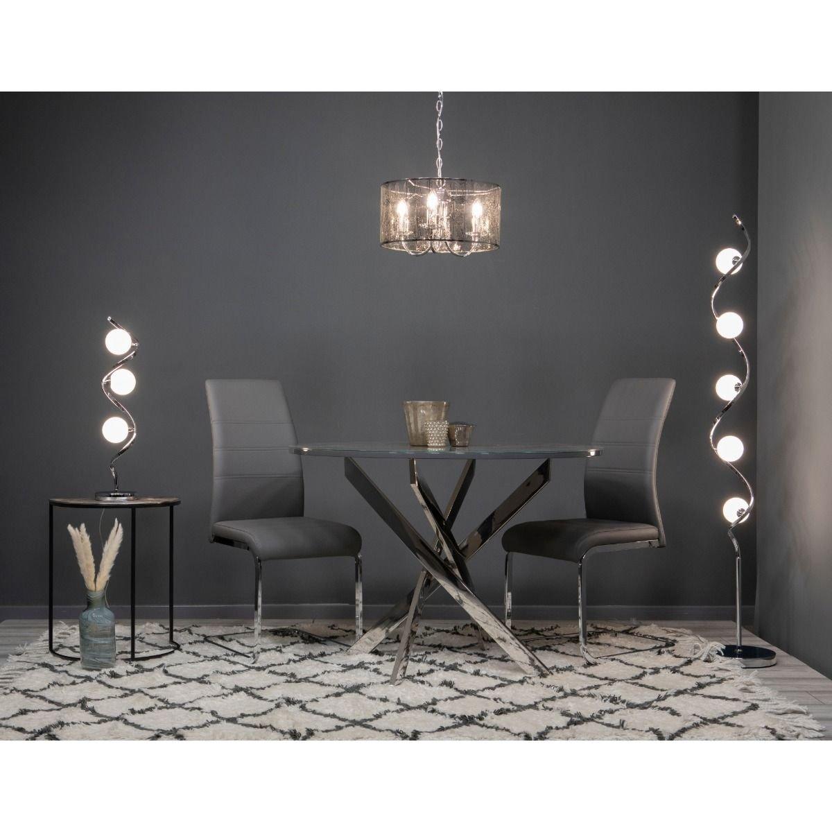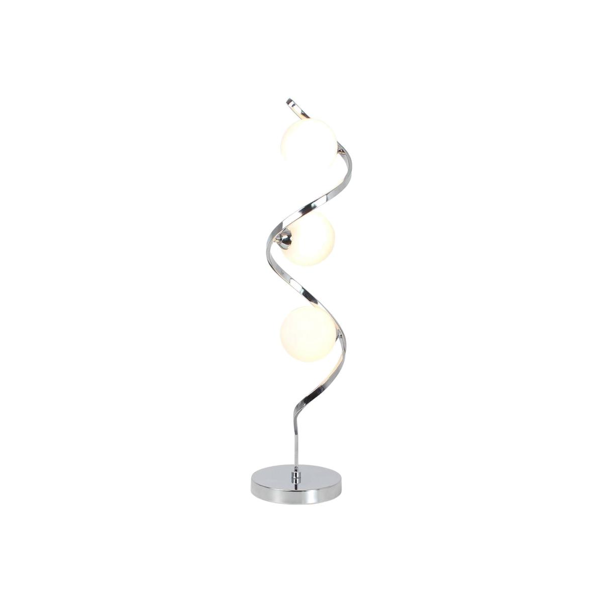 Contemporary table lamp boasting a polished chrome finish. An elegant addition to your living space, this table lamp is part of the Bombo range from Pagazzi Lighting. Finished in polished chrome, the fitting features a swirled arm and comes complete with matt opal glass spheres to house each light bulb. It is perfect for use in living rooms, hallways and bedrooms. We recommend using our 3w LED G9 capsule bulbs which are a great replacement for standard halogen bulbs.