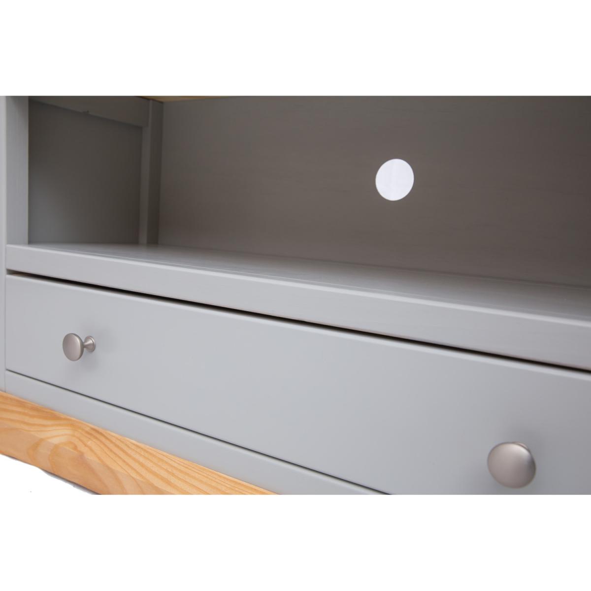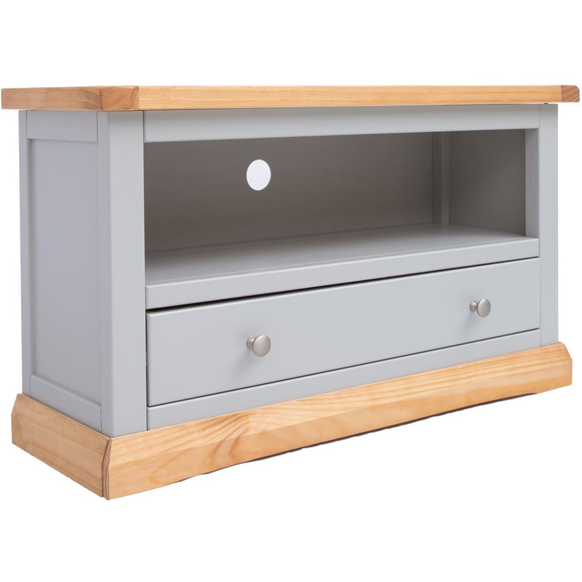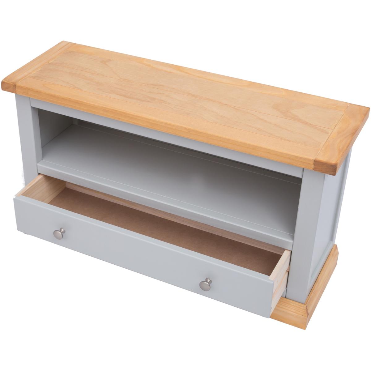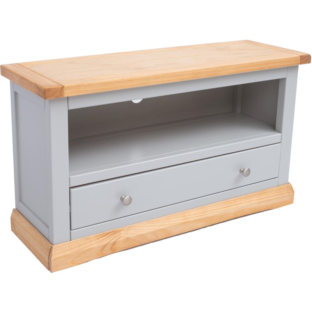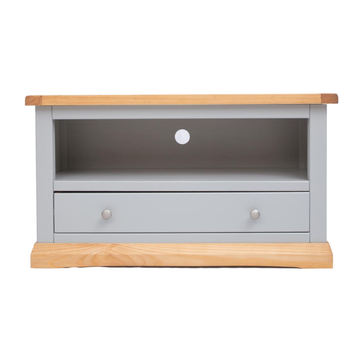 Our Bomporto collection has a simple but pleasing design and is produced by our skilled craftsmen to the highest standards using responsibly sourced wood and veneers. All tops are made using a combination of solid pine wood and veneers and are carefully hand waxed giving it a great look. The body is finished with a high quality eco-friendly water base paint in an light grey colour. A compact and stylish TV unit with a full width drawer at the bottom to store your remote controls and games consoles out of the way. Above the drawer is an open space for digital boxes or players, access for wiring is made easy by the cable holes cut out in the back of the unit. There is plenty of space on the top for your TV to be placed. These attributes combined with a simple construction for easy assembly makes it a great value product to be taken home today.