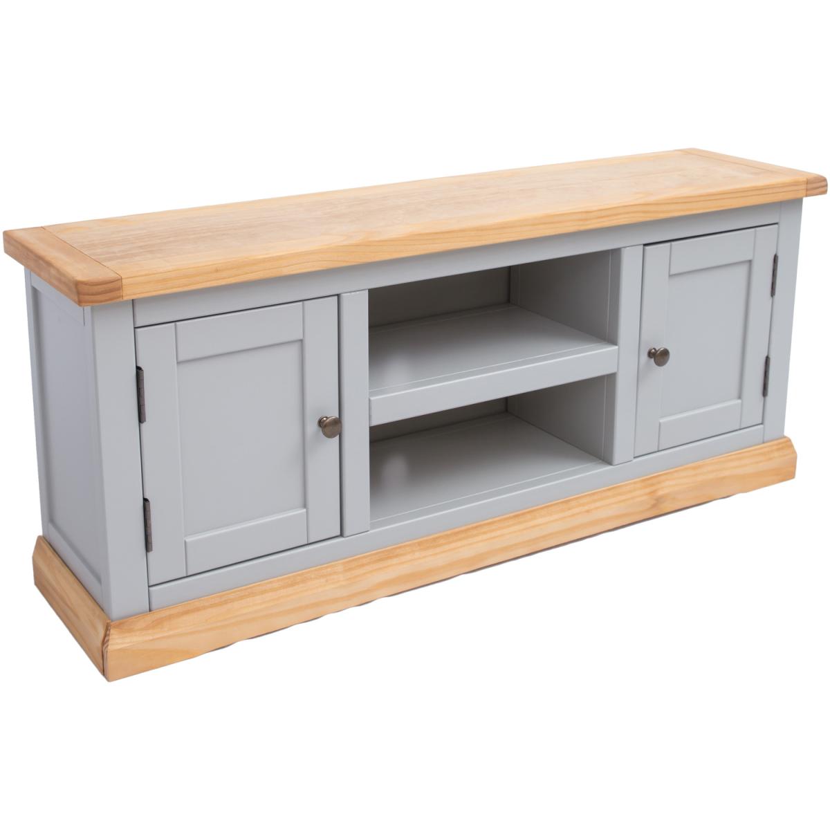 Our Bomporto collection has a simple but pleasing design and is produced by our skilled craftsmen to the highest standards using responsibly sourced wood and veneers. All tops are made using a combination of solid pine wood and veneers and are carefully hand waxed giving them a great look. The body is finished with high-quality eco-friendly water base paint in a light grey colour. This large TV unit has a mixture of storage and open space to house all your TV-related items together. There is plenty of space on top for your TV, in the centre below is an open space divided by a shelf creating two storage areas, easy access for wiring is available through the cable holes on the back of the unit. At either end are cupboards to hide away your games consoles or remotes, or even your snack for halftime! These attributes combined with a simple construction for easy assembly make it a great value product to be taken home today.